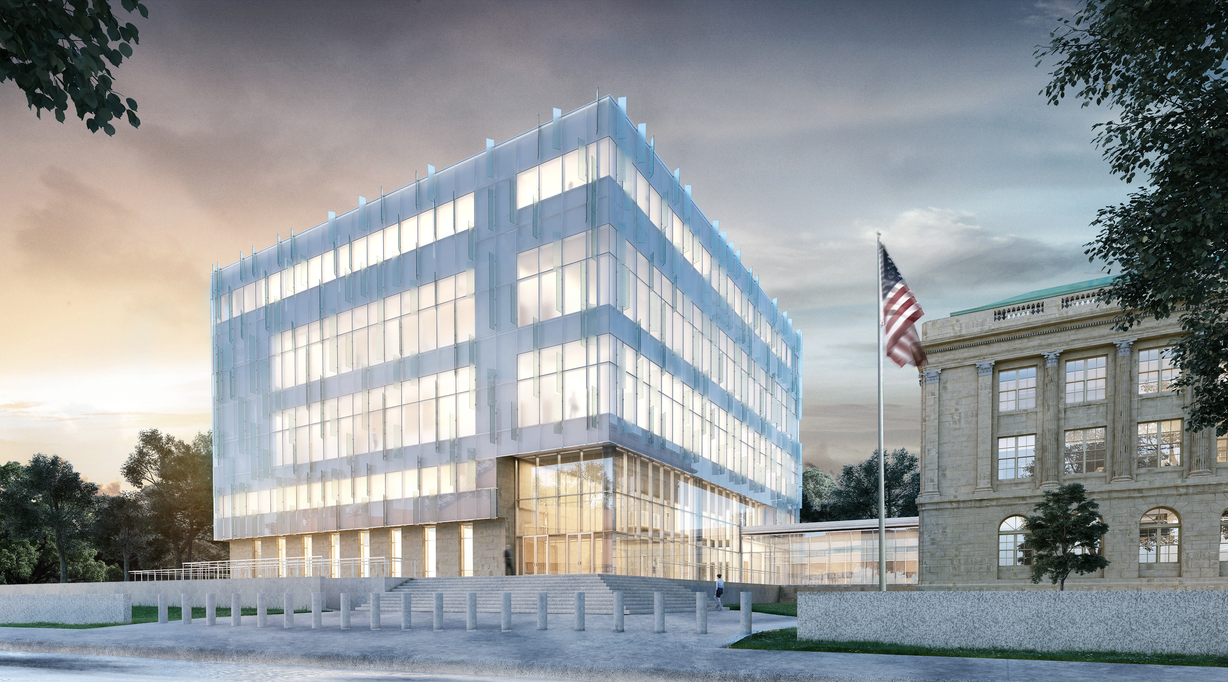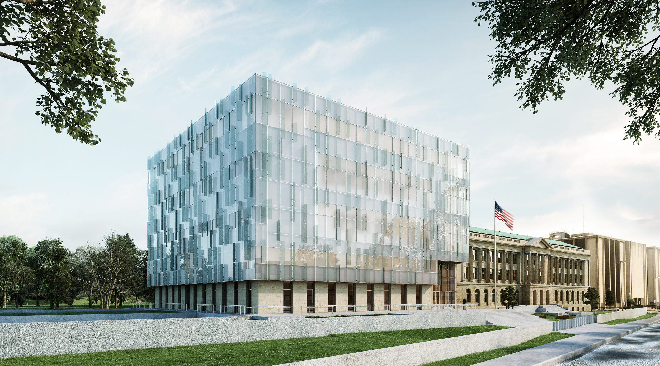 The design requires continued operation of the existing 1930 courthouse until the annex is complete. The addition will contain four new courtrooms, judicial chambers, and U.S. Marshall’s Service operations. When the annex is complete, the existing building will be fully renovated including the restoration of two historic courtrooms. The concept design of the annex features a geometric glass structure that sits atop a raised base. This structure celebrates the glass manufacturing heritage of Toledo, and also maximizes natural daylight, views, and visual connection to the Civic Center Mall.