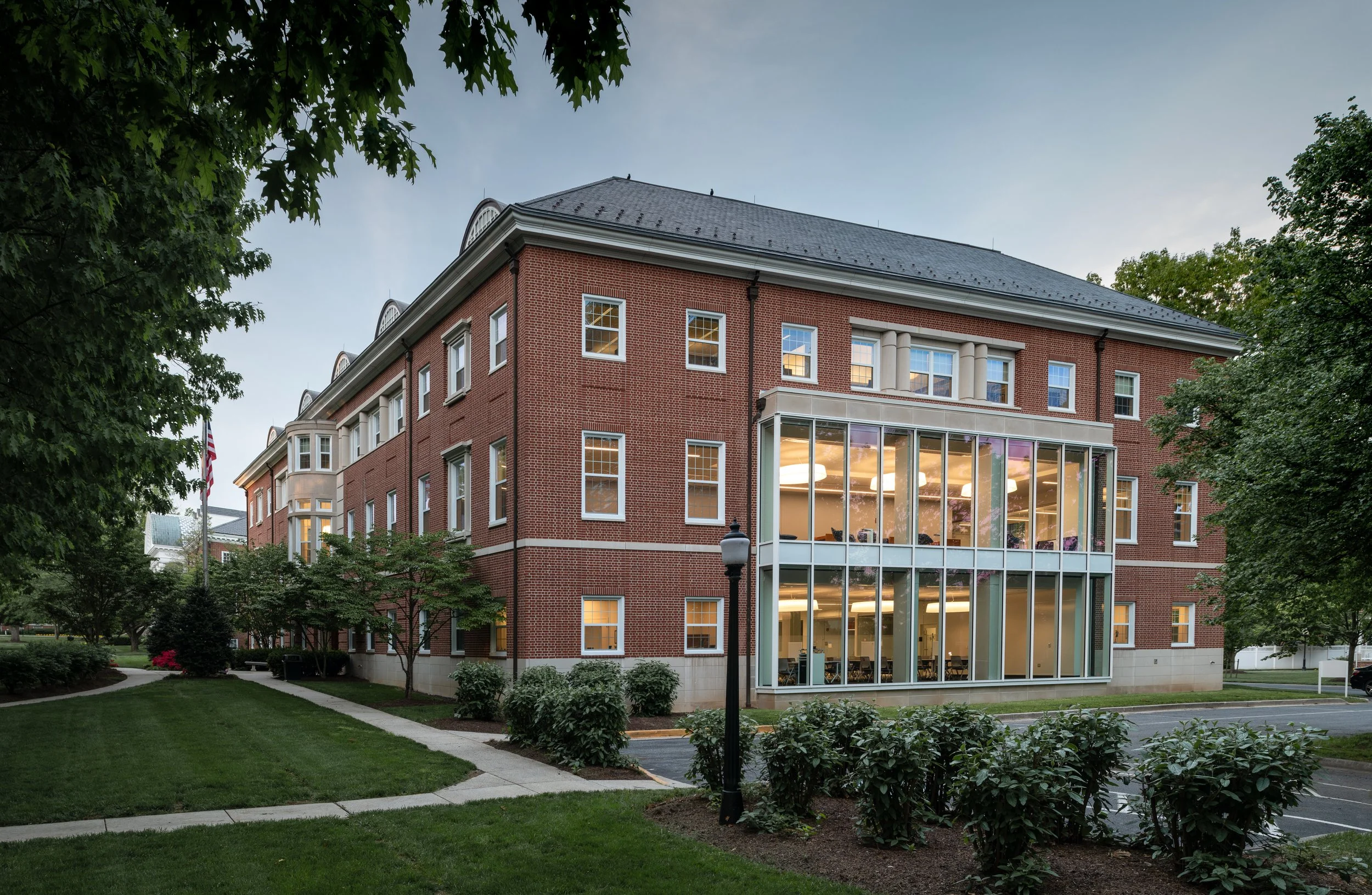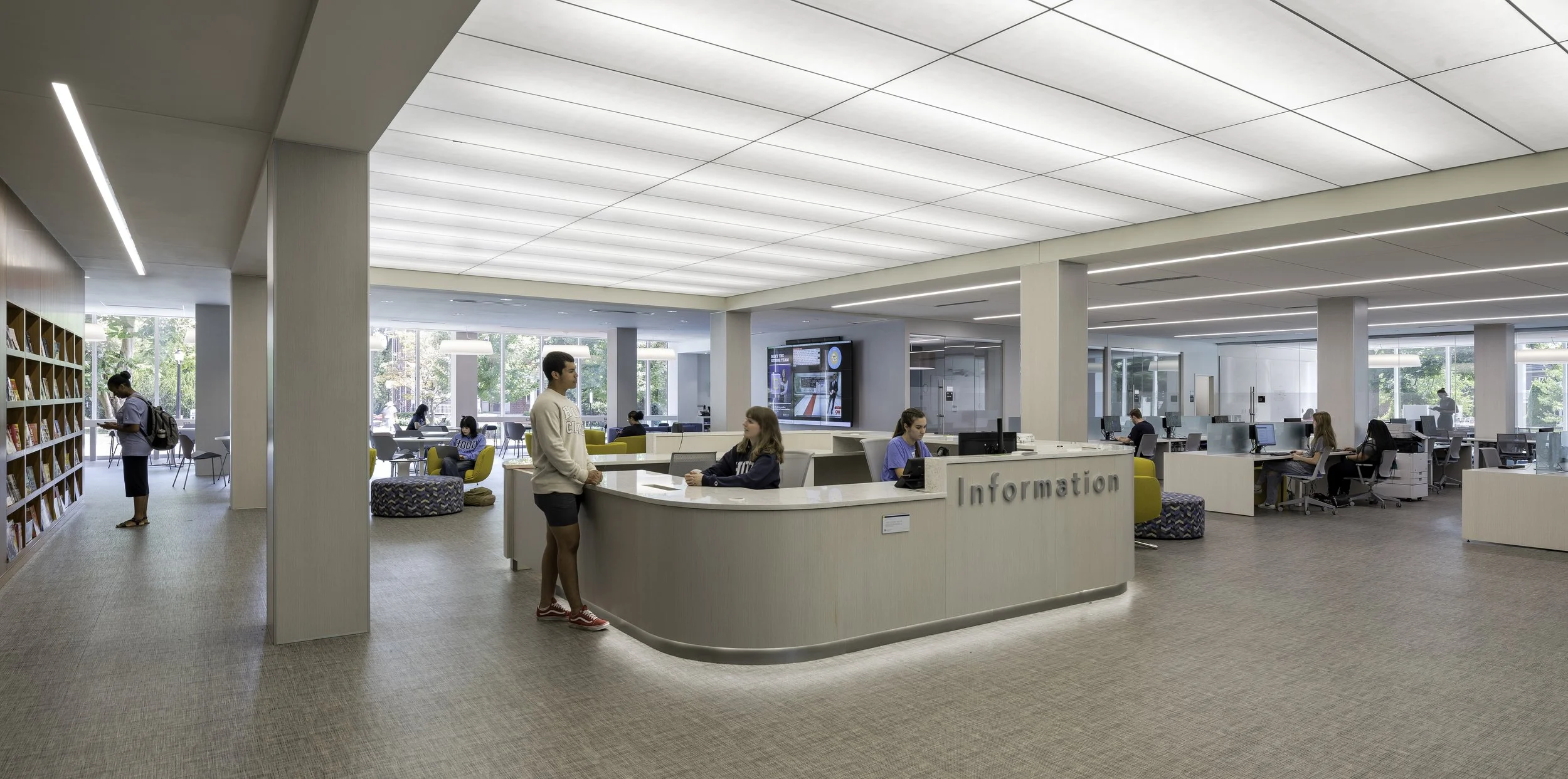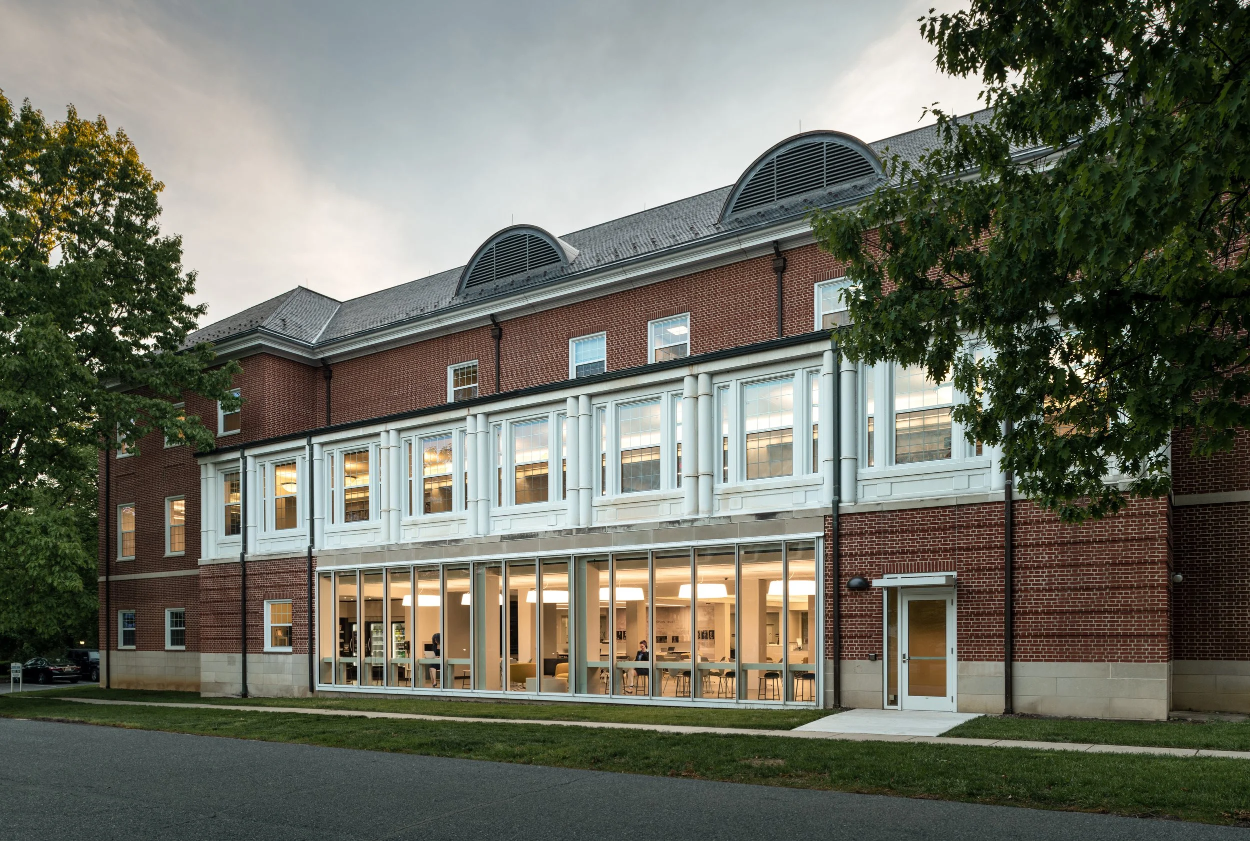 The renovation transformed the library into a Learning Commons model, creating engaging environments for collaboration, evolving technology, instruction, and academic support. It moved the College’s centralized data center from prime real estate on the first floor to a smaller and less visible location, opening up space for a new café and casual study area. The project also relocated and centralized Hood’s special collections and archives, as well as reconfigured the arrangement of staff work spaces to support deeper engagement with faculty and students. Small, punched windows were replaced with expanses of curtainwall glass to maximize views, rebranding the Neo-Georgian library as a new, welcoming hub for the campus community.