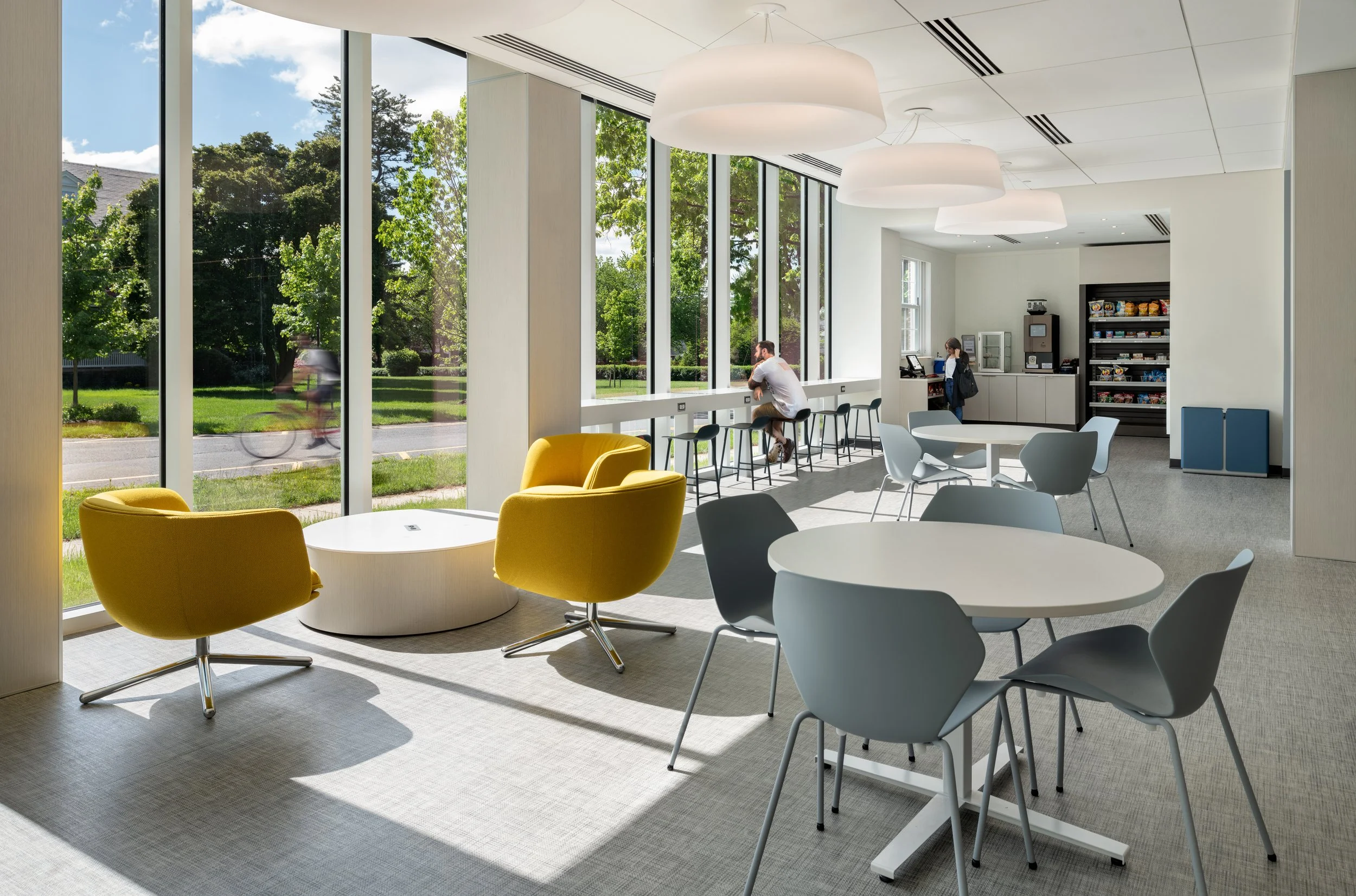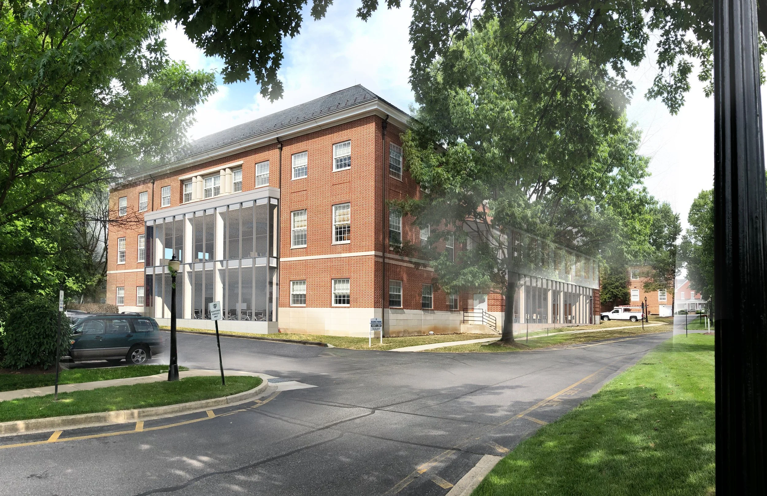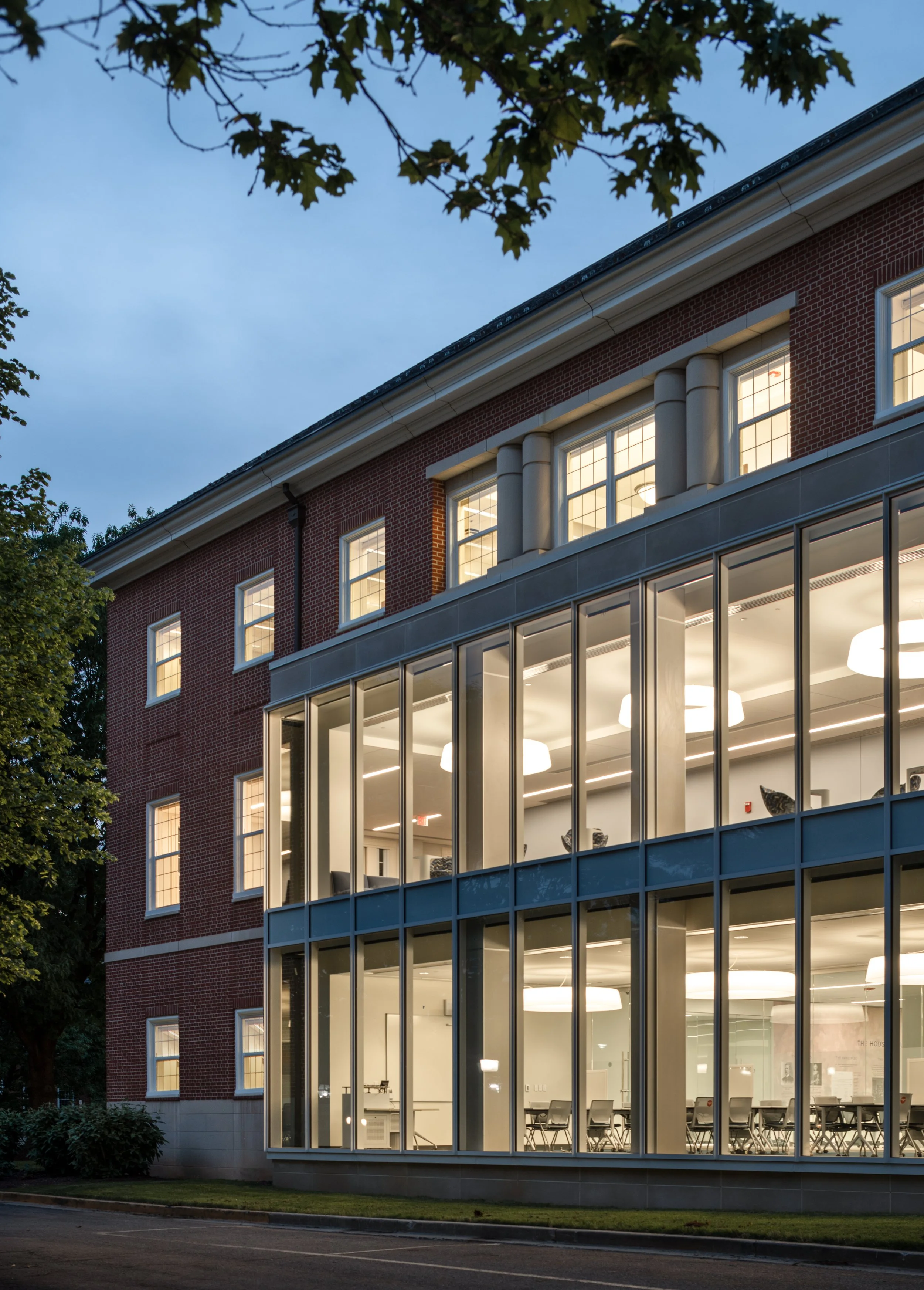 The renovation transformed the library into a Learning Commons model, creating engaging environments for collaboration, evolving technology, instruction, and academic support. It moved the College’s centralized data center from prime real estate on the first floor to a smaller and less visible location, opening up space for a new café and casual study area. The project also relocated and centralized Hood’s special collections and archives, as well as reconfigured the arrangement of staff work spaces to support deeper engagement with faculty and students. Small, punched windows were replaced with expanses of curtainwall glass to maximize views, rebranding the Neo-Georgian library as a new, welcoming hub for the campus community.