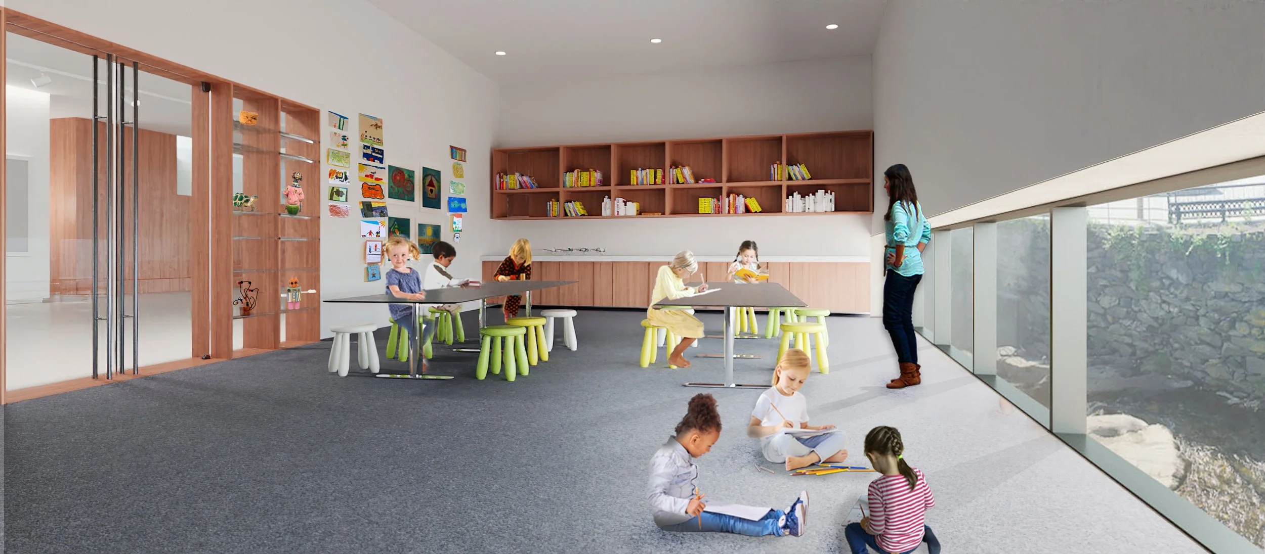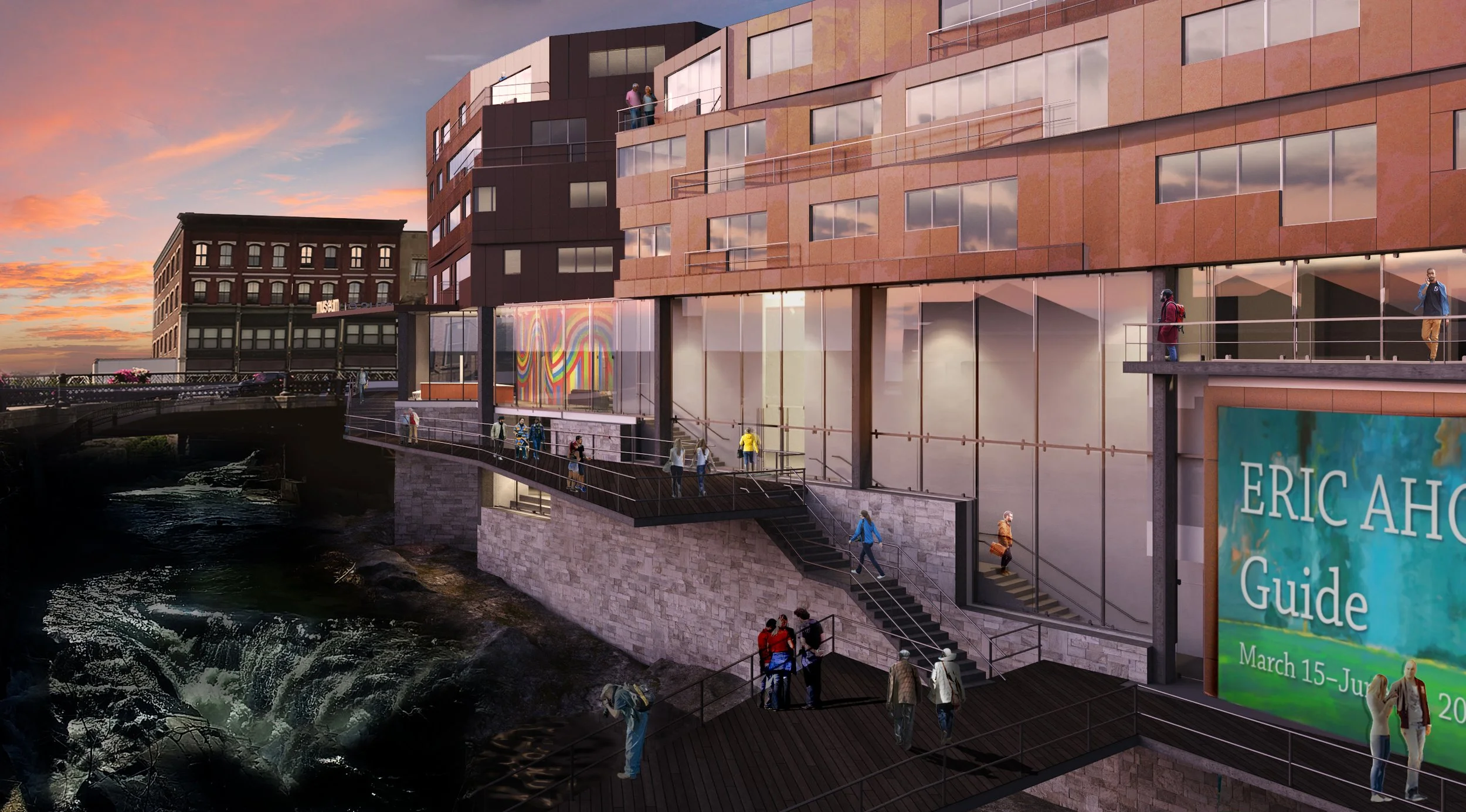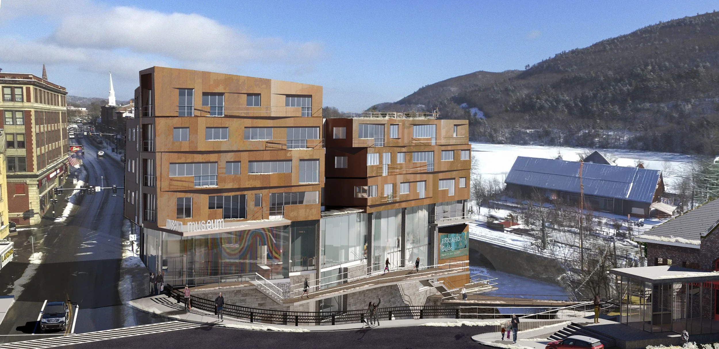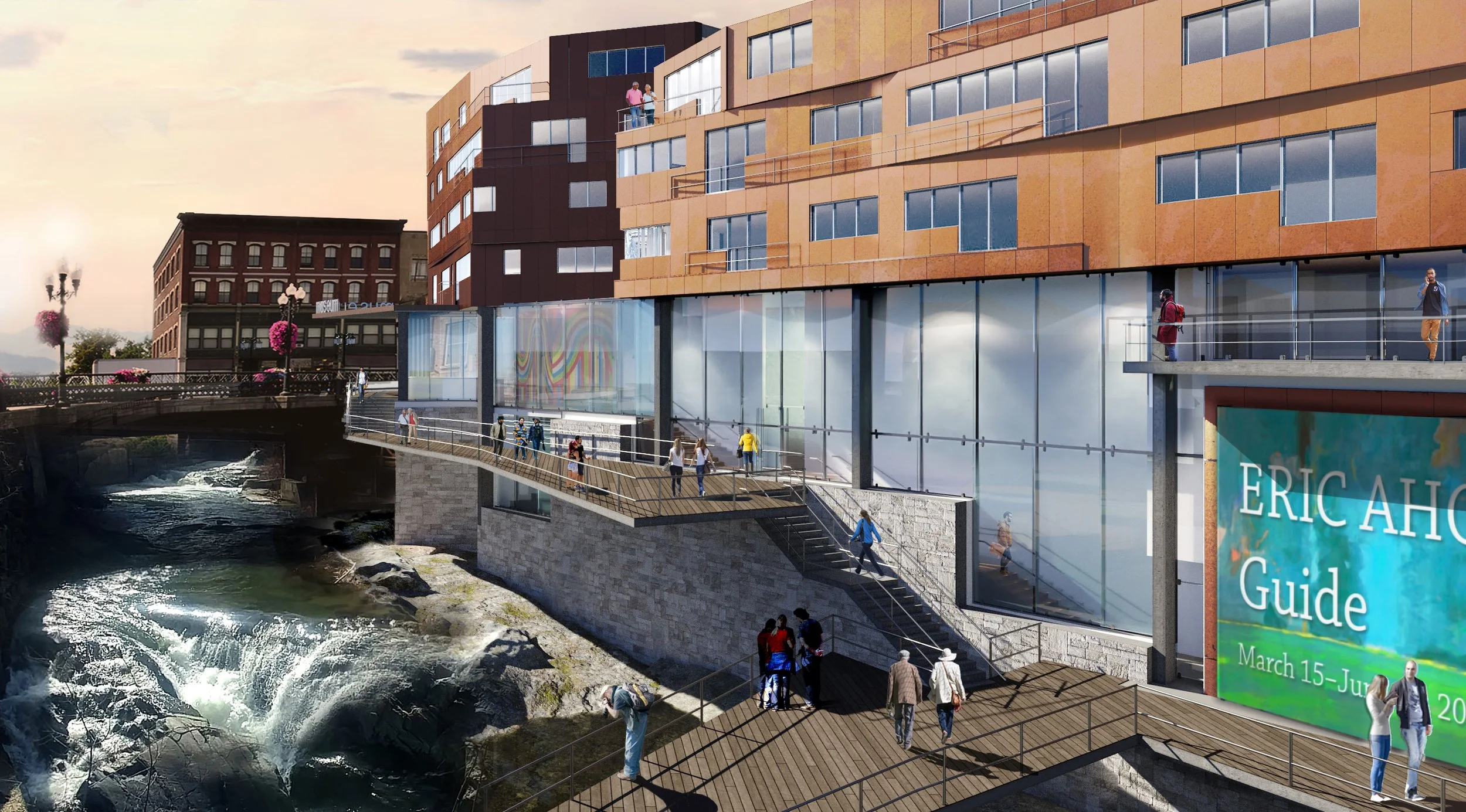 The new BMAC, overlooking the Whetstone Brook waterfall off Main Street, includes museum facilities at street level and on the two floors underneath adjacent to the Whetstone, and would have apartments on the top four floors. The building program includes 5,500 SF of galleries, a 2,500 SF education center with classrooms; a café; a sculpture garden on the roof; a kayak launch and a footbridge connecting Main Street to the Connecticut River and local Amtrak Station.