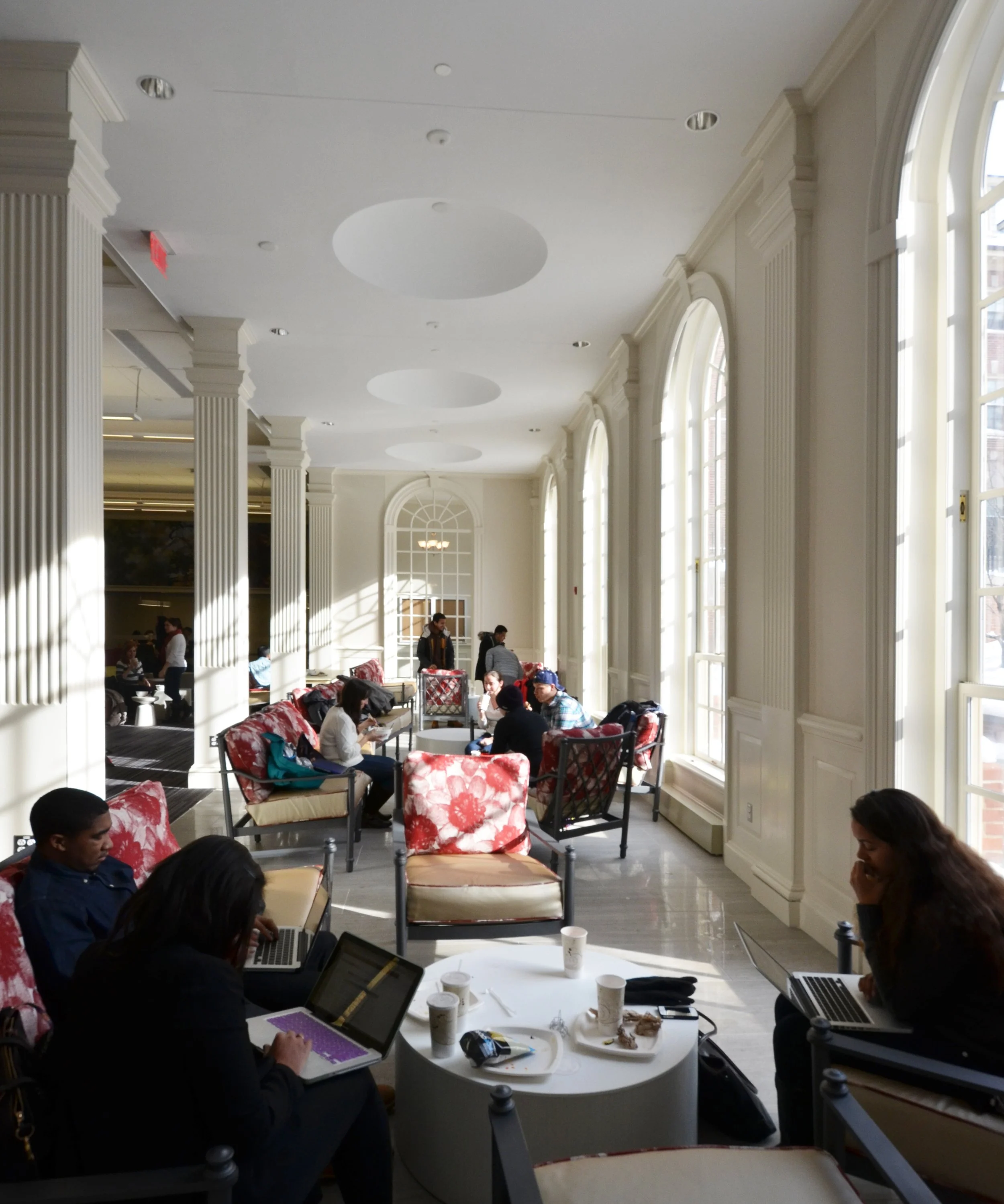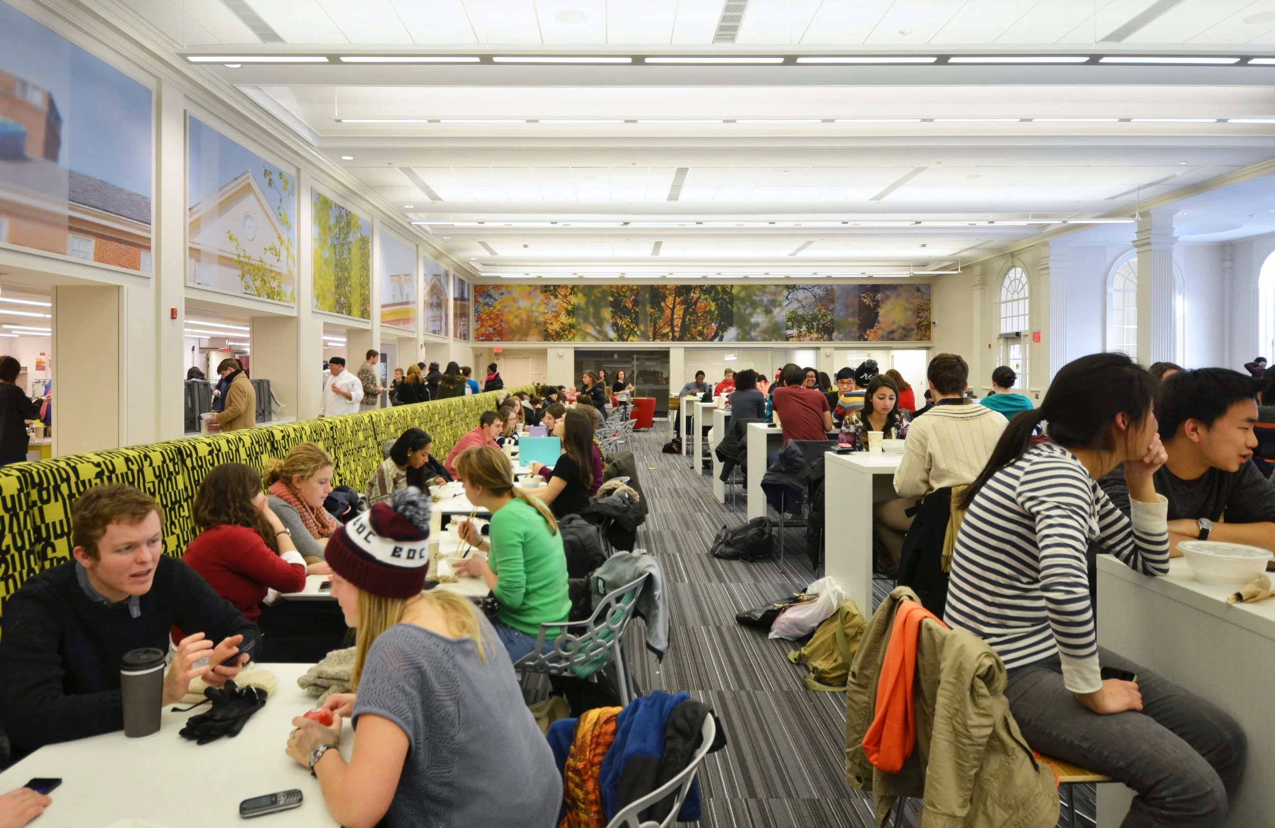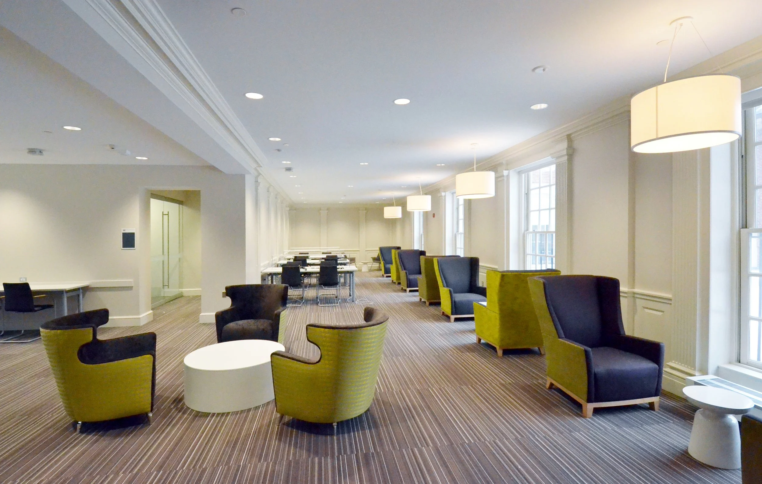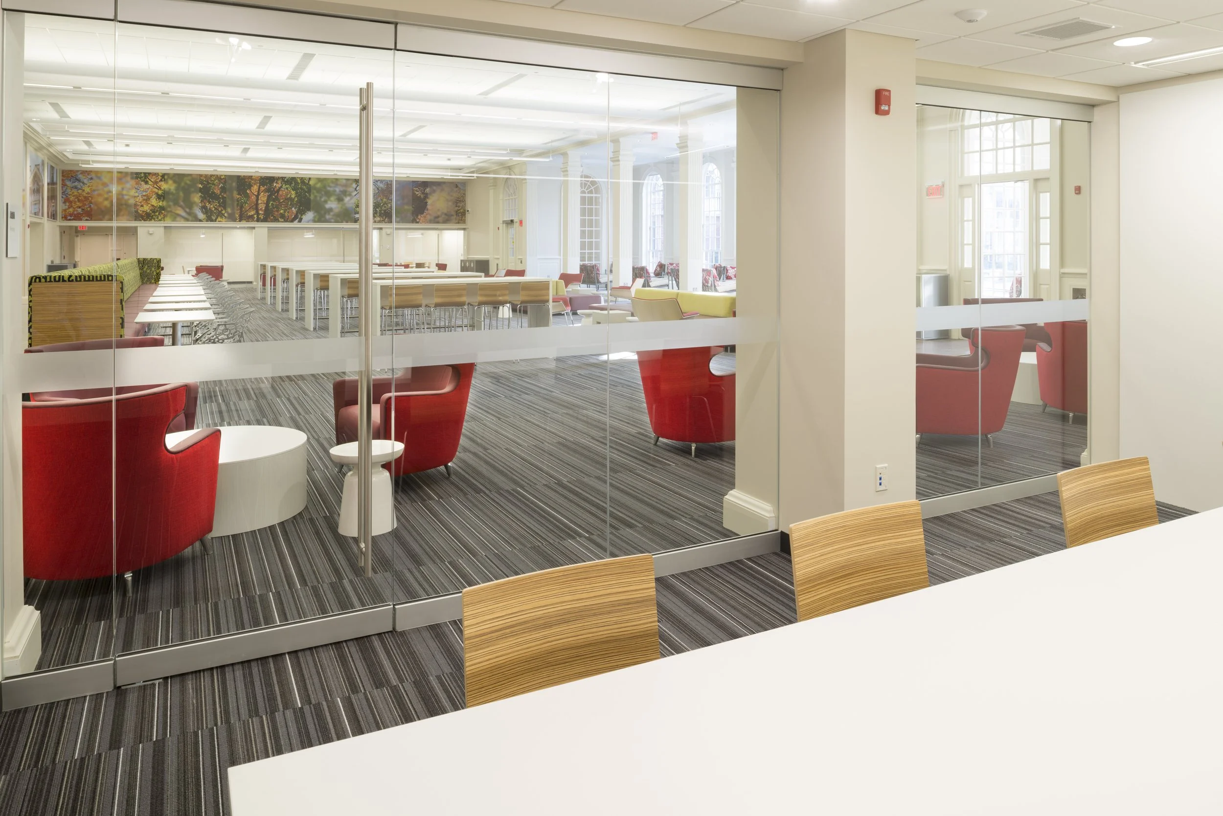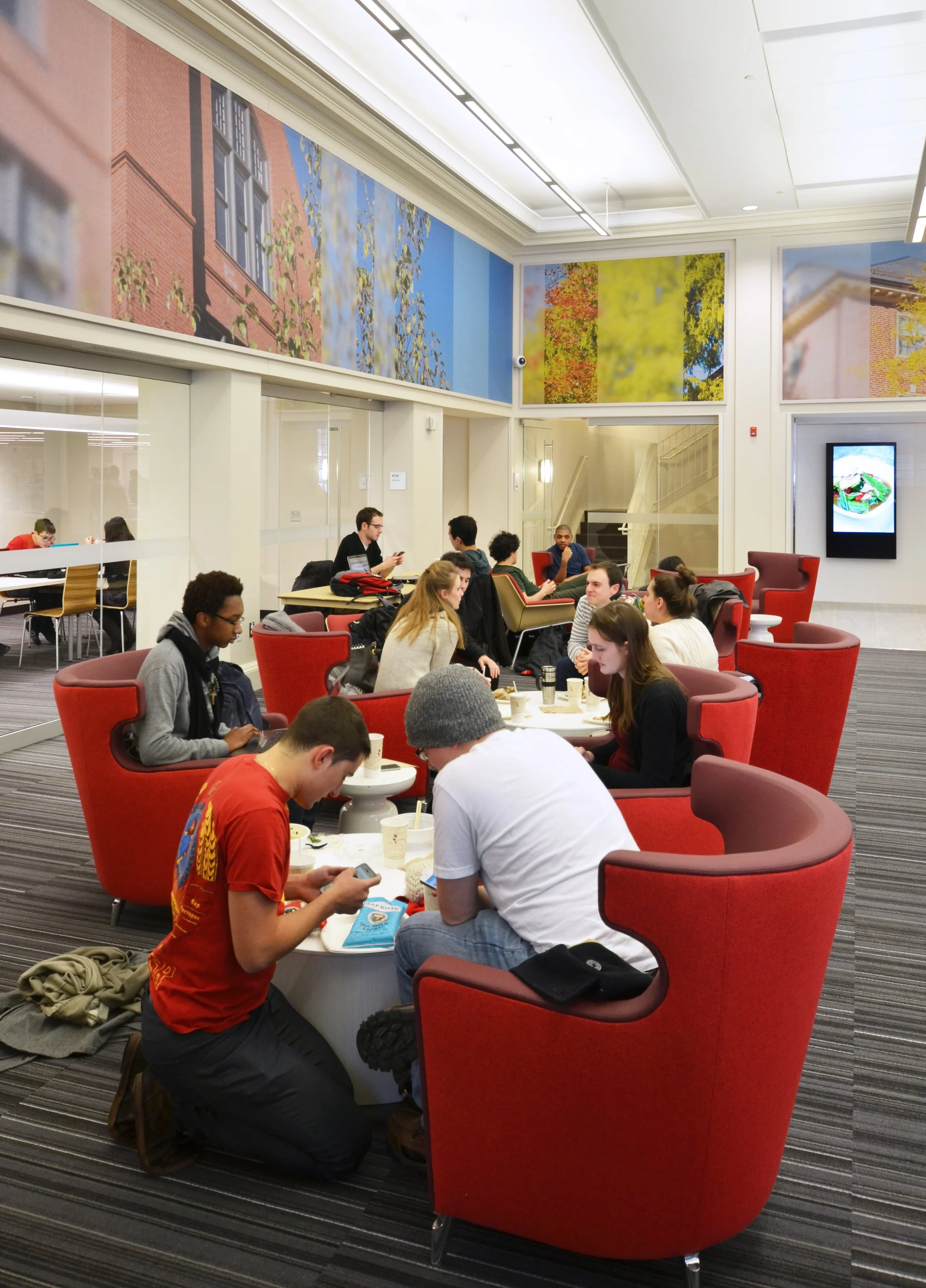 Andrews Commons is the new communal heart of Brown’s Pembroke Campus, and provides a central place for undergraduate students to eat, socialize and study. It is the second of Schwartz/Silver’s student life projects at Brown University, following the opening of the Stephen Robert Campus Center. The Commons includes a new food servery, large central commons space, meeting rooms, a seminar room, a 24-hour study center, and outdoor dining spaces. The main level has seating for 200 at various dining tables and lounge areas and glass-walled meeting rooms offer small group study and social spaces. The upper level includes a 24-hour study center facing an outdoor terrace with seating around a large gas “fire-pit.”