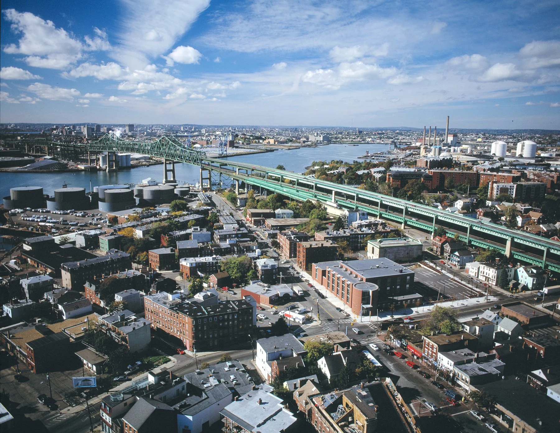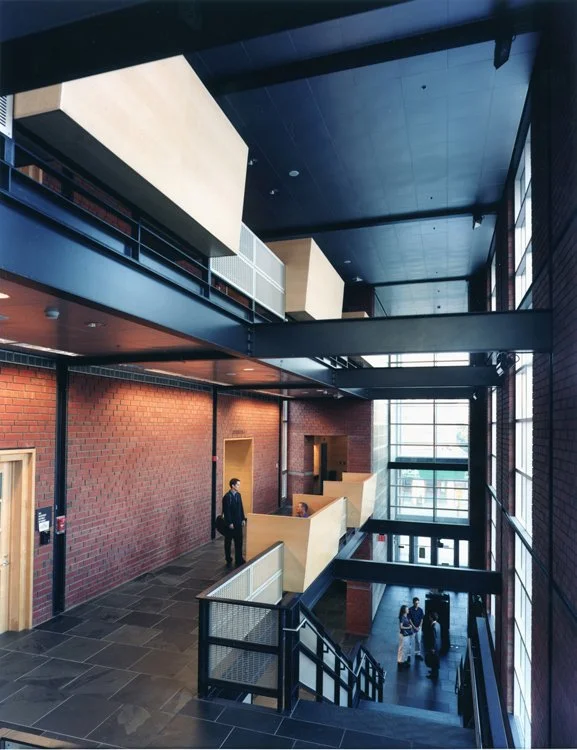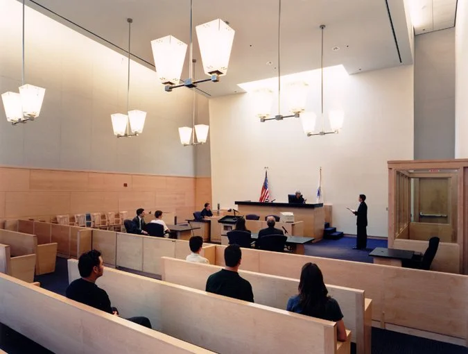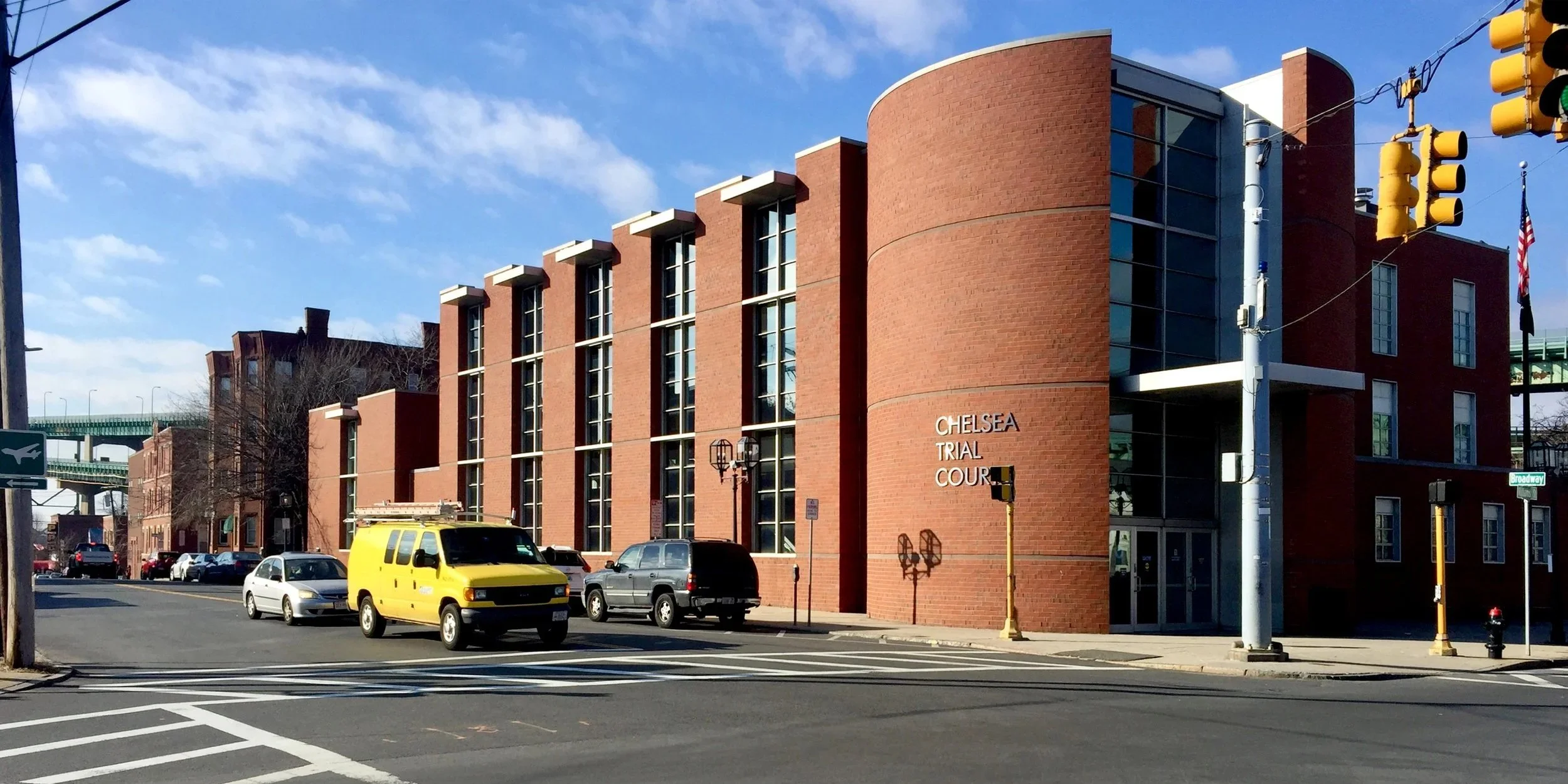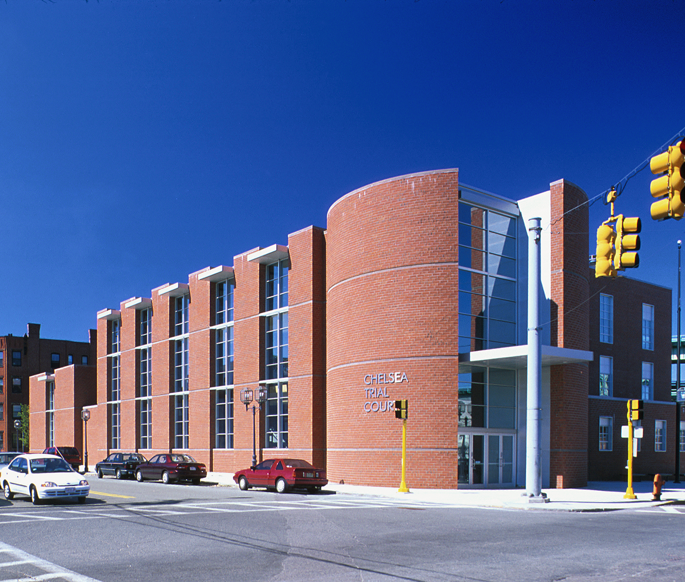 The city of Chelsea has suffered devastating fires and industrial decline, and this new courthouse was designed to reinforce the remaining fabric of the urban center. The entrance, visible from one end of an elongated open space, is contained inside a massive cylindrical tower; inside the building, running the length of its south façade, is a grand lobby and the main courtroom. Four smaller courtrooms are on the upper floors.