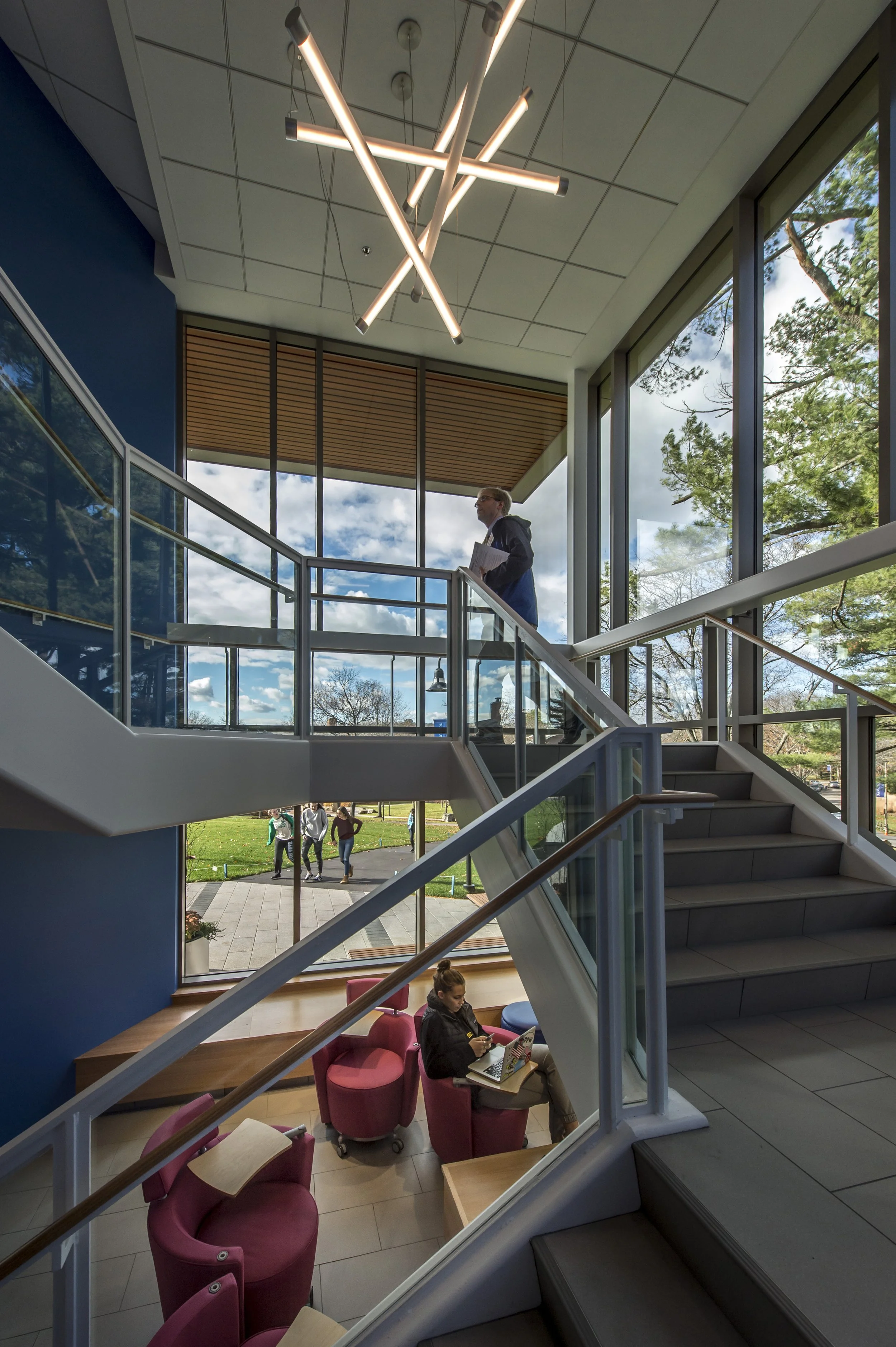 Two changes drove the design. On the exterior, low overhanging concrete “brows” were removed, opening the building to light and views, and improved energy efficiency with new insulated glazing. On the inside, by reorienting stairs, the circulation path was reduced, freeing space for a new student lounge.