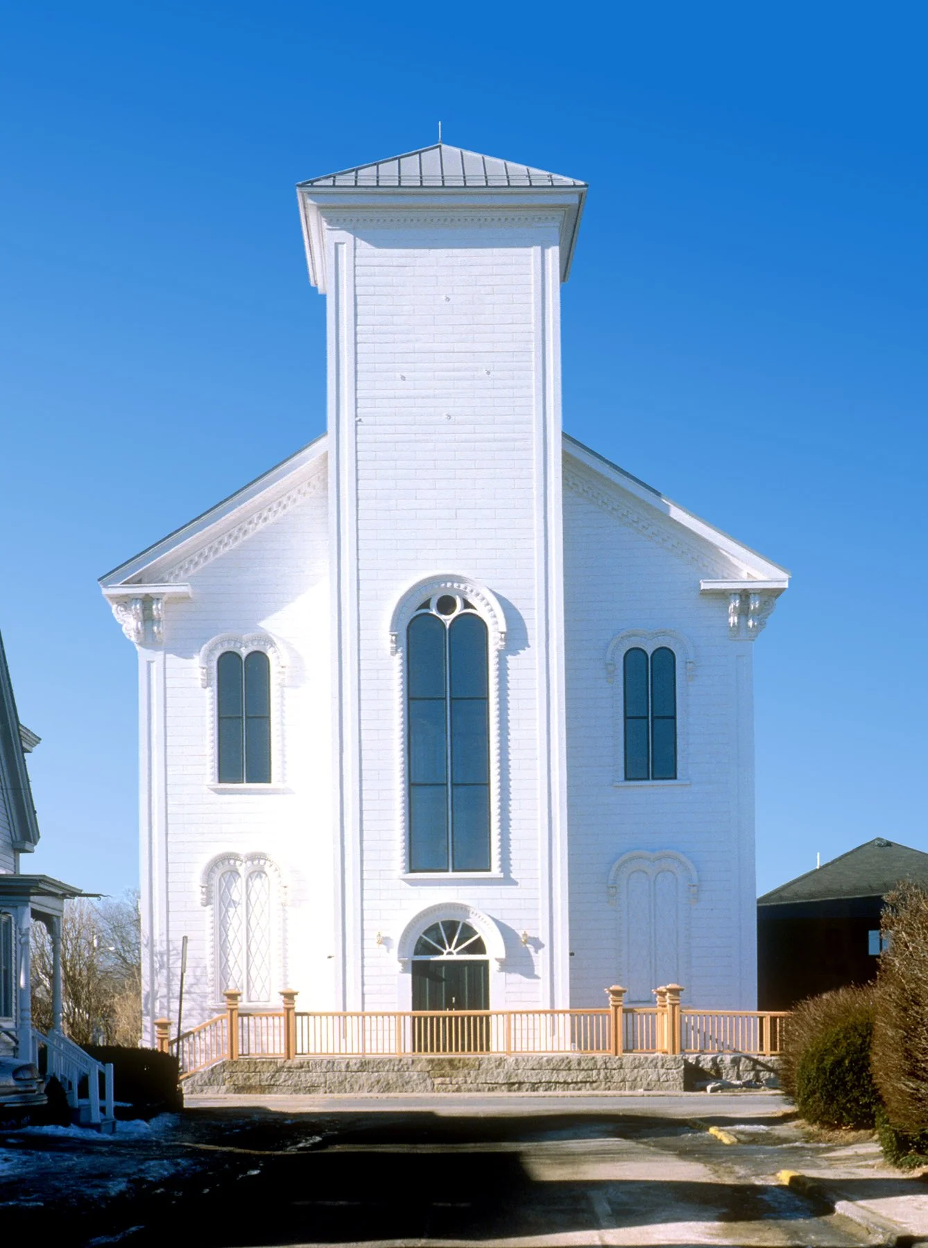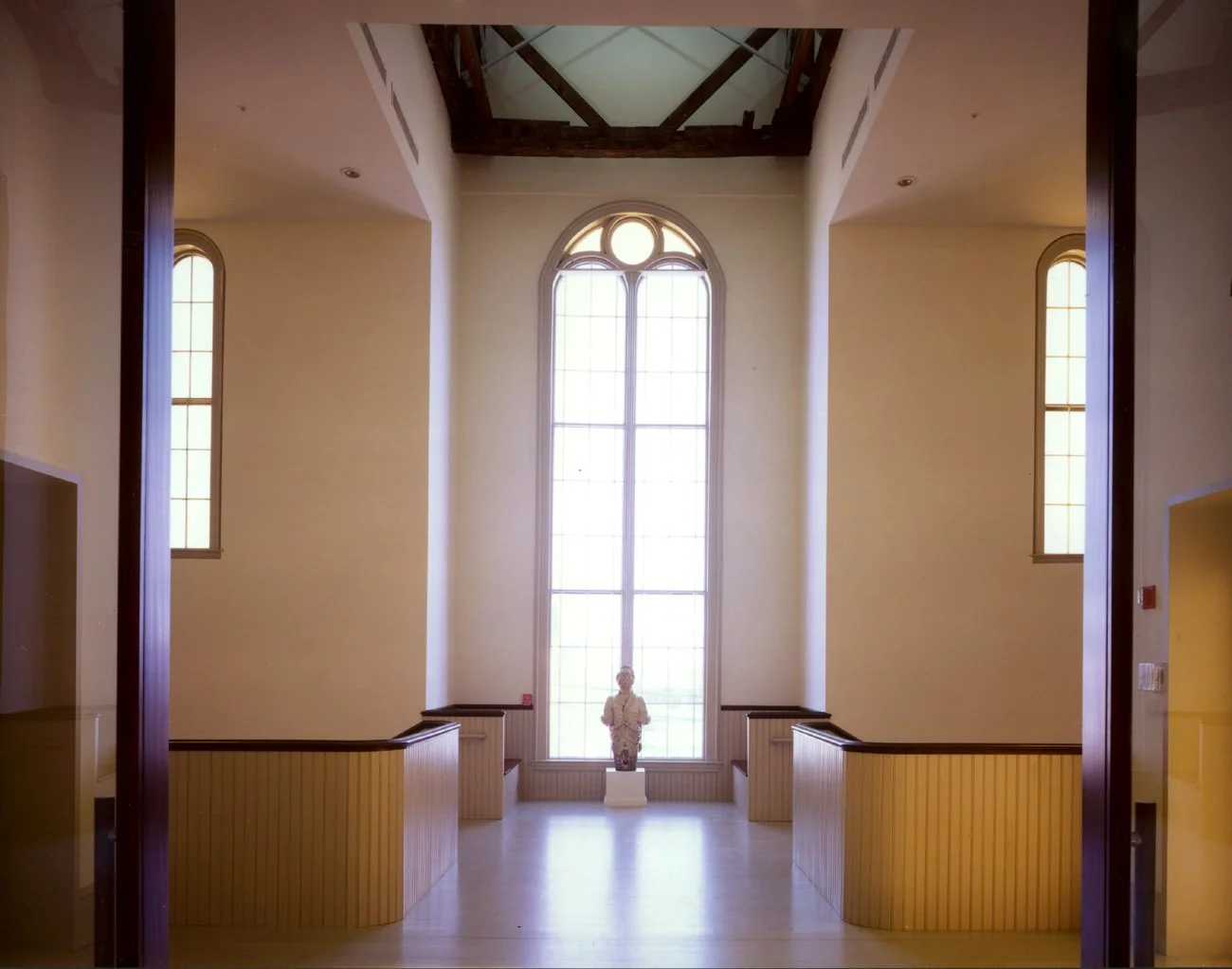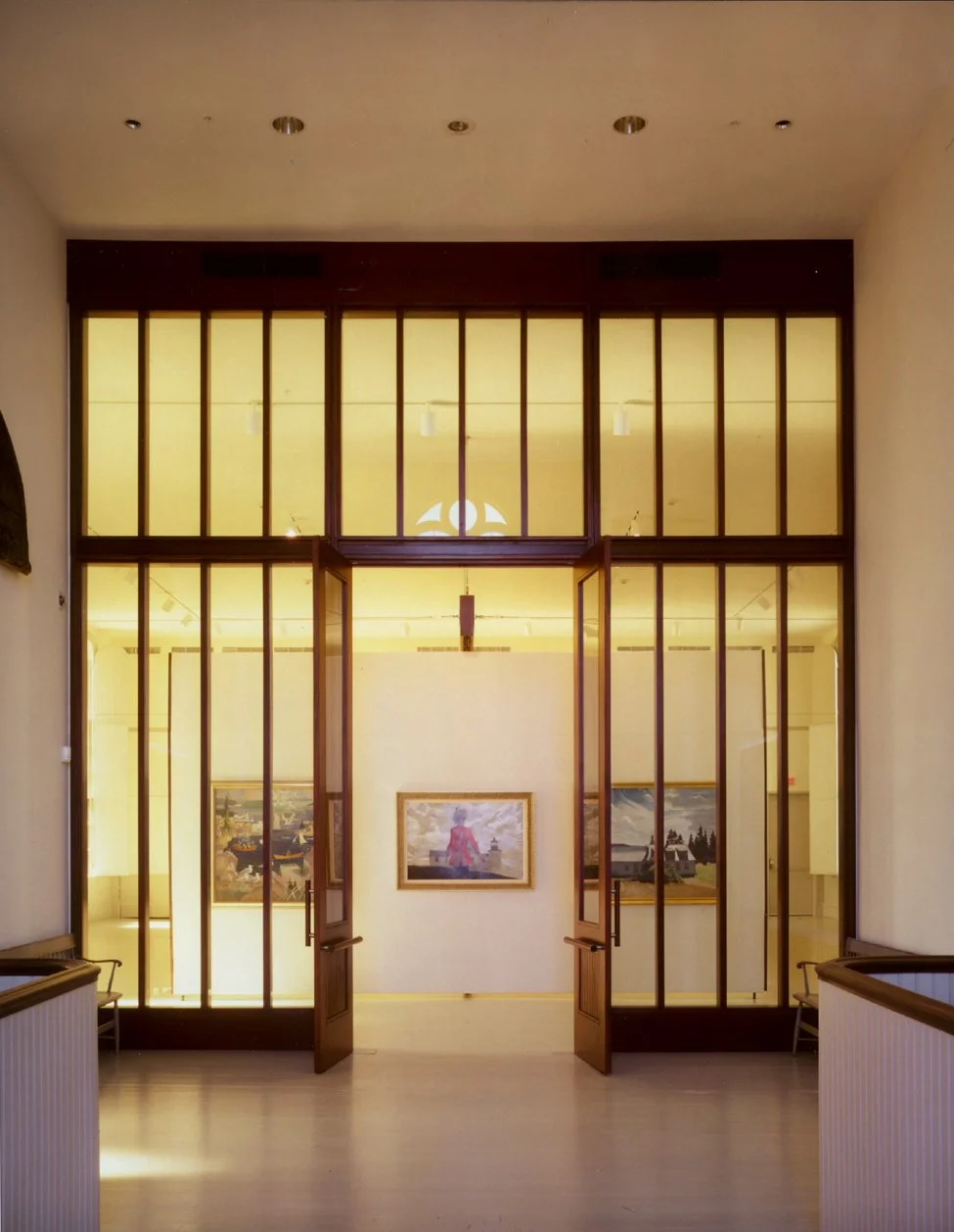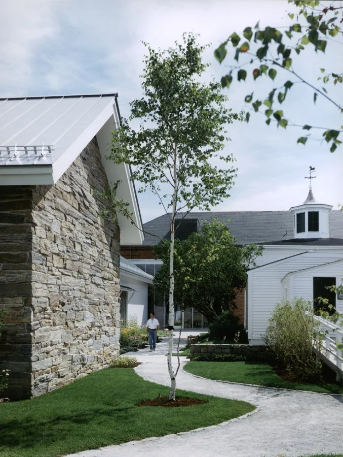 The Farnsworth Art Museum consists of a variety of buildings, including some historic structures. Schwartz/Silver reconfigured these buildings into a coherent landscaped campus. Parking was organized into a single lot along the side of the site, and facing it is a new, clearly identifiable, glass and steel entrance lobby. The lobby stands between the original main building of the museum and a new building designed in a contrasting vernacular style. This houses a new gallery and a study center, with an attached stone storage building. Across the street at the end of the campus is a former church acquired by the museum and converted, on the suggestion of the Wyeth family, into the galleries that display their work.