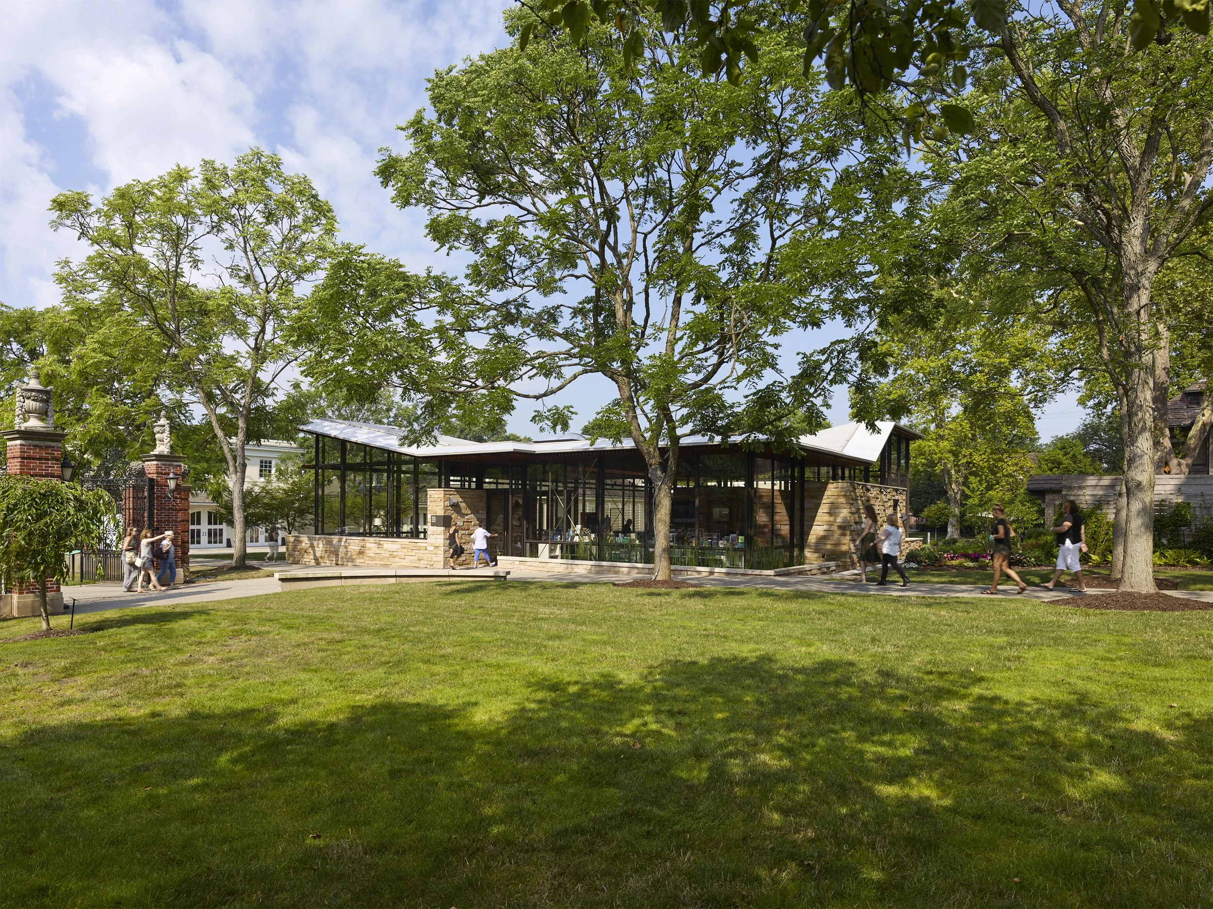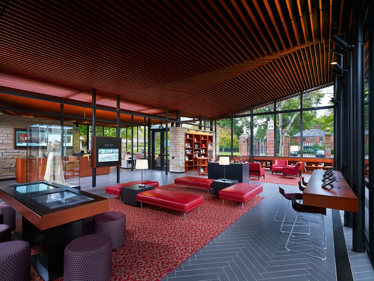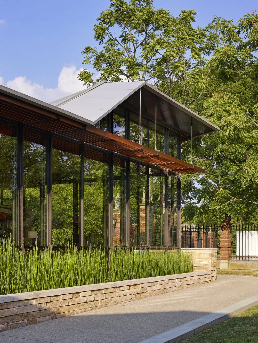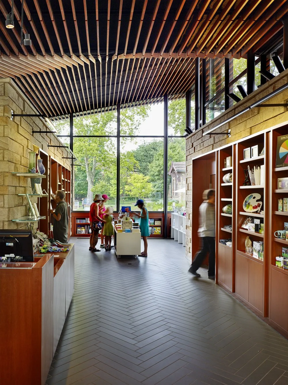 The Frick Art & Historical Center houses the estate Henry Clay Frick and his family occupied in Pittsburgh for more than two decades before they moved to NYC in the early 20th century. Schwartz/Silver’s projects for The Frick Pittsburgh include the Grable Visitor Center; the Education and Community Centers; and expansion of the Car and Carriage Gallery. The Visitor Center is a glass-walled, 3000 sf building that provides a gathering point for tours, interactive displays for exploring the Frick and its collections, as well as visitor amenities such as the Museum Store and learning lounge. The building’s roof changes in pitch to reflect the shifting scale of buildings on campus, while the herringbone flooring and cherry wood ceiling reference materials from Clayton, the museum’s historic estate.