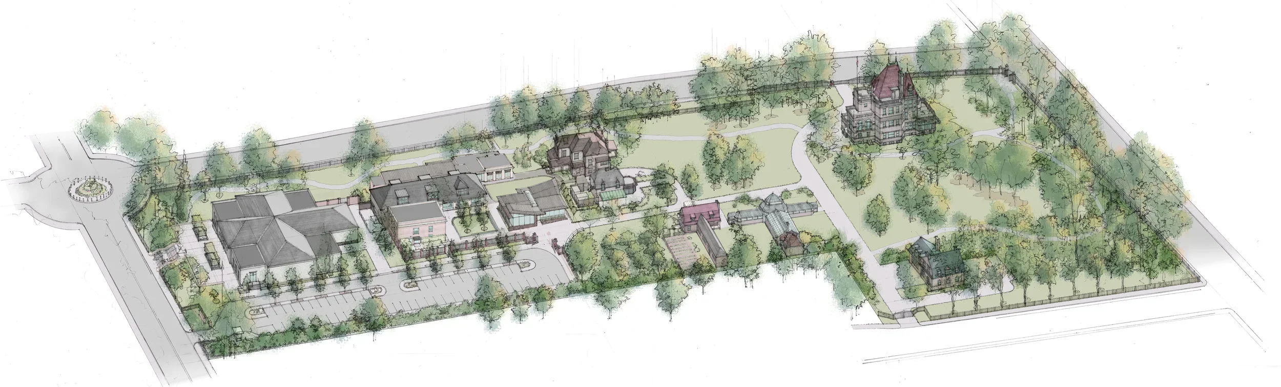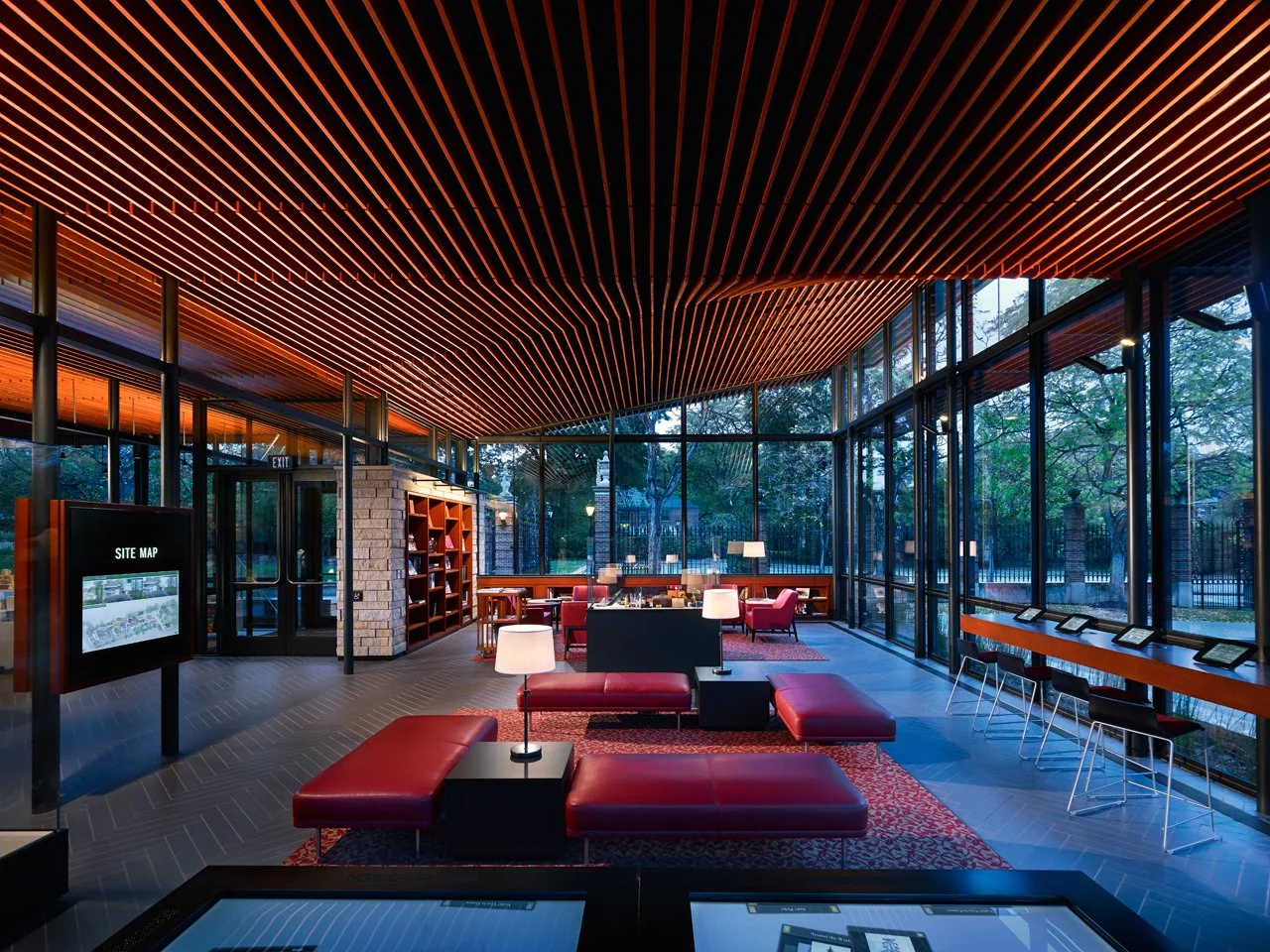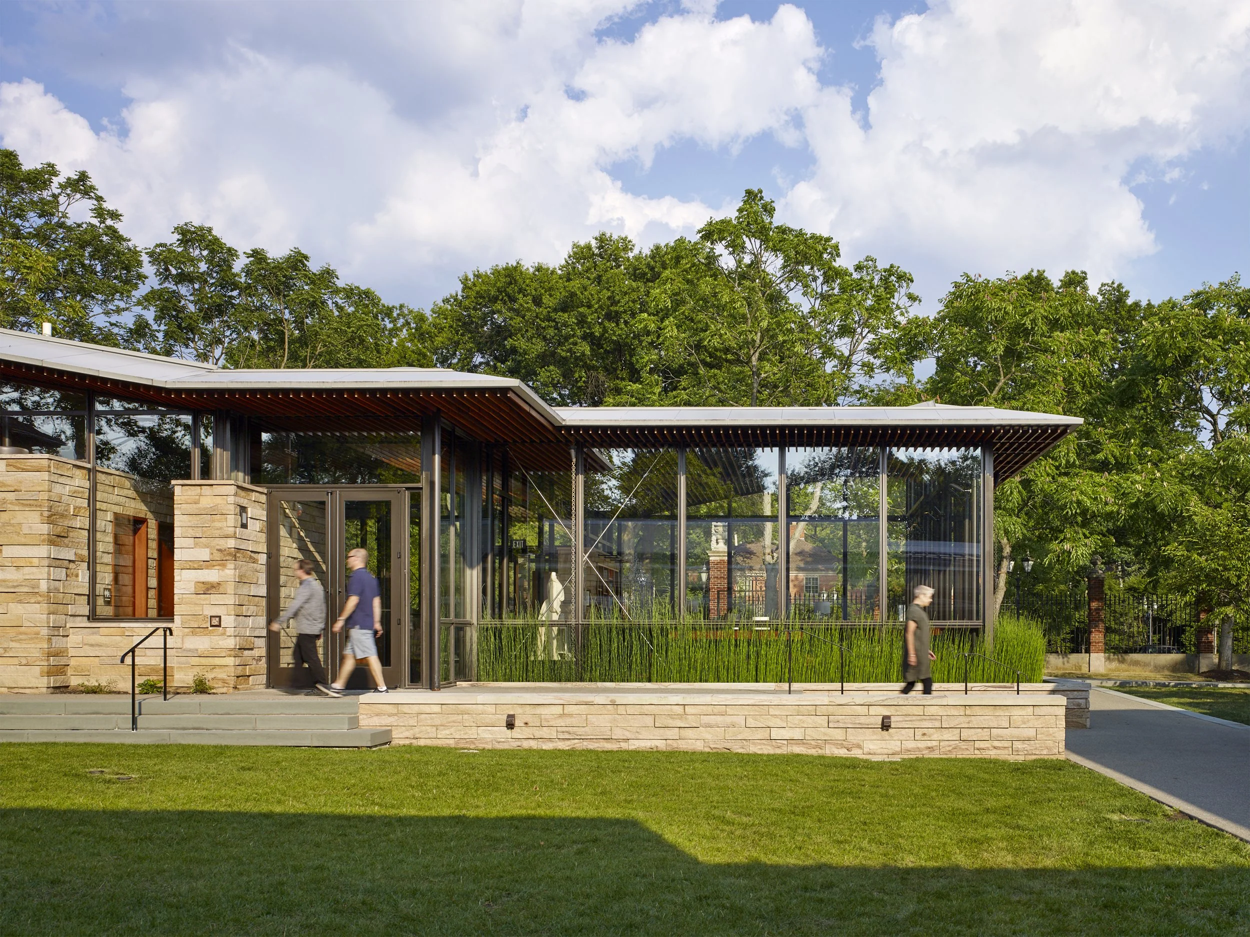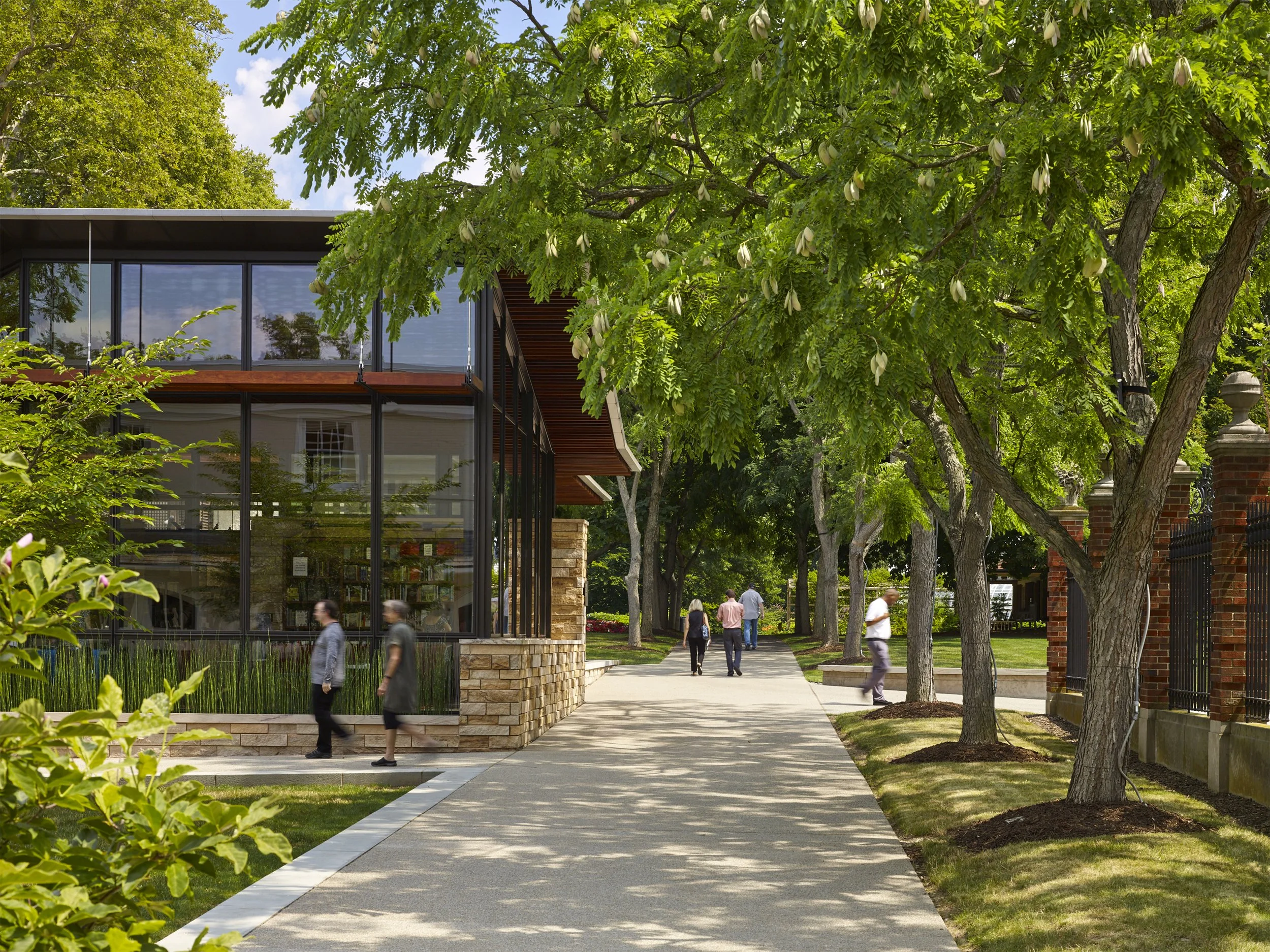 The Frick Art & Historical Center houses the estate Henry Clay Frick and his family occupied in Pittsburgh for more than two decades before they moved to NYC in the early 20th century. Schwartz/Silver’s projects for The Frick Pittsburgh include the Grable Visitor Center; the Education and Community Centers; and expansion of the Car and Carriage Gallery. The Visitor Center is a glass-walled, 3000 sf building that provides a gathering point for tours, interactive displays for exploring the Frick and its collections, as well as visitor amenities such as the Museum Store and learning lounge. The building’s roof changes in pitch to reflect the shifting scale of buildings on campus, while the herringbone flooring and cherry wood ceiling reference materials from Clayton, the museum’s historic estate.