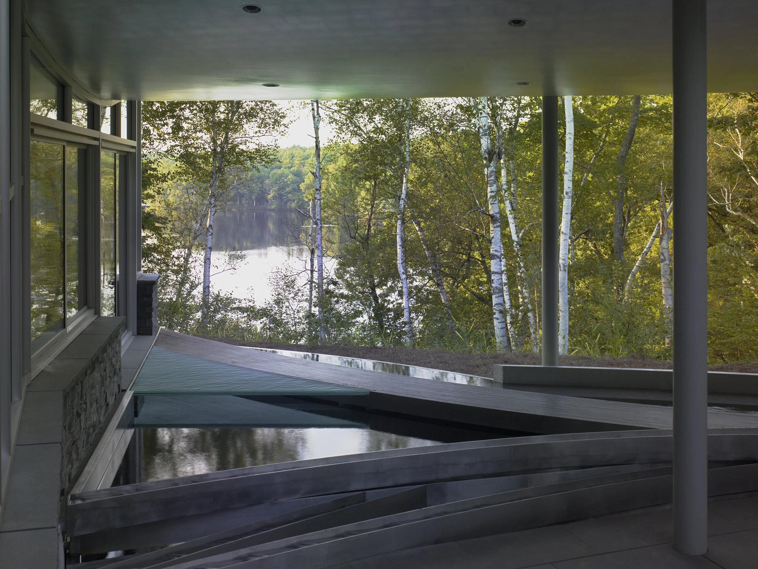 For this sculptural home on a quiet pond outside Boston, it was the clients’ priority to preserve the natural attributes of the existing landscape: rolling topography, mature trees, and ground cover. The five-acre site is characterized by a dramatic 70-foot drop to the adjacent pond. Designed as a spiral form, the house wraps around an internal courtyard, flowing from the low point of the site up towards the crest of the hill. The end of the spiral floats free of the ground, terminating in a cantilever marking the entry.