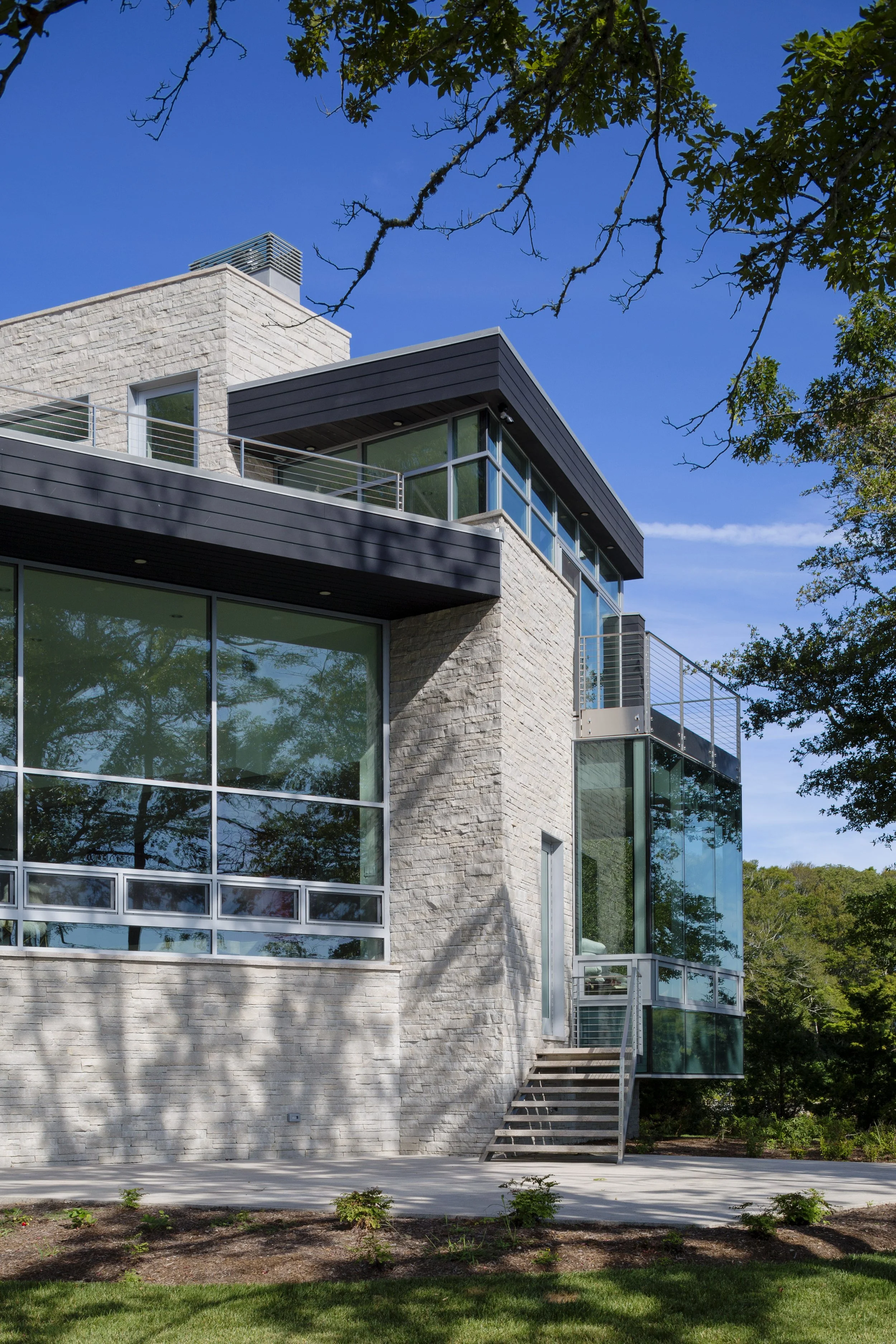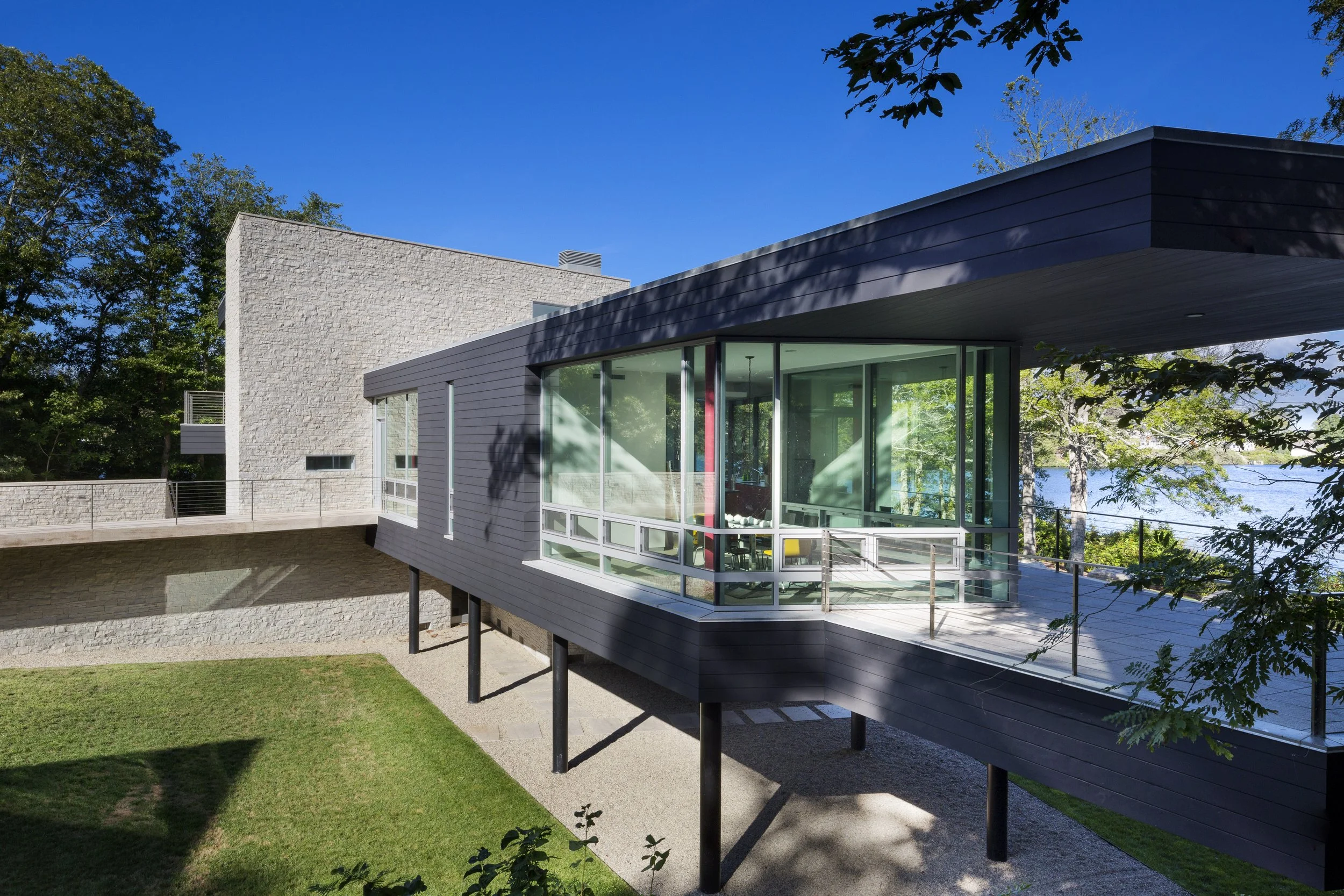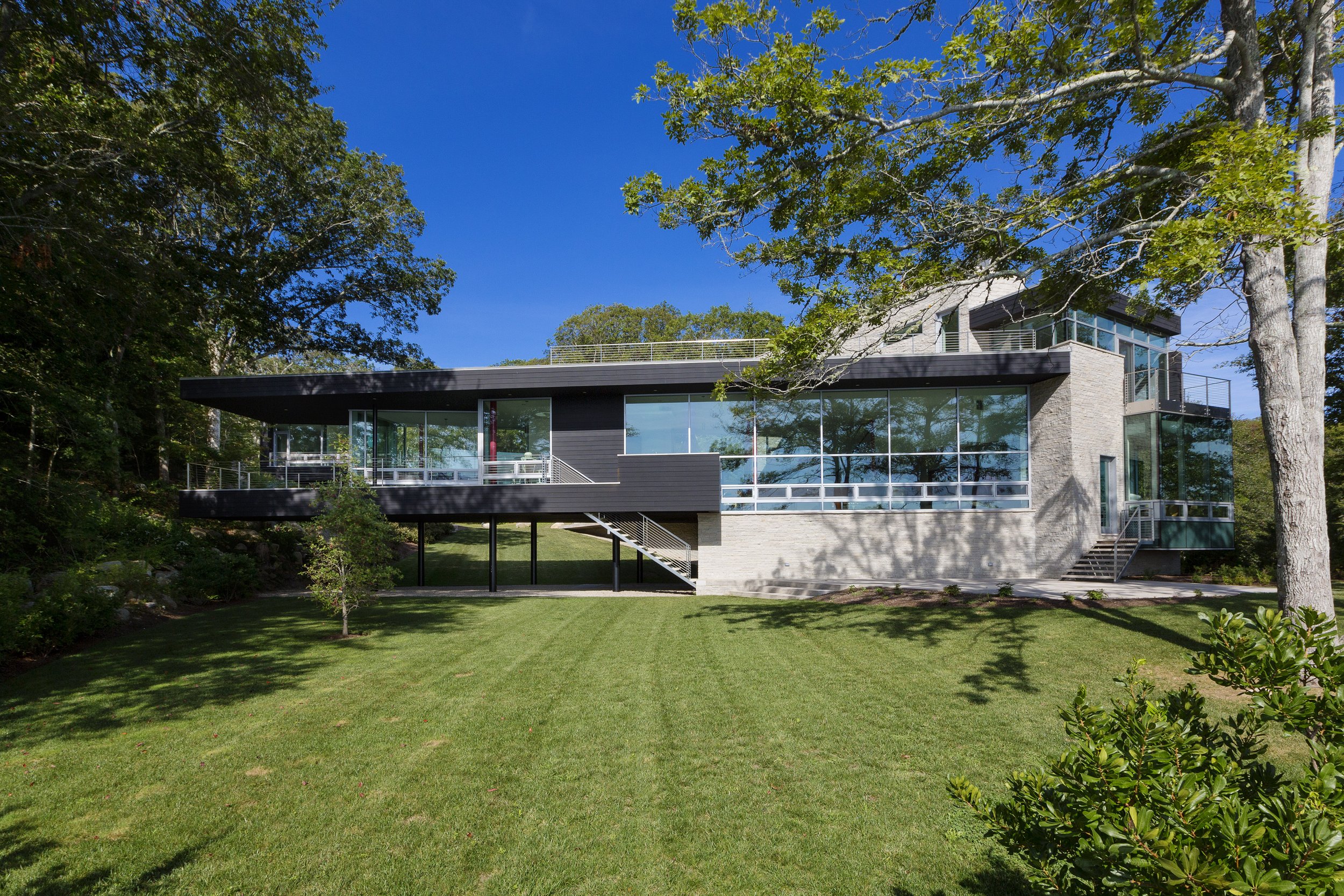 Two structures - a main house and a guest house - command a brackish pond with an outlet to the ocean. The main house is anchored at its north, grounding the building and allowing the south end to “float” above the landscape. The structure’s shifting geometry and angled walls create a small courtyard with the cantilevered guest house further inland. Both structures are clad in natural wood, stone, and glass.
