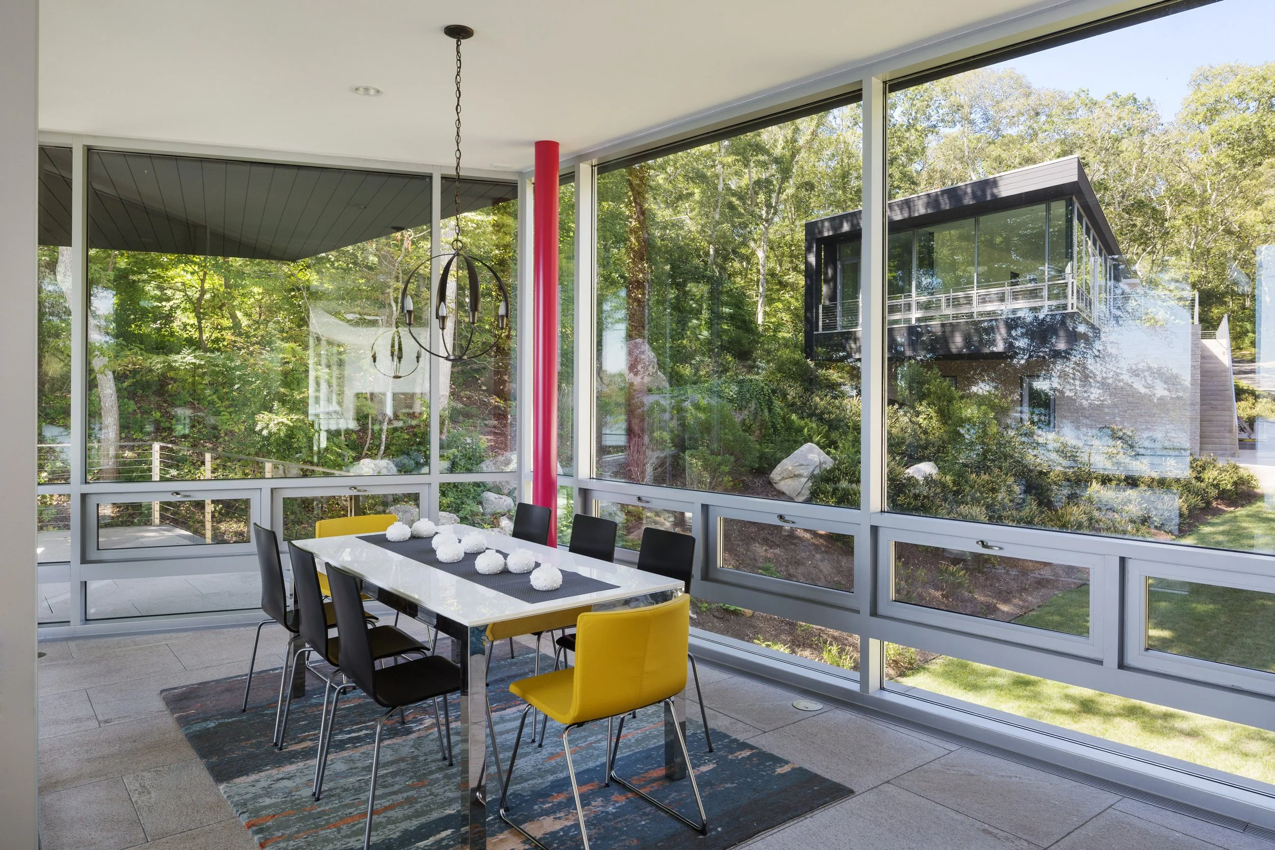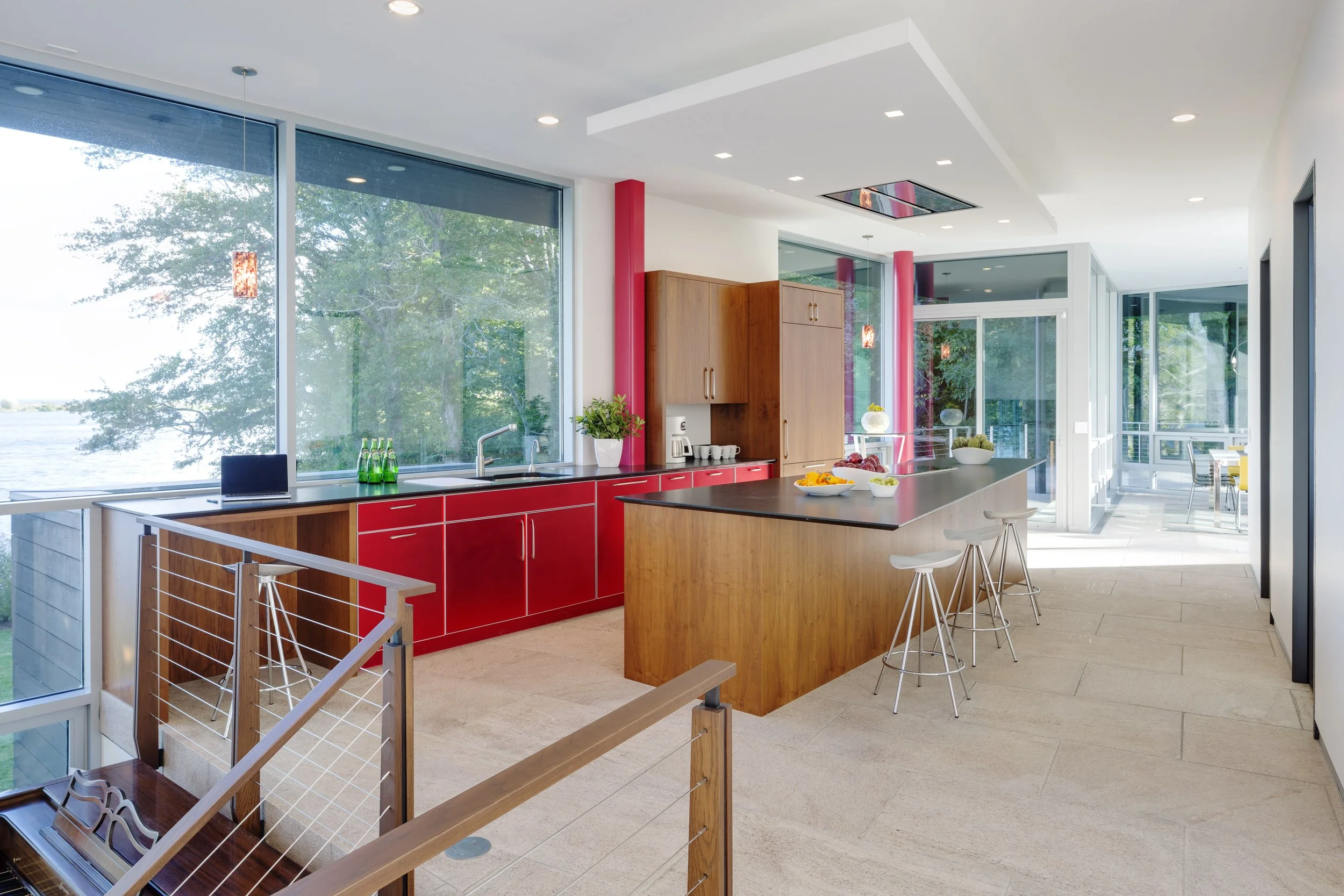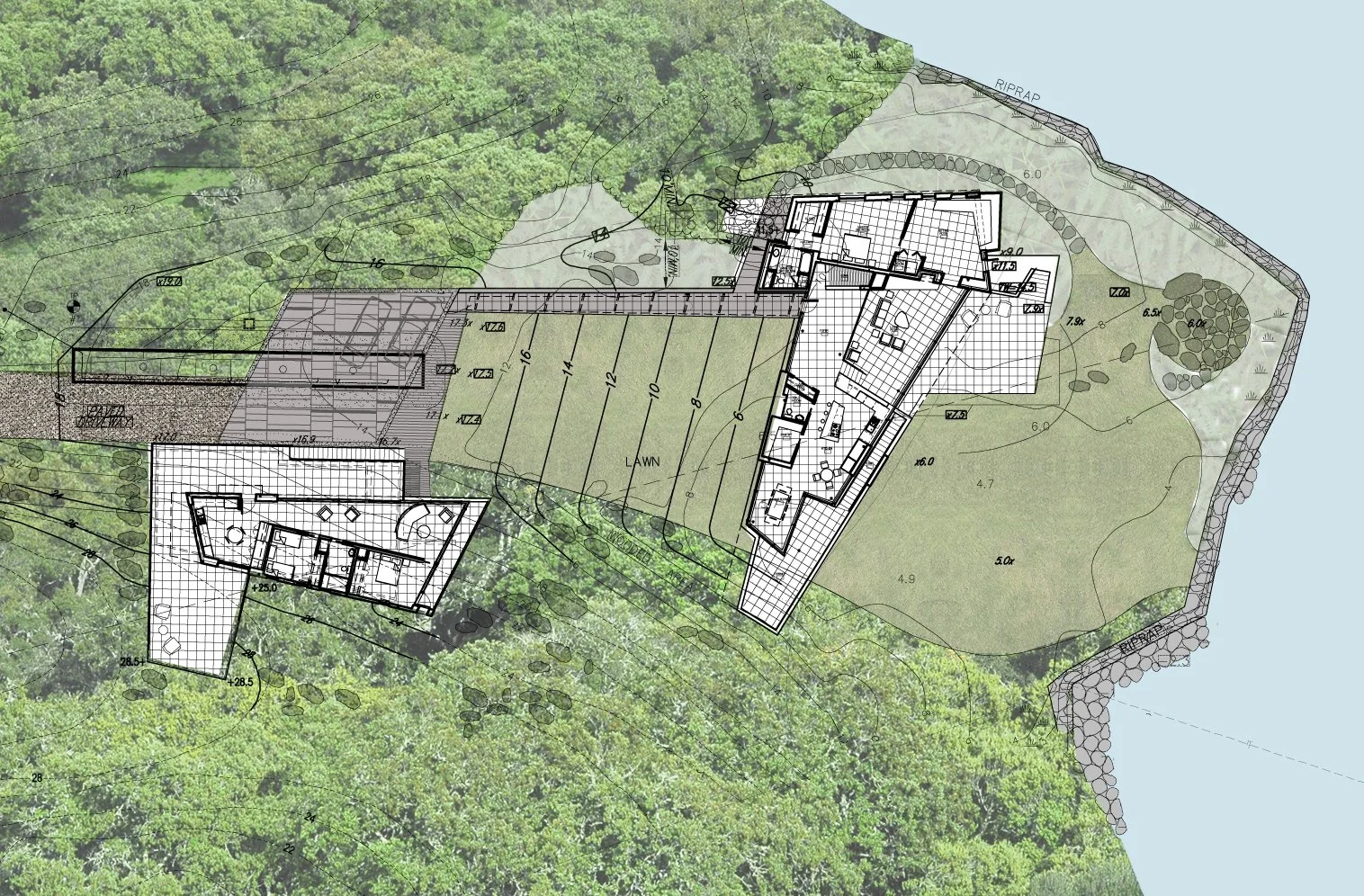 Two structures - a main house and a guest house - command a brackish pond with an outlet to the ocean. The main house is anchored at its north, grounding the building and allowing the south end to “float” above the landscape. The structure’s shifting geometry and angled walls create a small courtyard with the cantilevered guest house further inland. Both structures are clad in natural wood, stone, and glass.