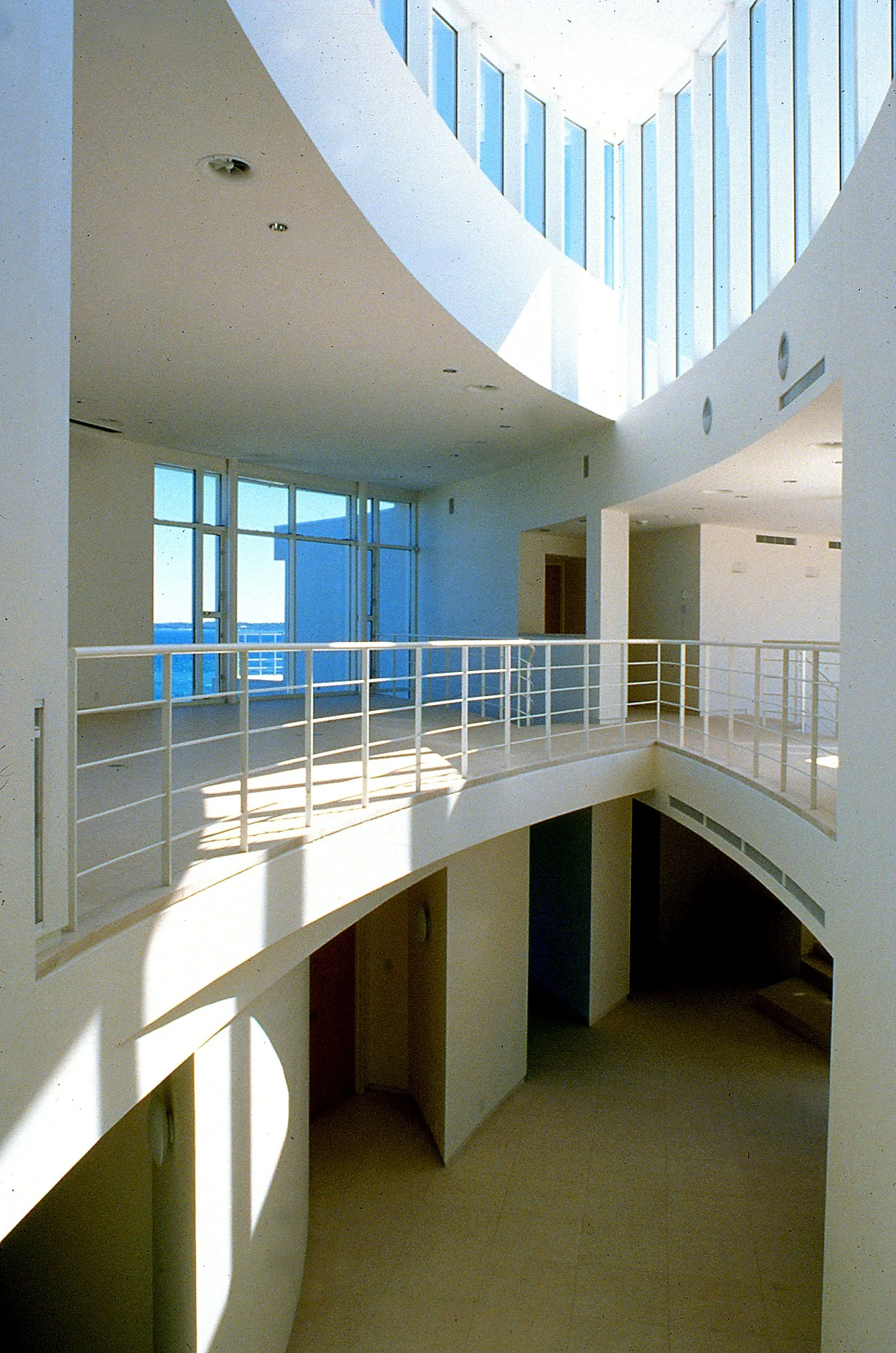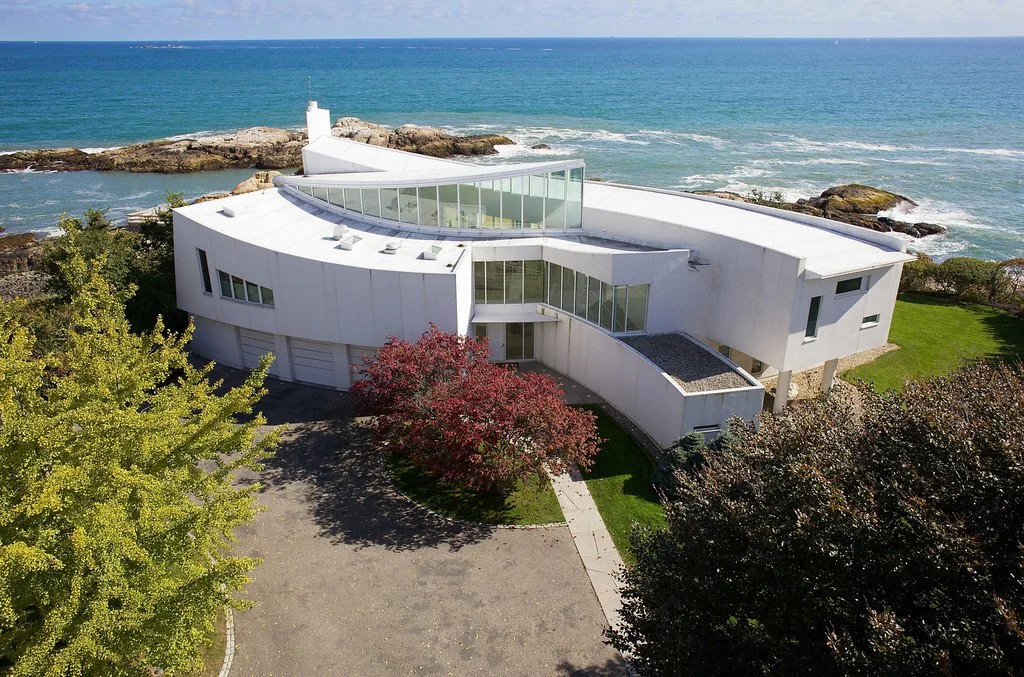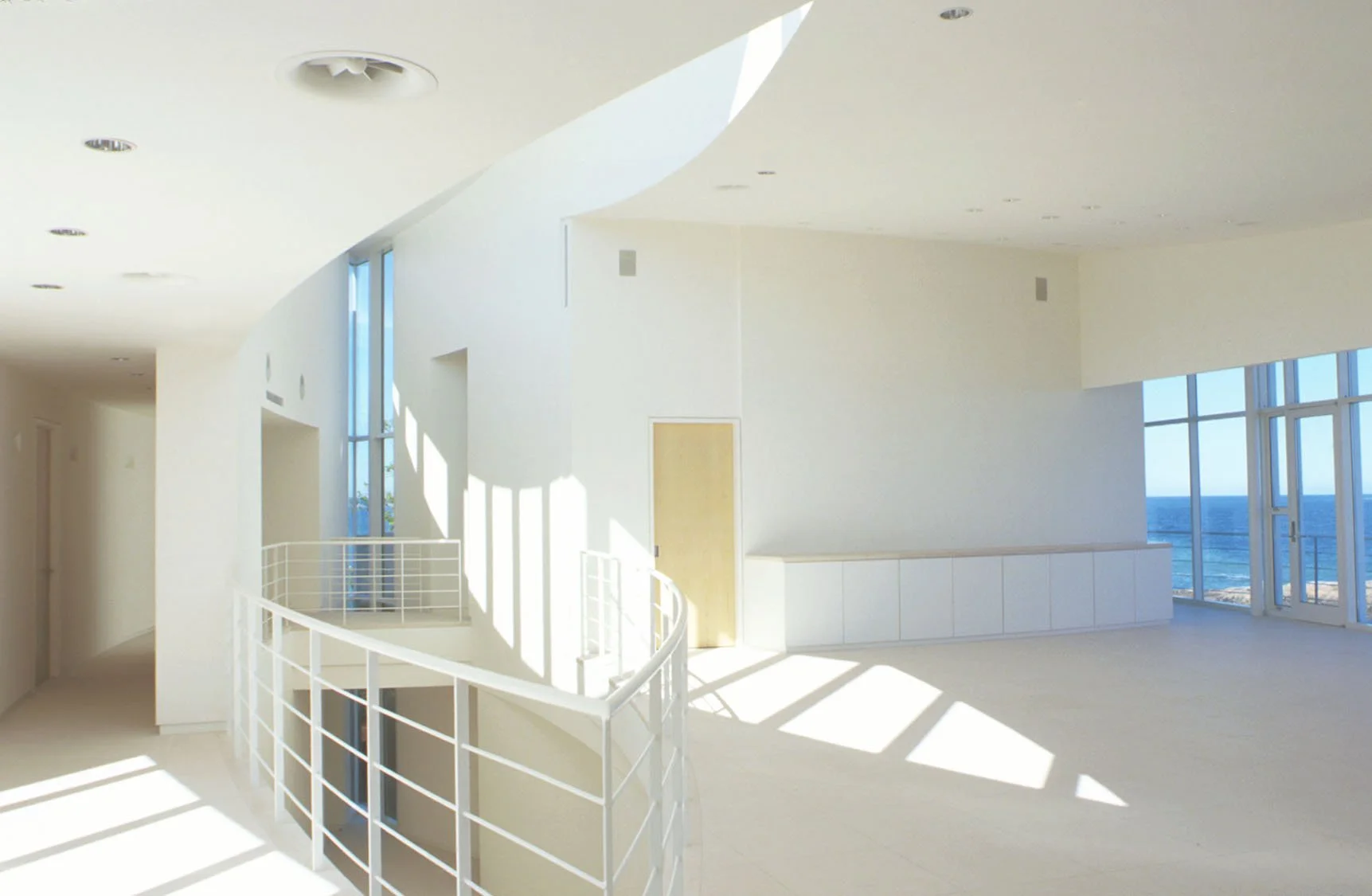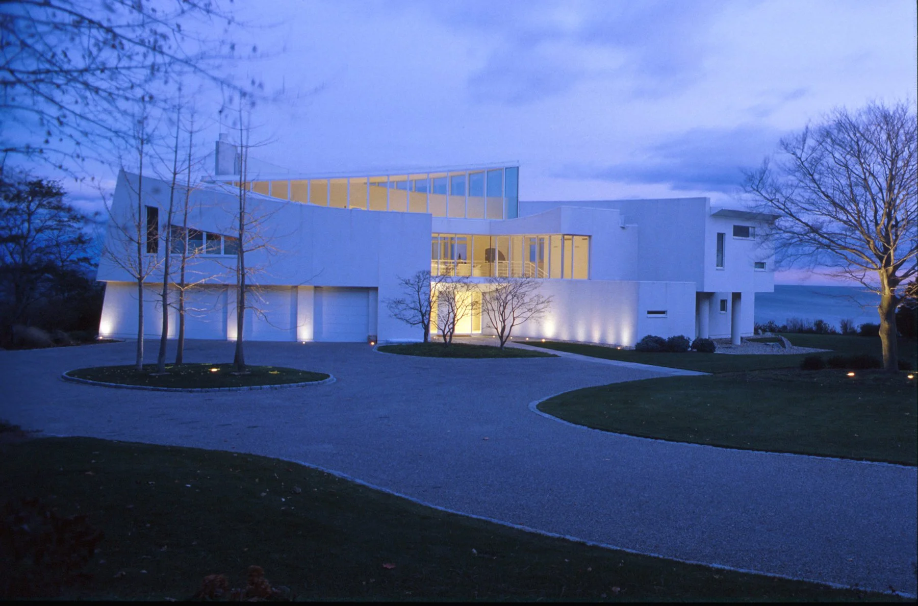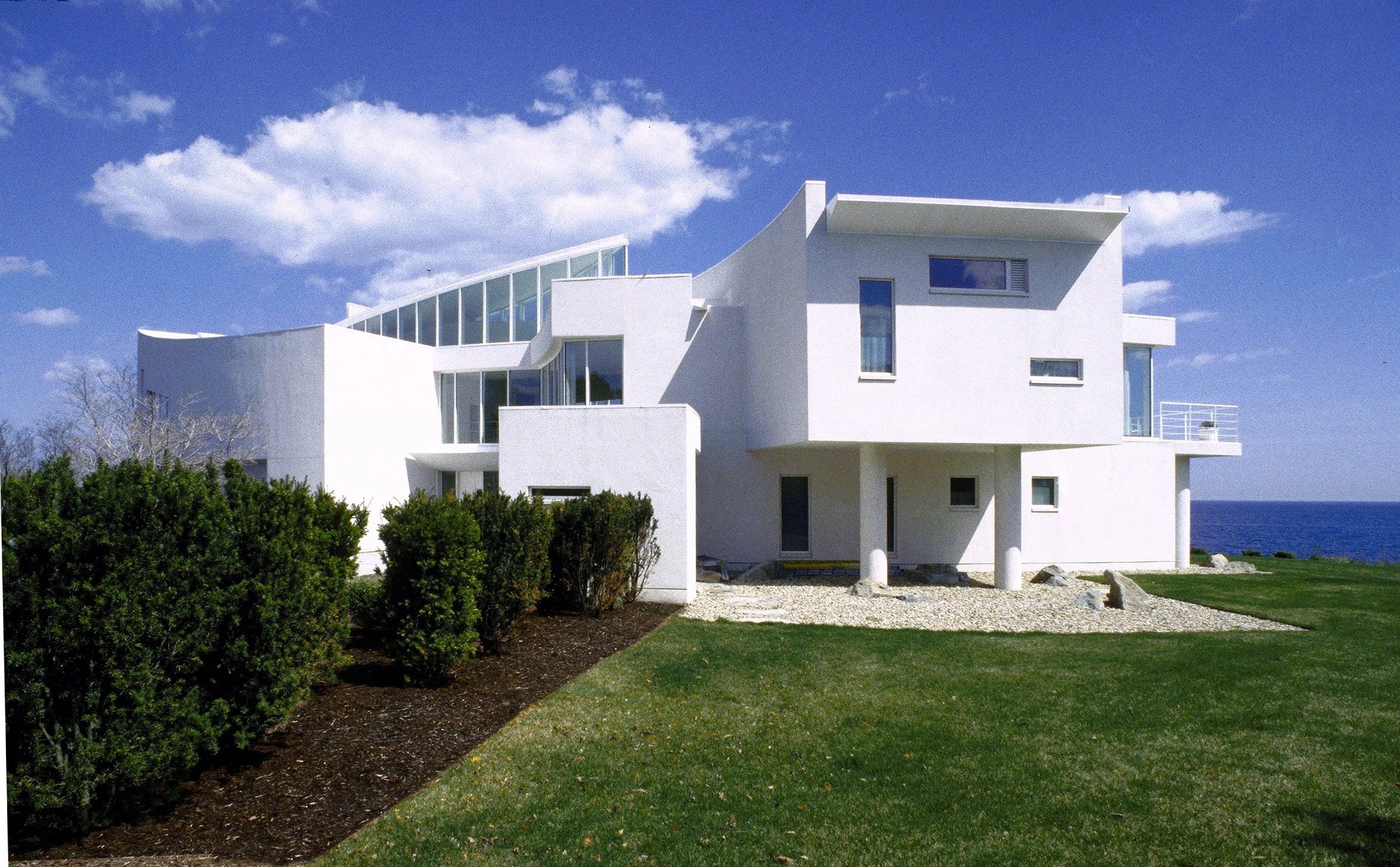 Schwartz/Silver’s design response to an exceptional vantage point is fundamental to the conception of the house – its arcing form following the line of water round into a bay, creating panoramic views of sea and sky. Counterpoised to this predominant line is a second arc, facing the land and presenting the main entry. The spatial organization results in a pointed interior atrium, with rooms arranged along the two curves.