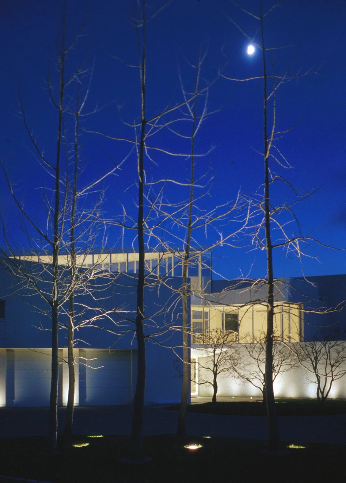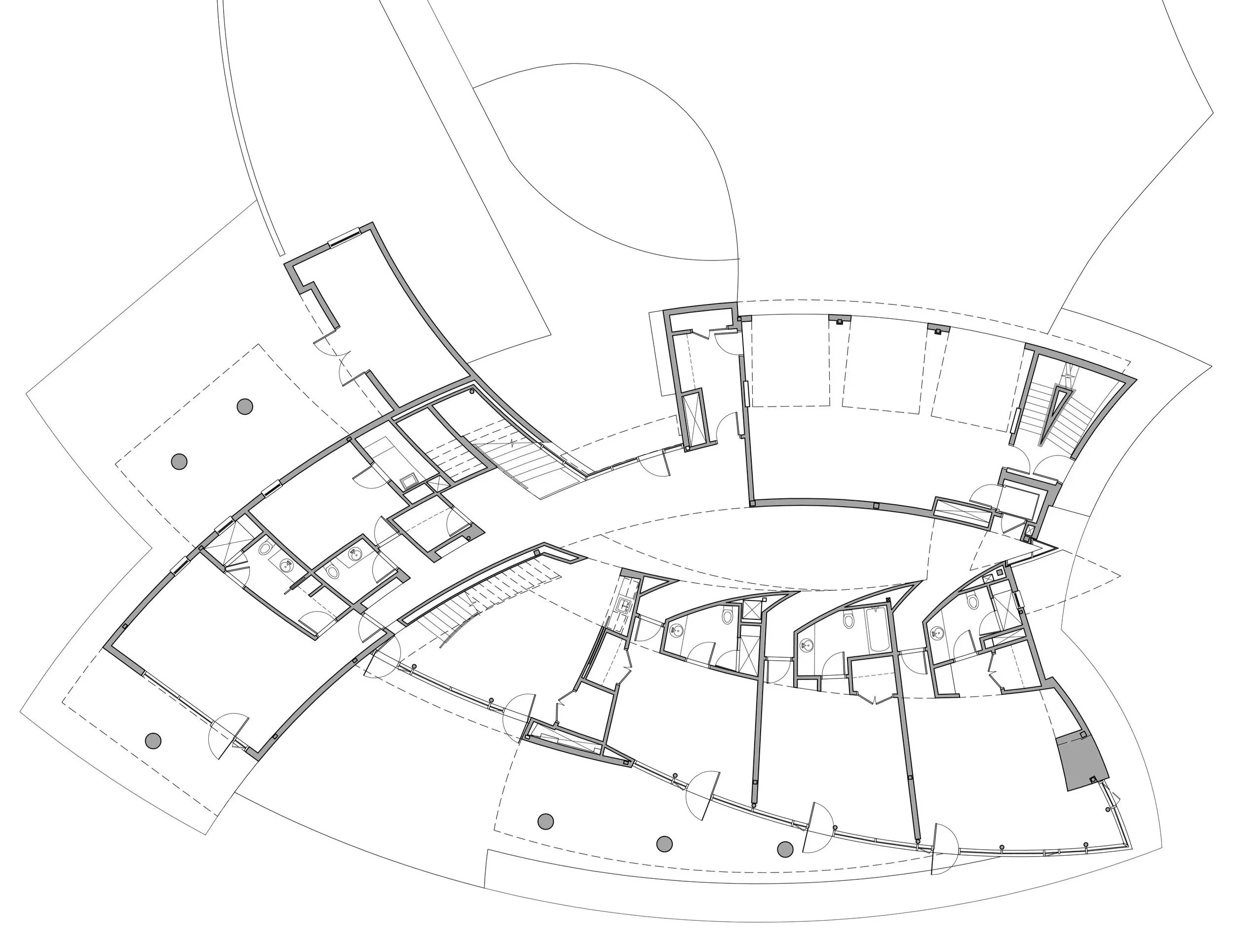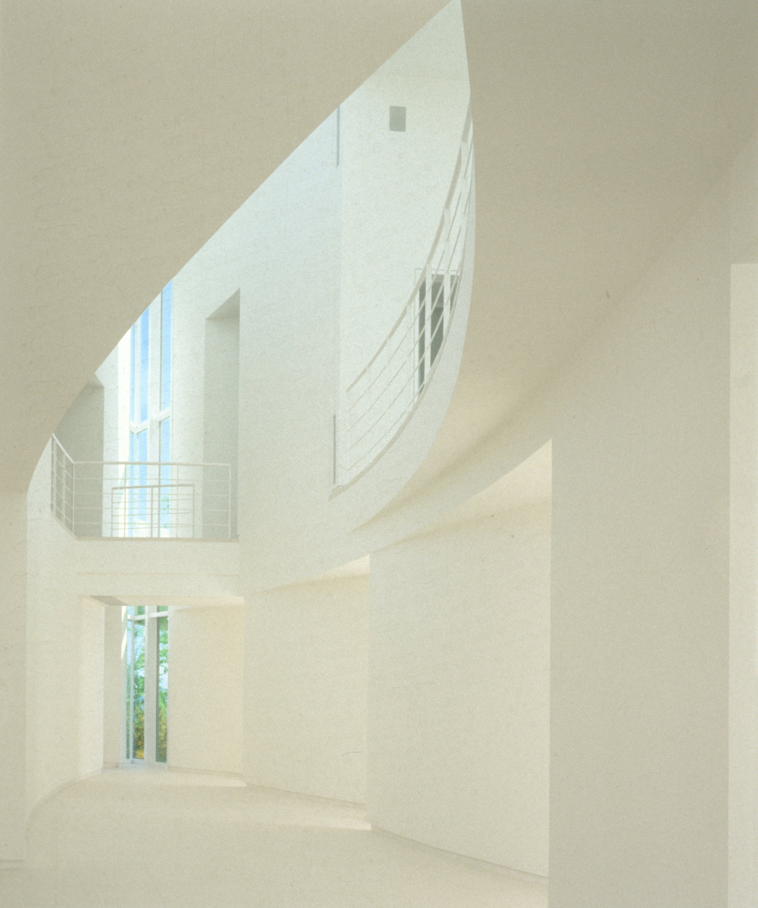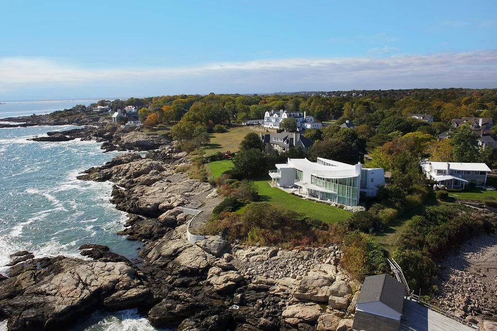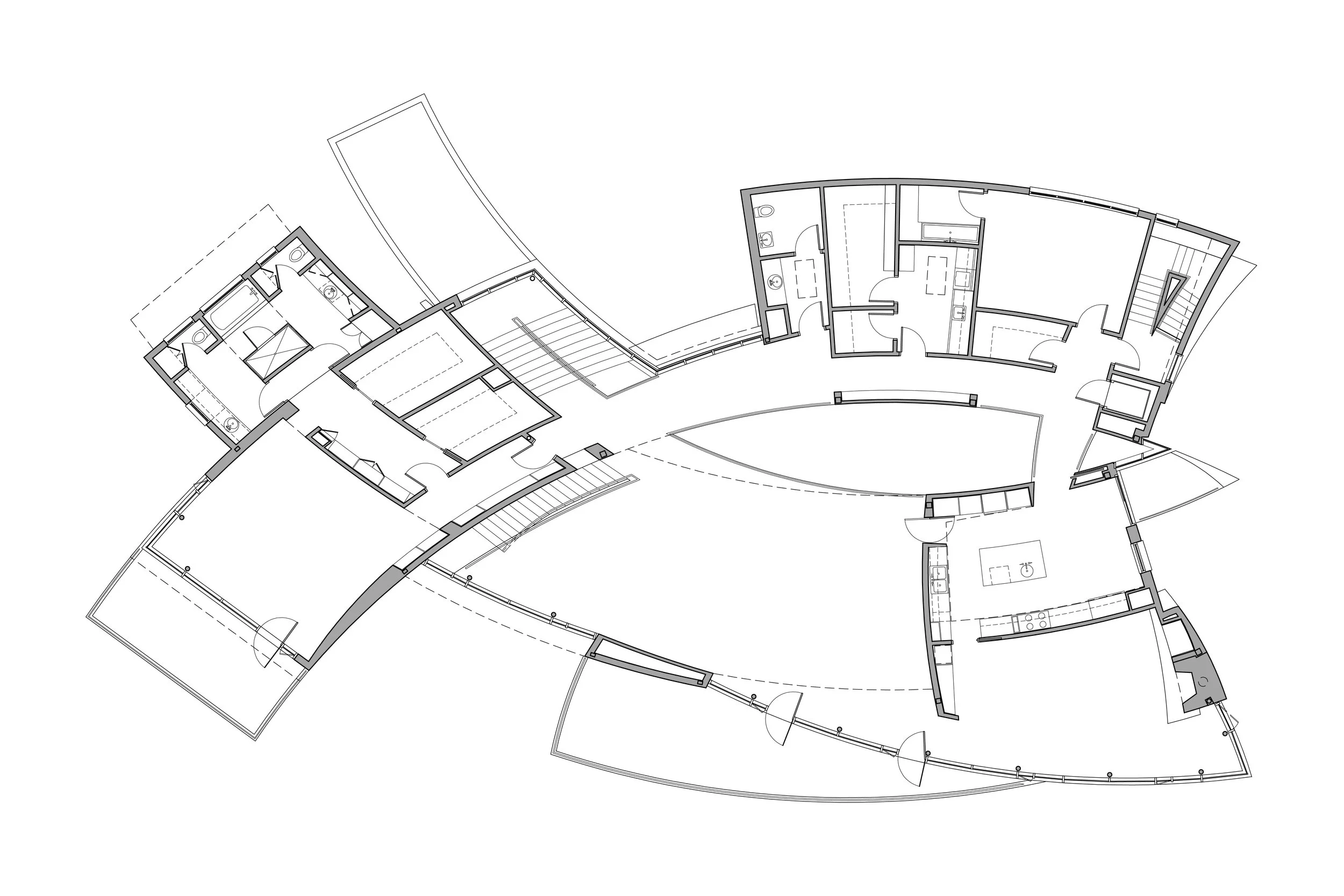 Schwartz/Silver’s design response to an exceptional vantage point is fundamental to the conception of the house – its arcing form following the line of water round into a bay, creating panoramic views of sea and sky. Counterpoised to this predominant line is a second arc, facing the land and presenting the main entry. The spatial organization results in a pointed interior atrium, with rooms arranged along the two curves.