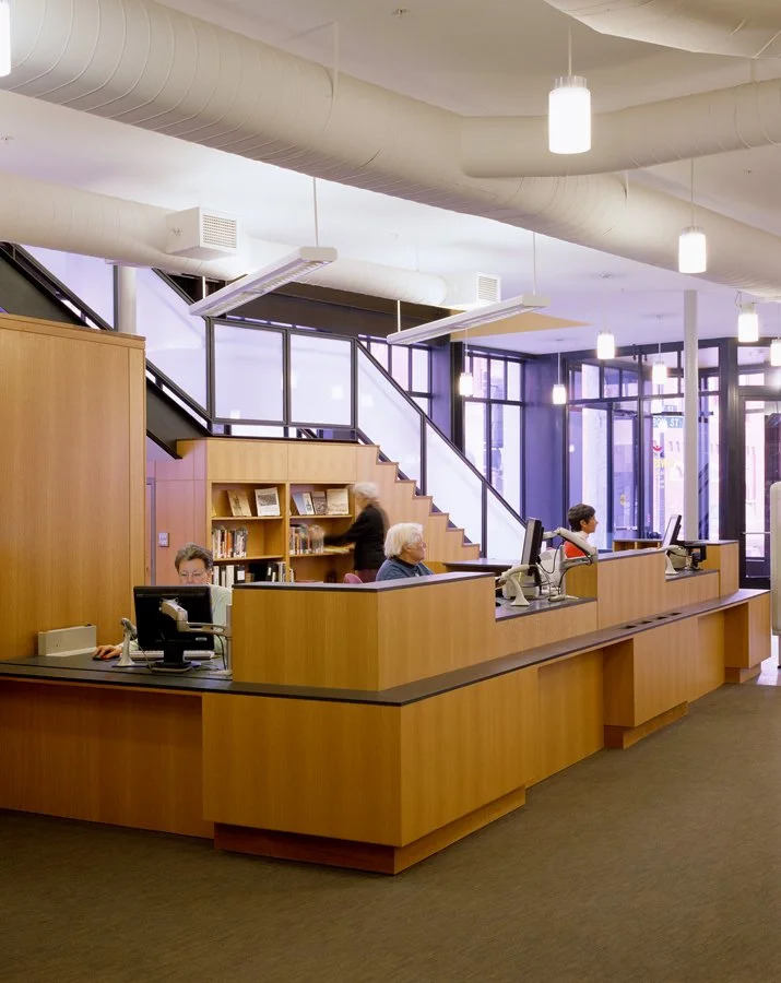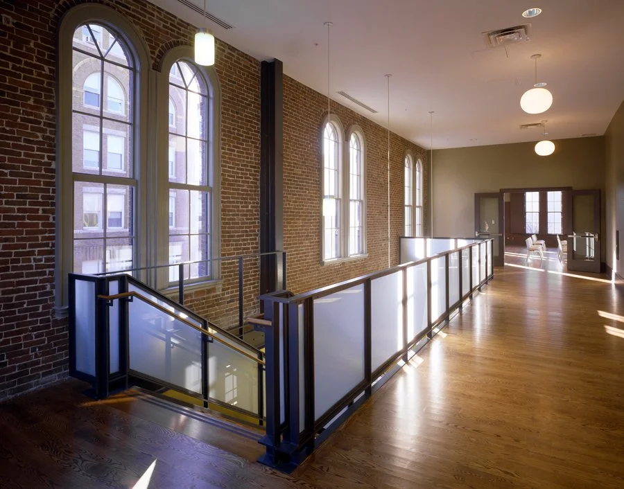 The expansion was carefully programmed to engage downtown Lewiston in ways that were not possible in the original Carnegie library. The street-level Couture Room provides gallery space for local artists, browsing collections and meeting space for book discussion groups. A cascading staircase engages the active street front and bypasses the archives floor to connect the public directly to a ballroom-sized event space at the top floor.