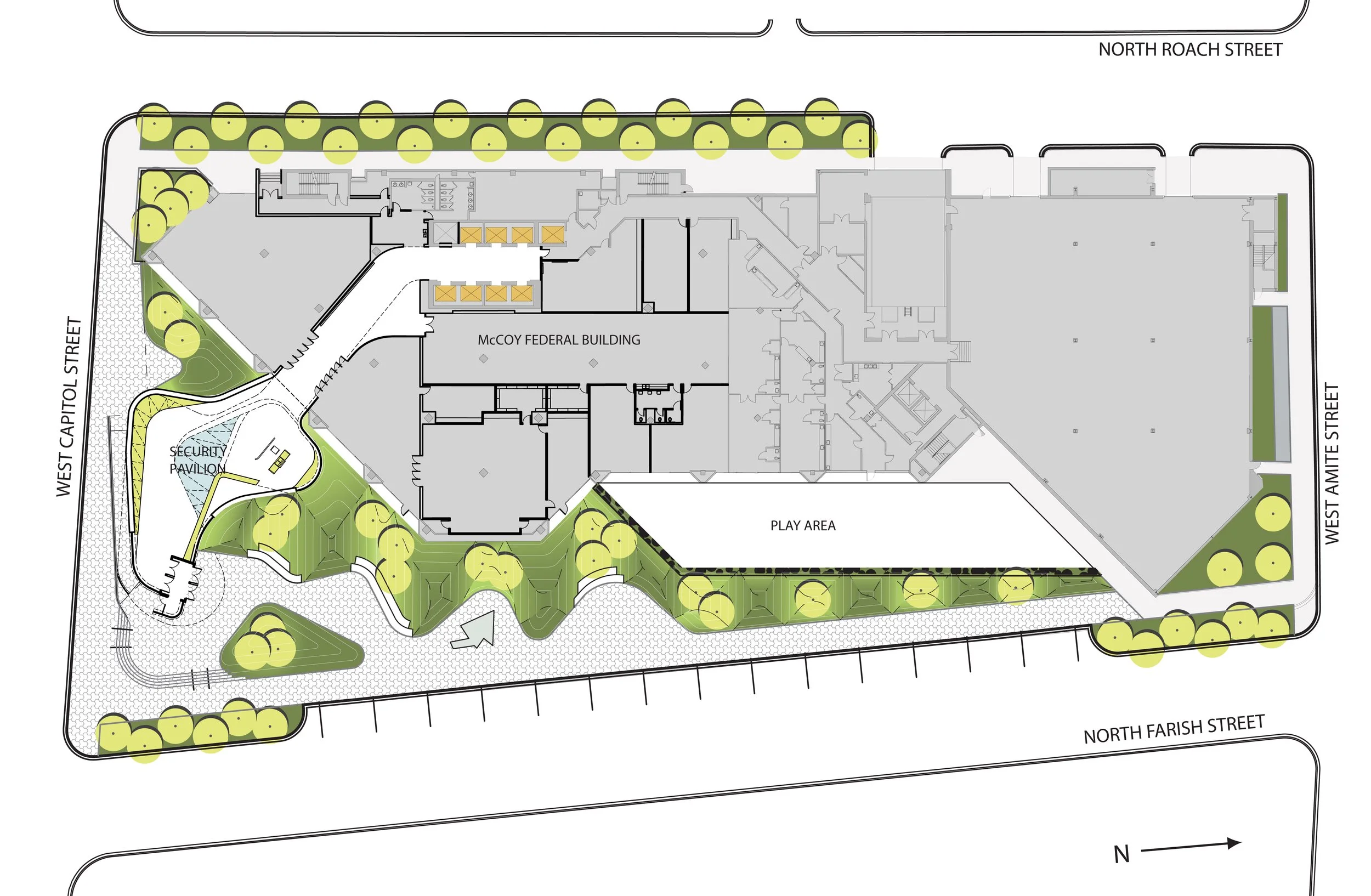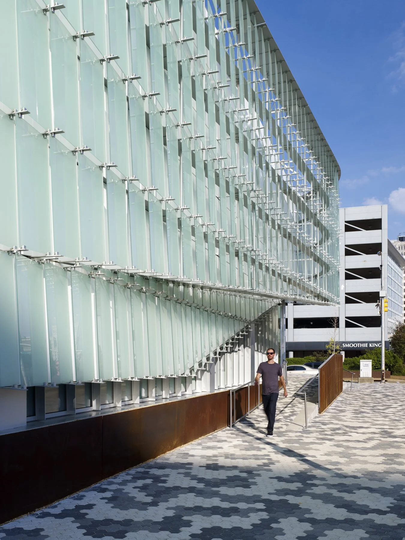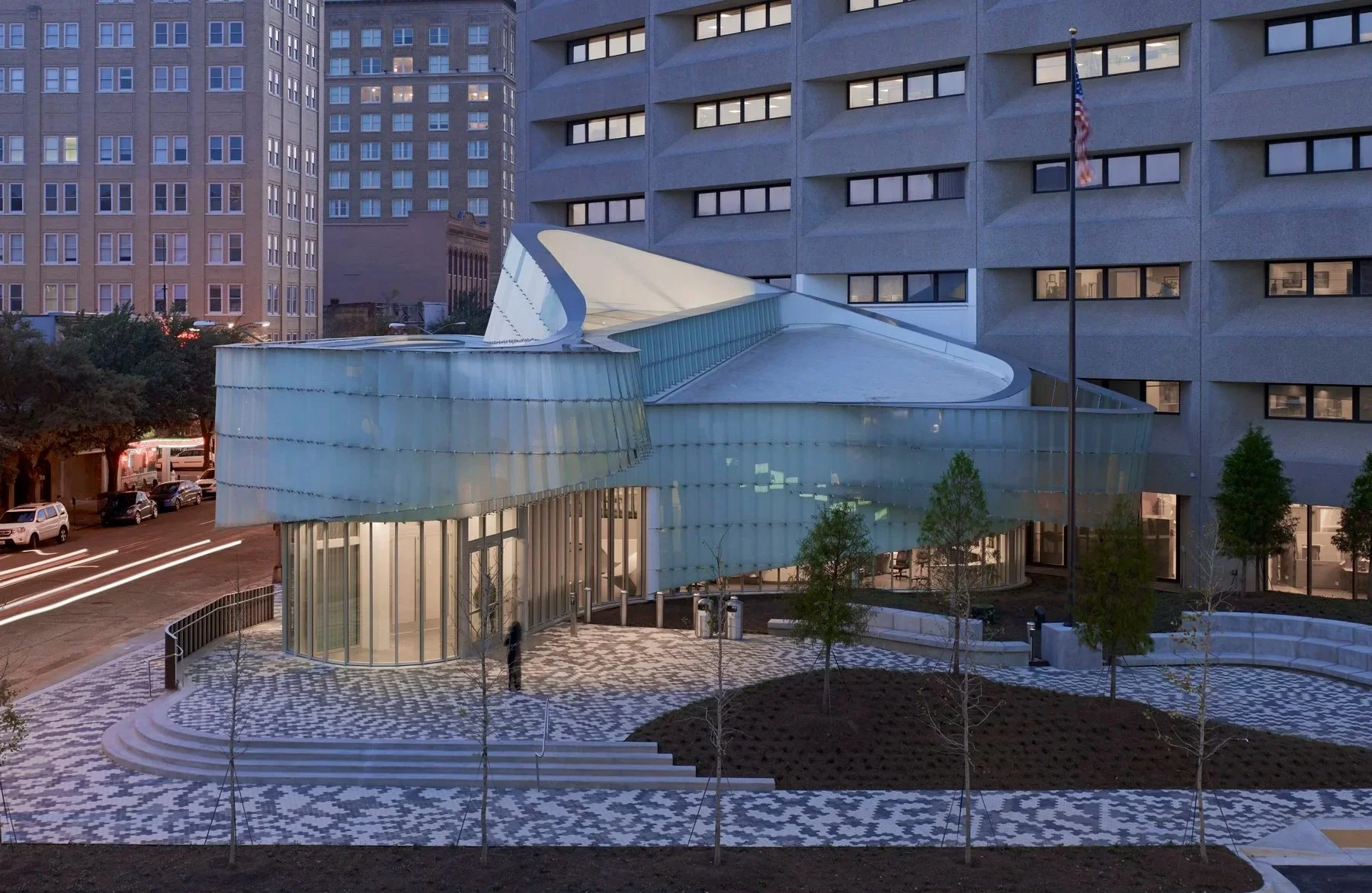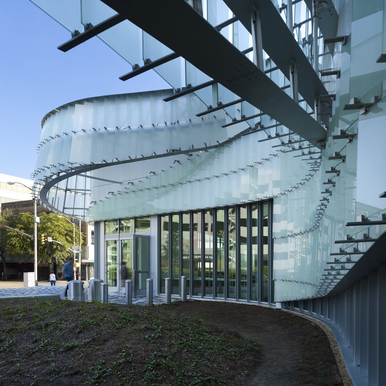 As part of the GSA’s Design Excellence program, Schwartz/Silver addressed several requirements at the McCoy Federal Building: improve accessibility and sustainability; replace building systems; provide a secure entry for twenty federal agencies; and convert a concrete plaza into a green landscape. The tower was reorganized to improve circulation patterns and the building envelope rehabilitated. Inspired by the Mississippi River’s changing meanders, the new security pavilion’s entry canopies curve out to welcome pedestrians. The ribbon-like façades of the pavilion are clad in white aluminum skin matching the color of the original tower. In front of that metal surface, aluminum ribbons support translucent glass shingles that hover free of the façade. The shingles, floating in front of the building skin, are luminous and ephemeral.