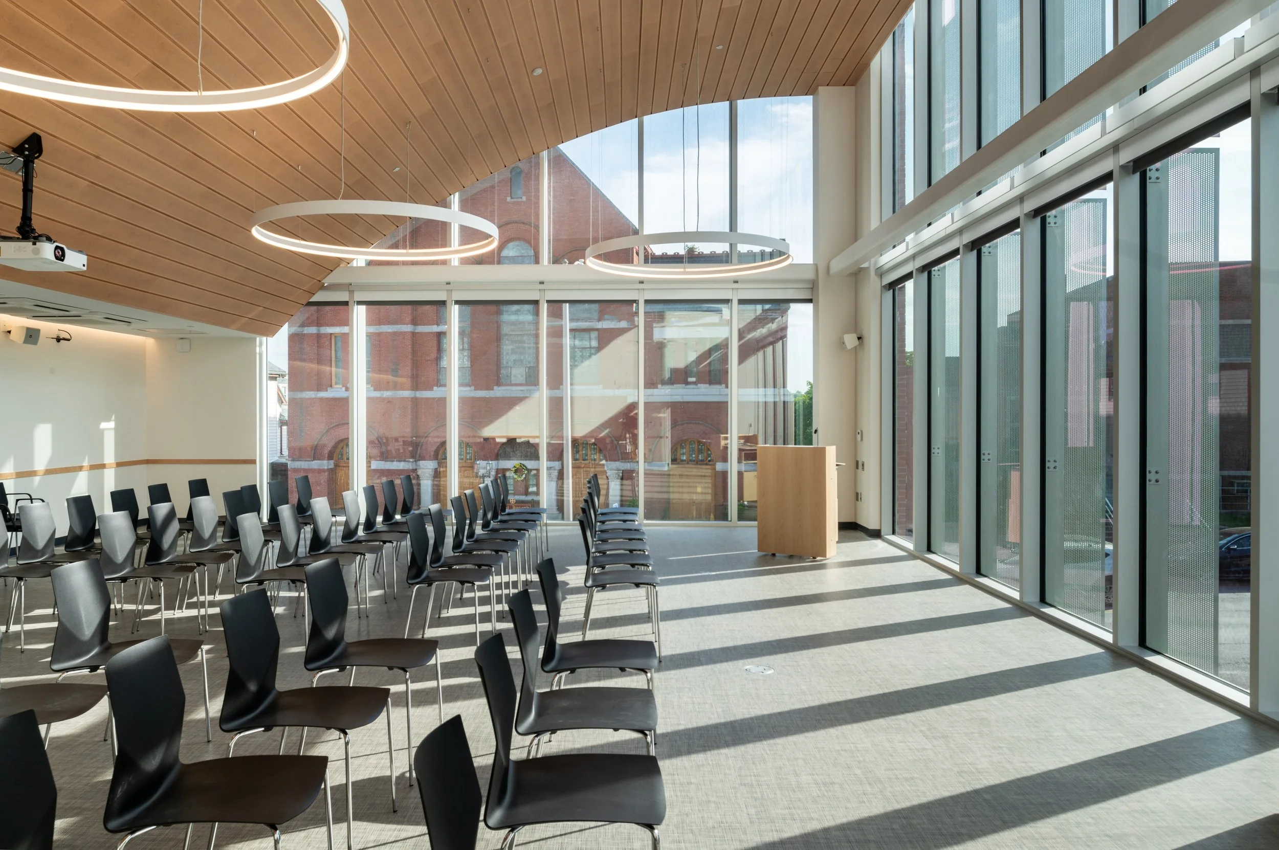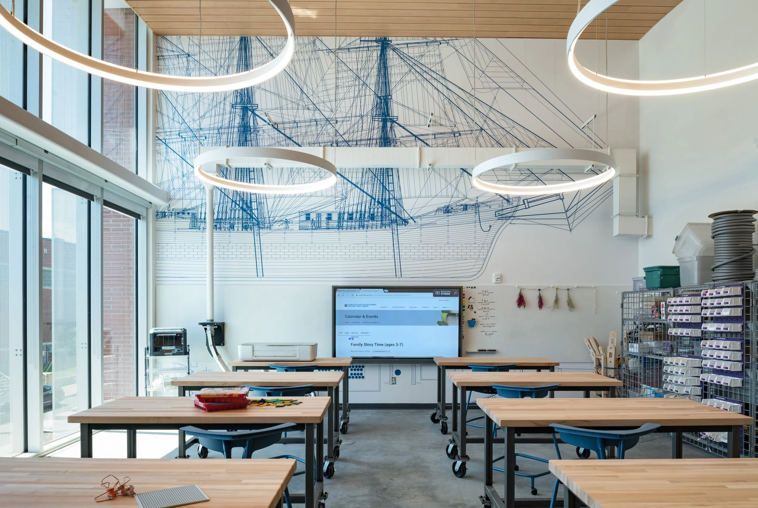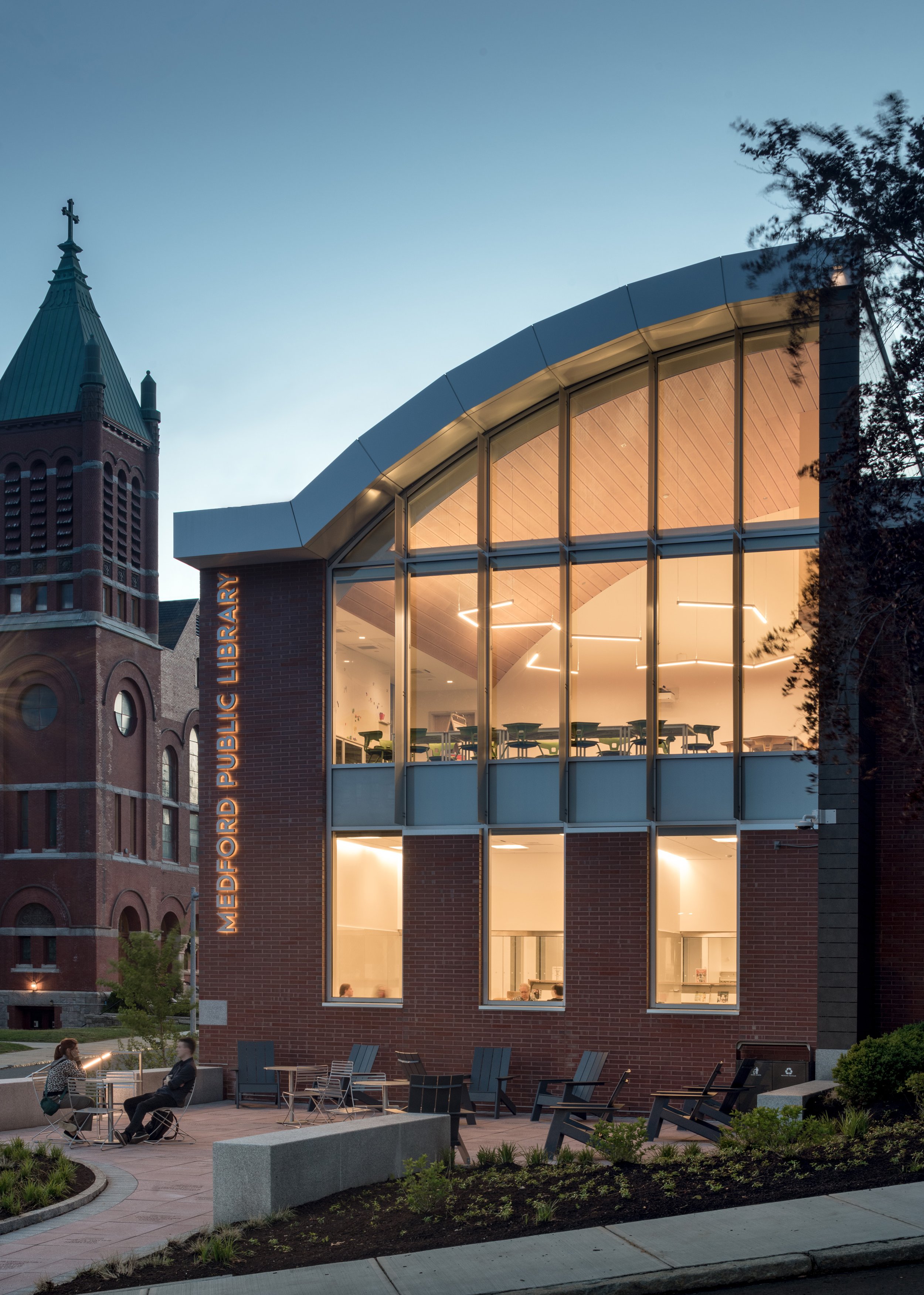 The library offers the residents of Medford a 100-person multi-purpose meeting room; a maker space; a tech lab; a local history room; separate reading rooms for adults, teens, and children; and other amenities. The building’s curved roof forms and plank-lined ceilings are inspired by Medford’s rich history as a clipper ship manufacturing hub, as well as the desire of the city to produce renewable energy, which was achieved with over 600 solar panels installed on the curved roofs. The project is among the first public libraries in the Commonwealth to achieve net-zero energy usage on site.