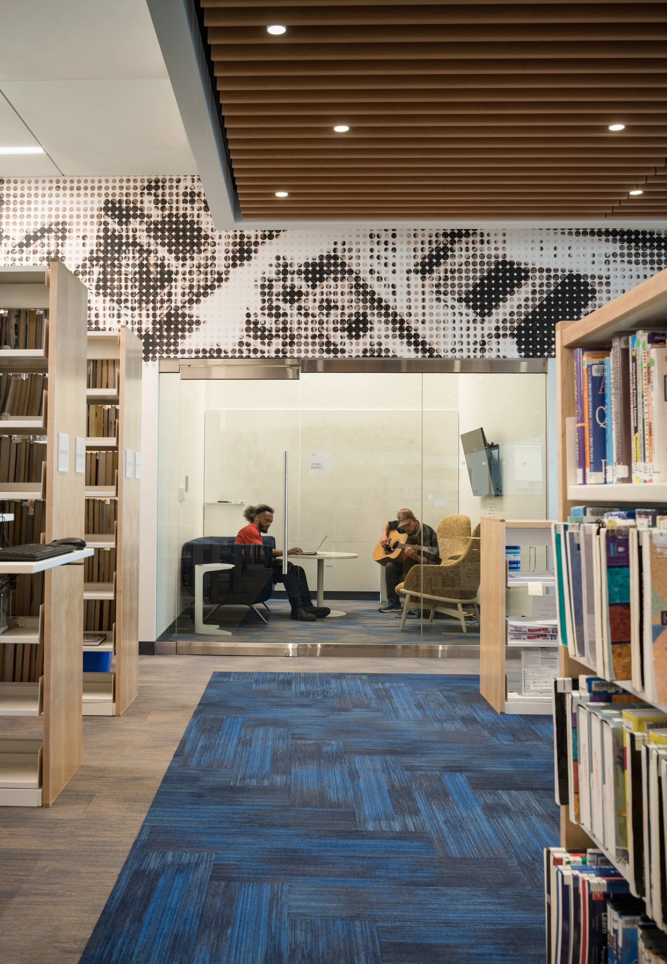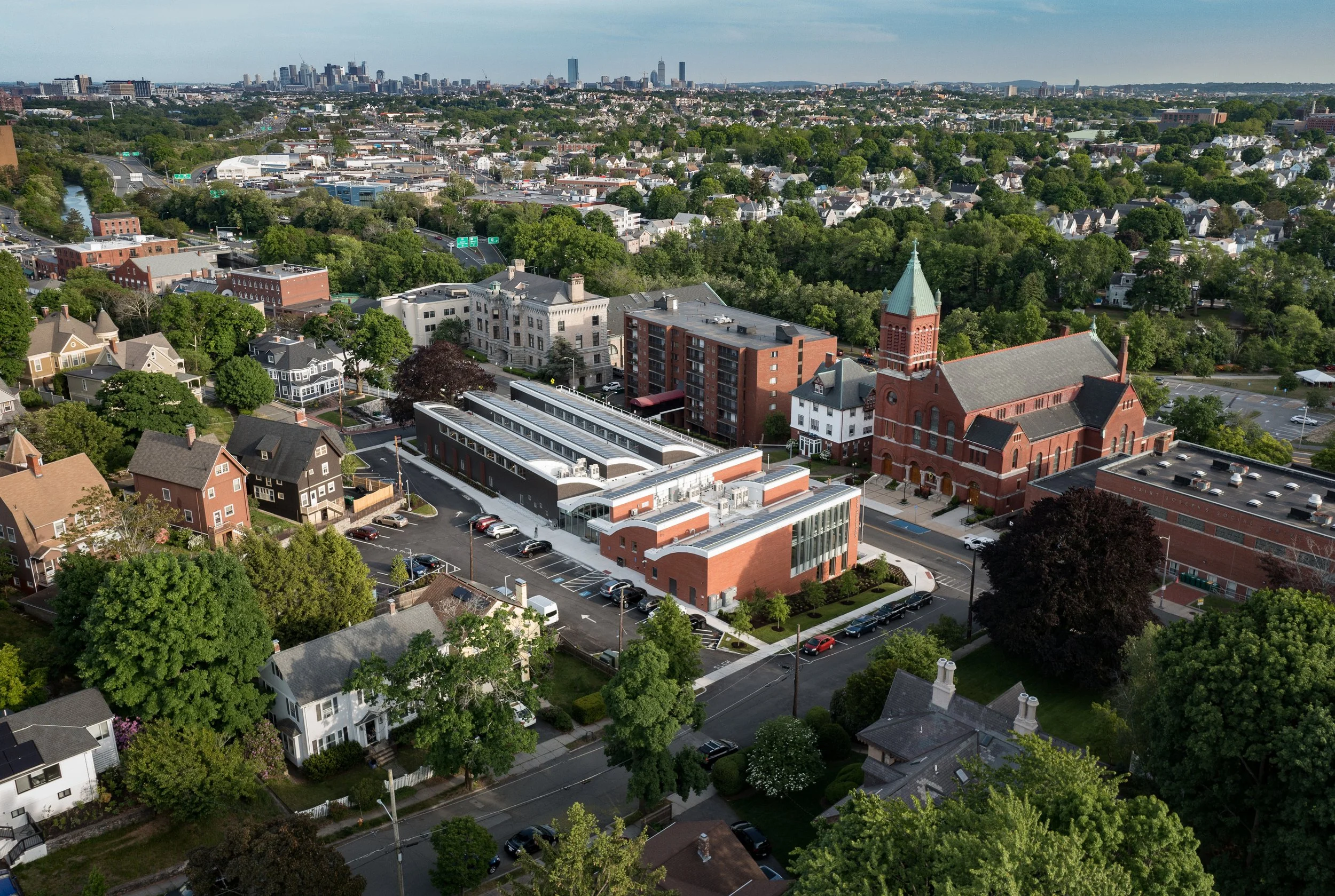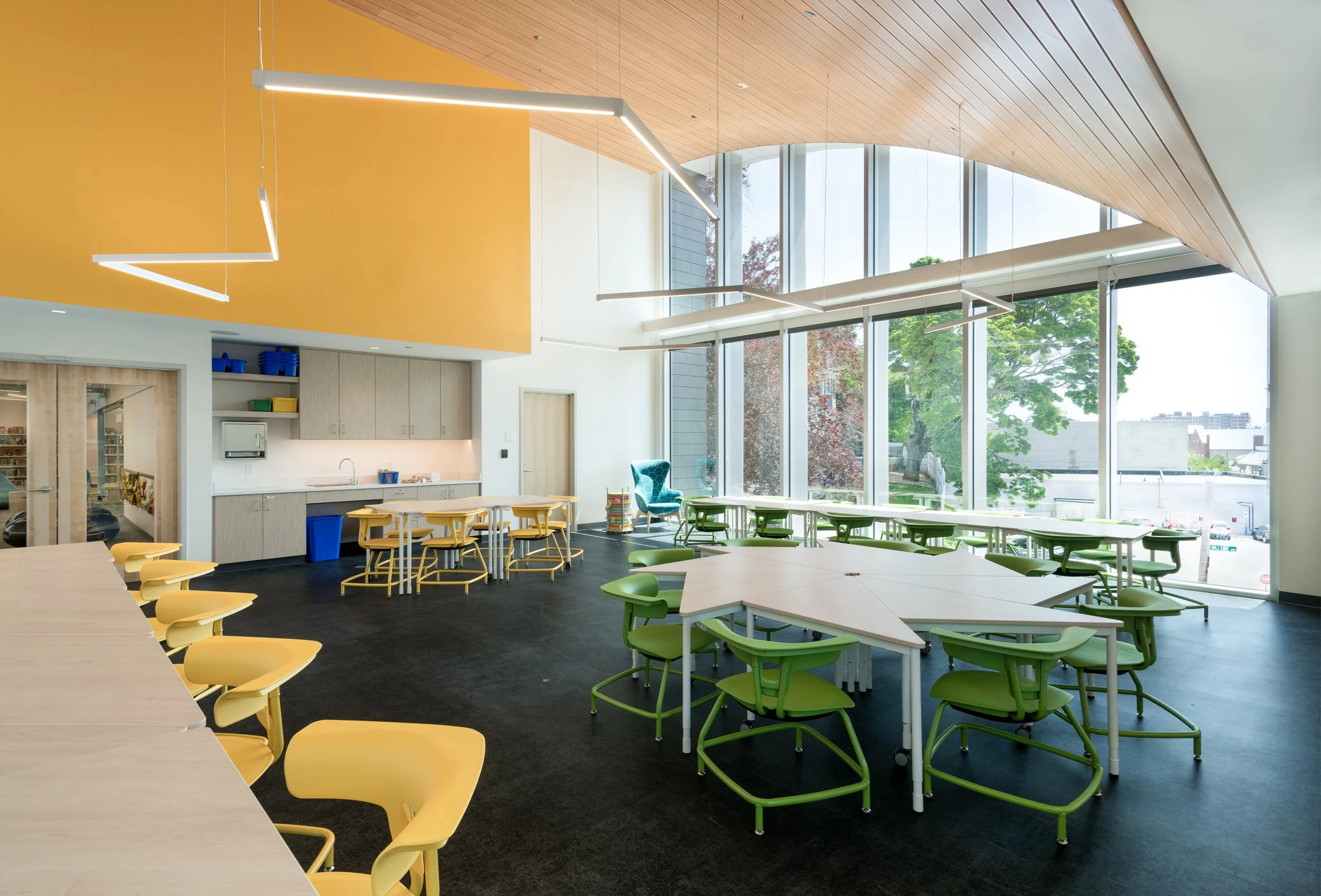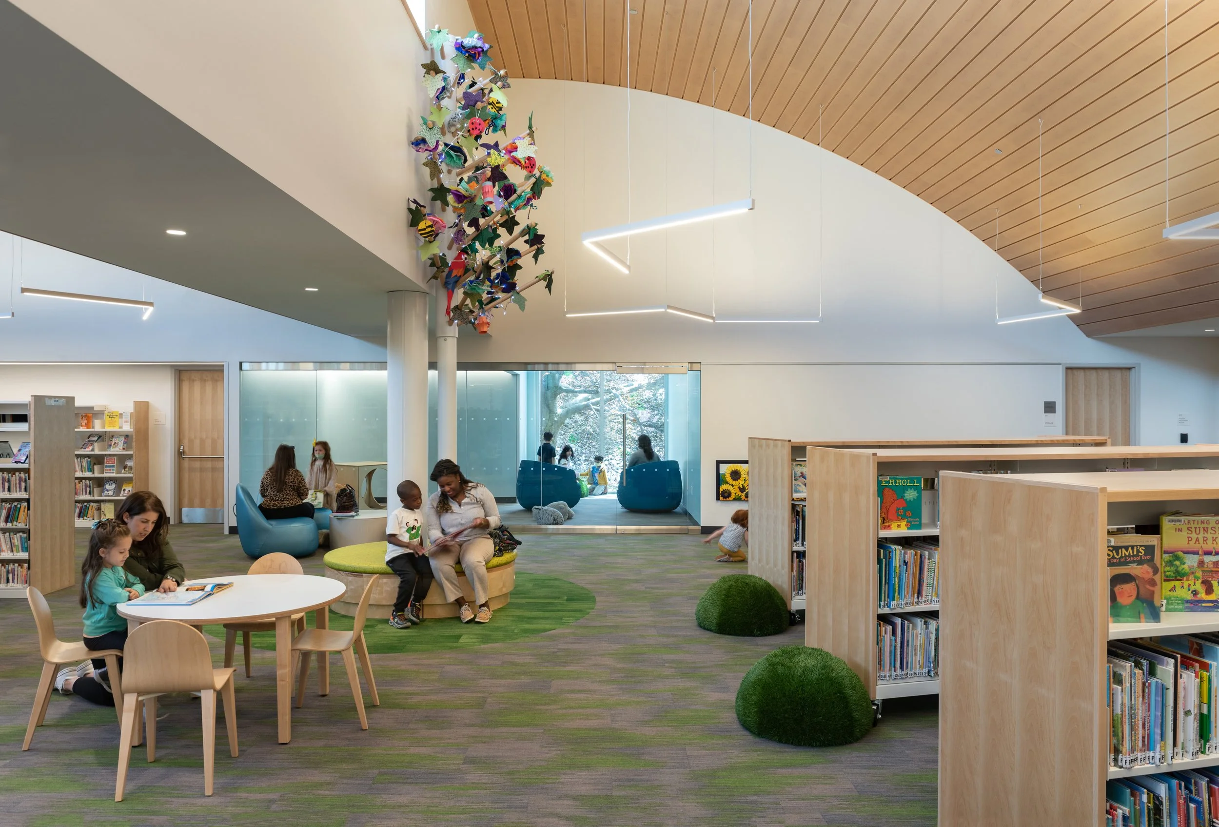 The library offers the residents of Medford a 100-person multi-purpose meeting room; a maker space; a tech lab; a local history room; separate reading rooms for adults, teens, and children; and other amenities. The building’s curved roof forms and plank-lined ceilings are inspired by Medford’s rich history as a clipper ship manufacturing hub, as well as the desire of the city to produce renewable energy, which was achieved with over 600 solar panels installed on the curved roofs. The project is among the first public libraries in the Commonwealth to achieve net-zero energy usage on site.