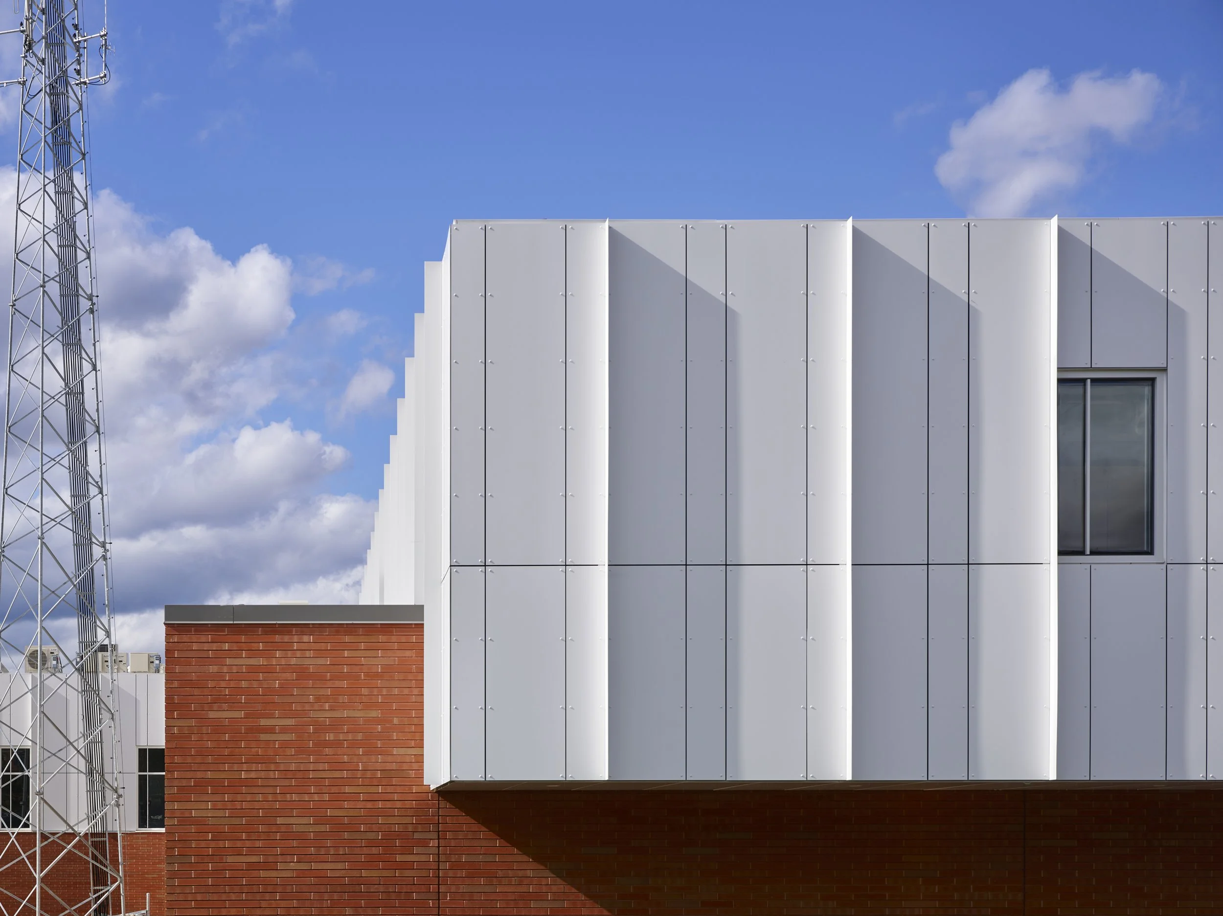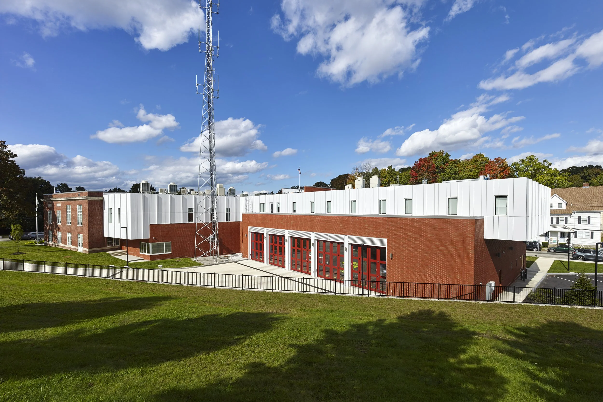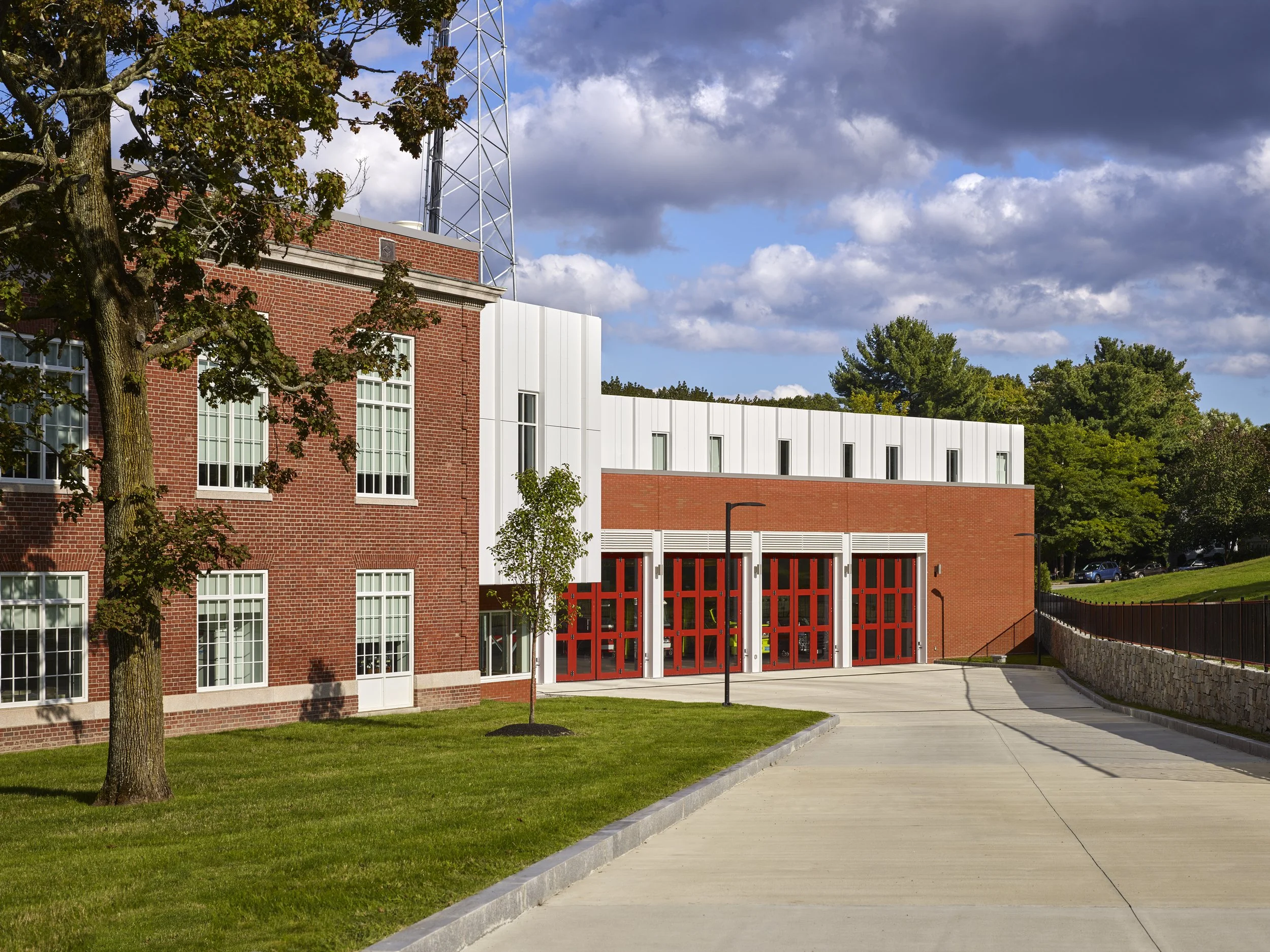 The 30,000-square-foot station includes a five-bay drive-through apparatus bay, firematic support spaces, twenty firefighter bunkrooms, offices for headquarters administration and fire prevention, a forty-seat EOC room, new 120-foot high radio tower, and the City of Newton’s backup dispatch center. The building is situated on a very challenging, triangular site bordered by the MWRA Sudbury Aqueduct, a residential neighborhood, and Centre Street.