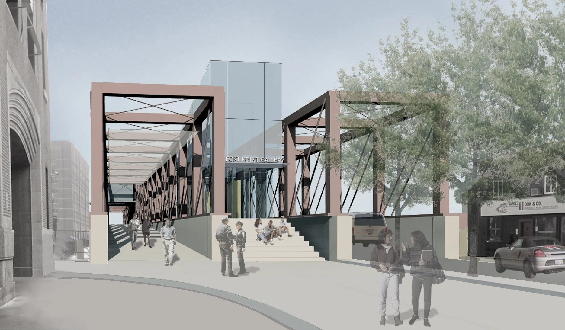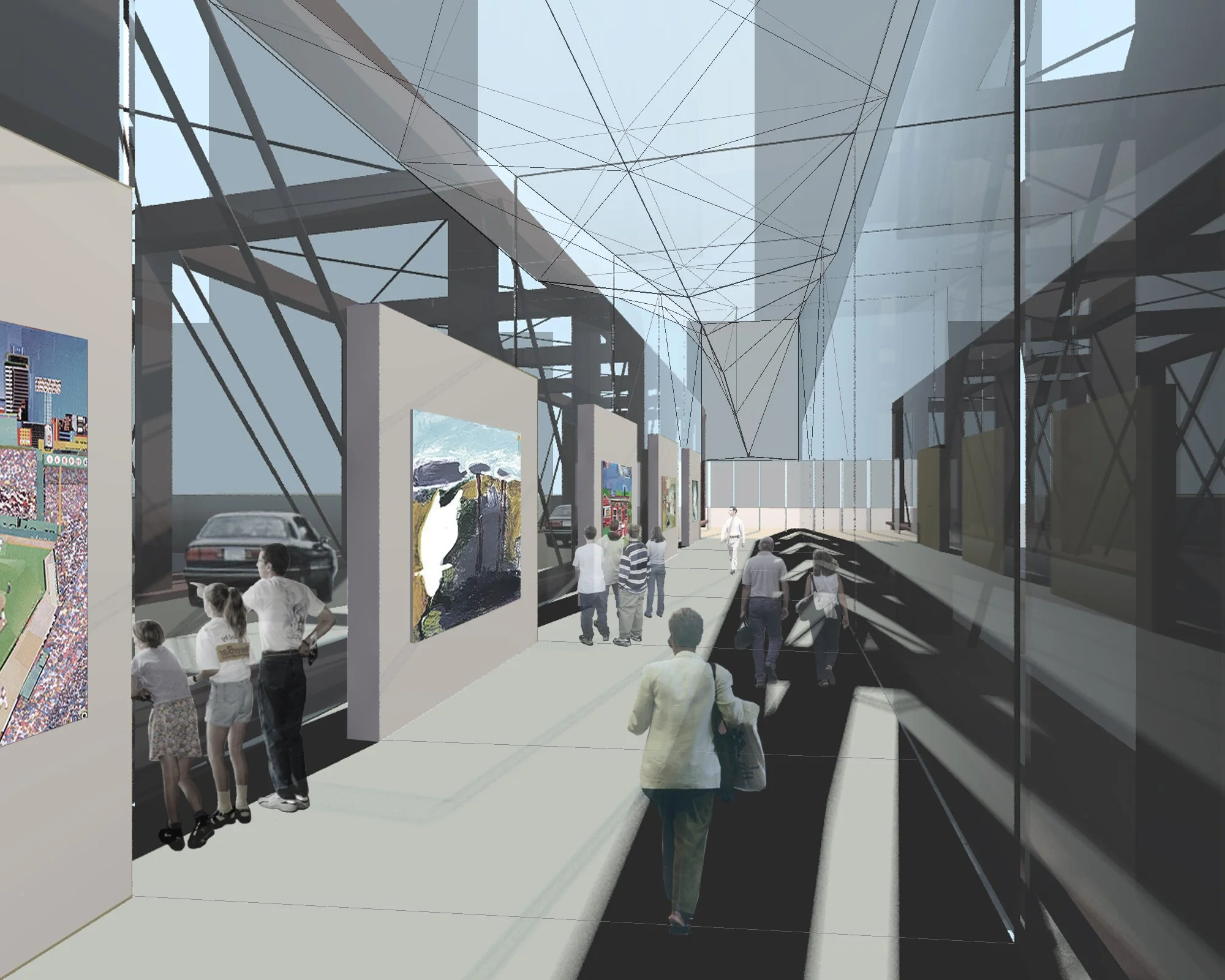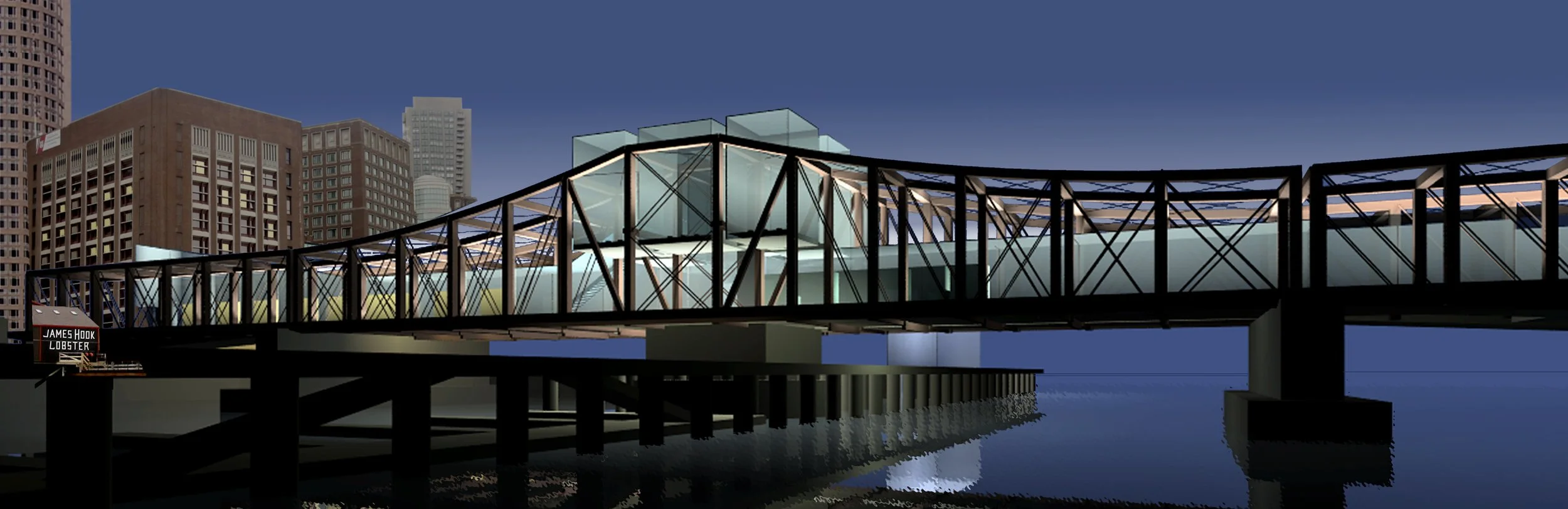 In this study, the deck of the fixed span is raised by nearly nine feet, and the bridge’s three bays are used for one-way vehicular travel, pedestrians, and a new Fort Point Channel community art gallery. The wharf below would include a public marina and the Boston Bridge Museum.