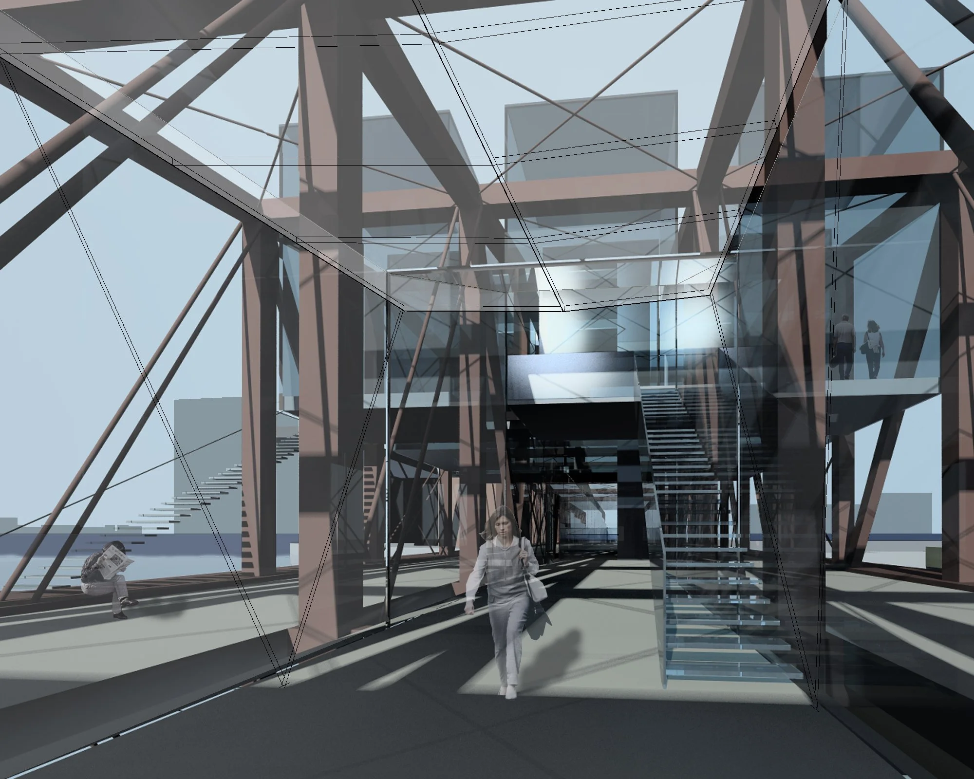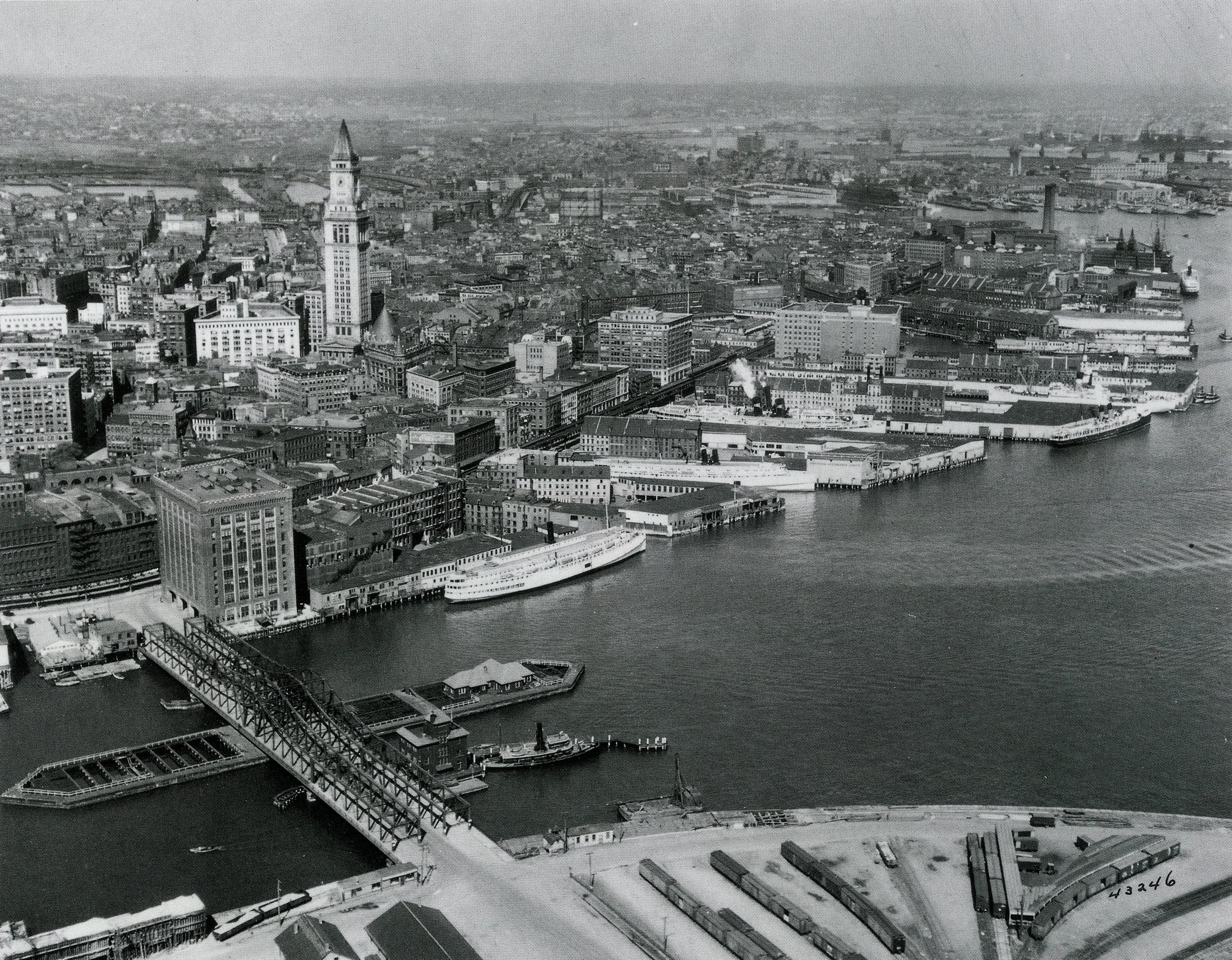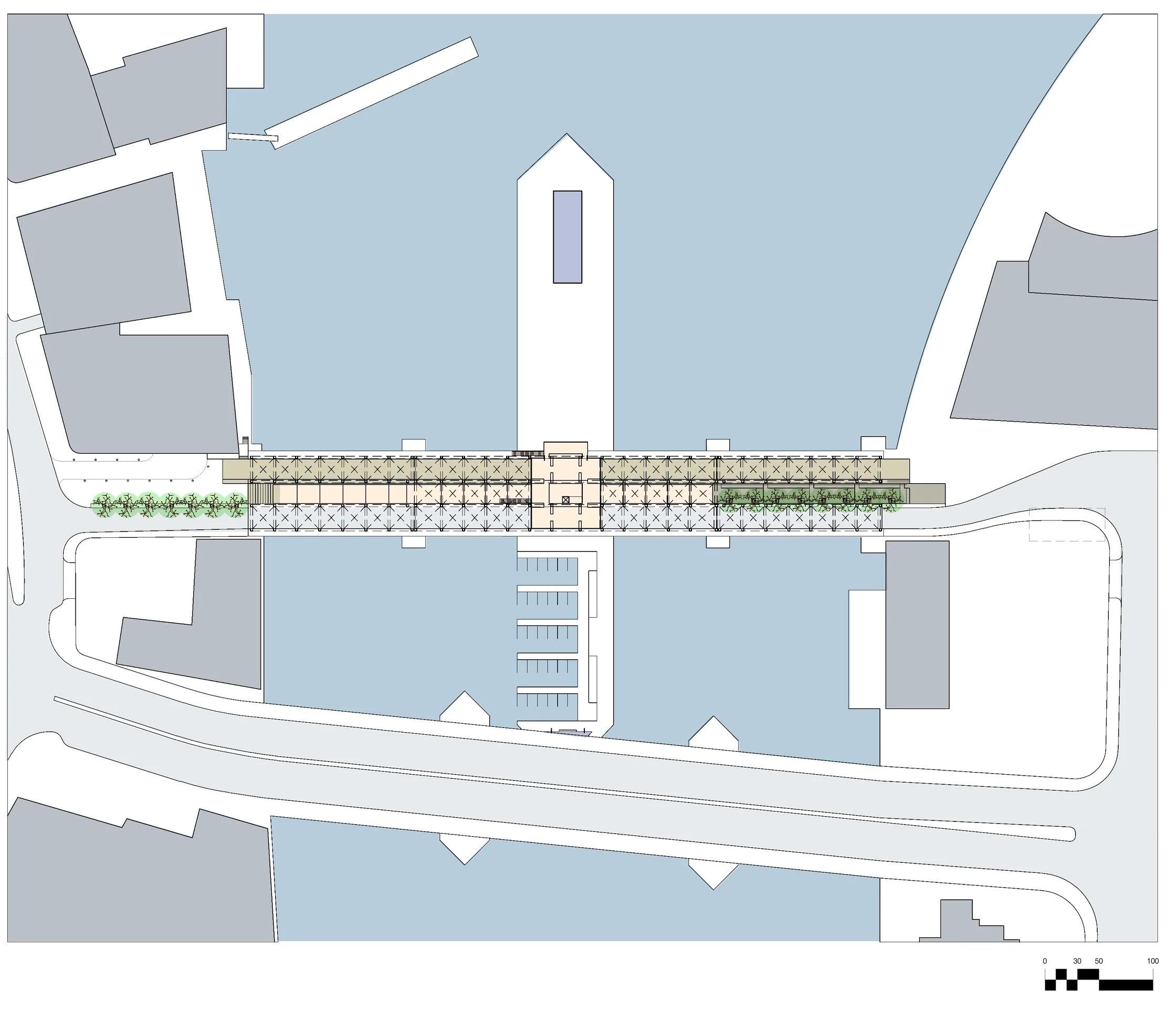 In this study, the deck of the fixed span is raised by nearly nine feet, and the bridge’s three bays are used for one-way vehicular travel, pedestrians, and a new Fort Point Channel community art gallery. The wharf below would include a public marina and the Boston Bridge Museum.
