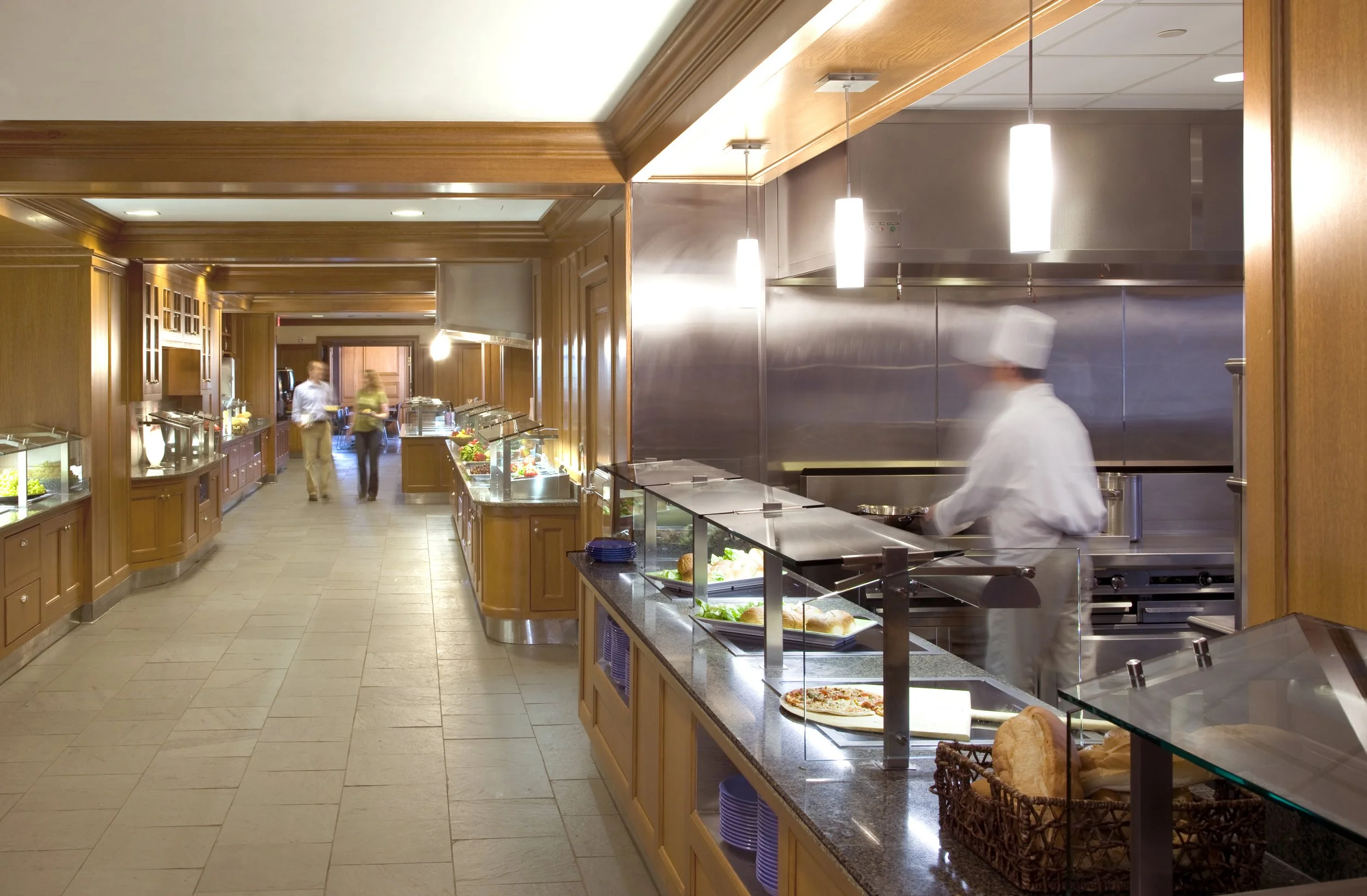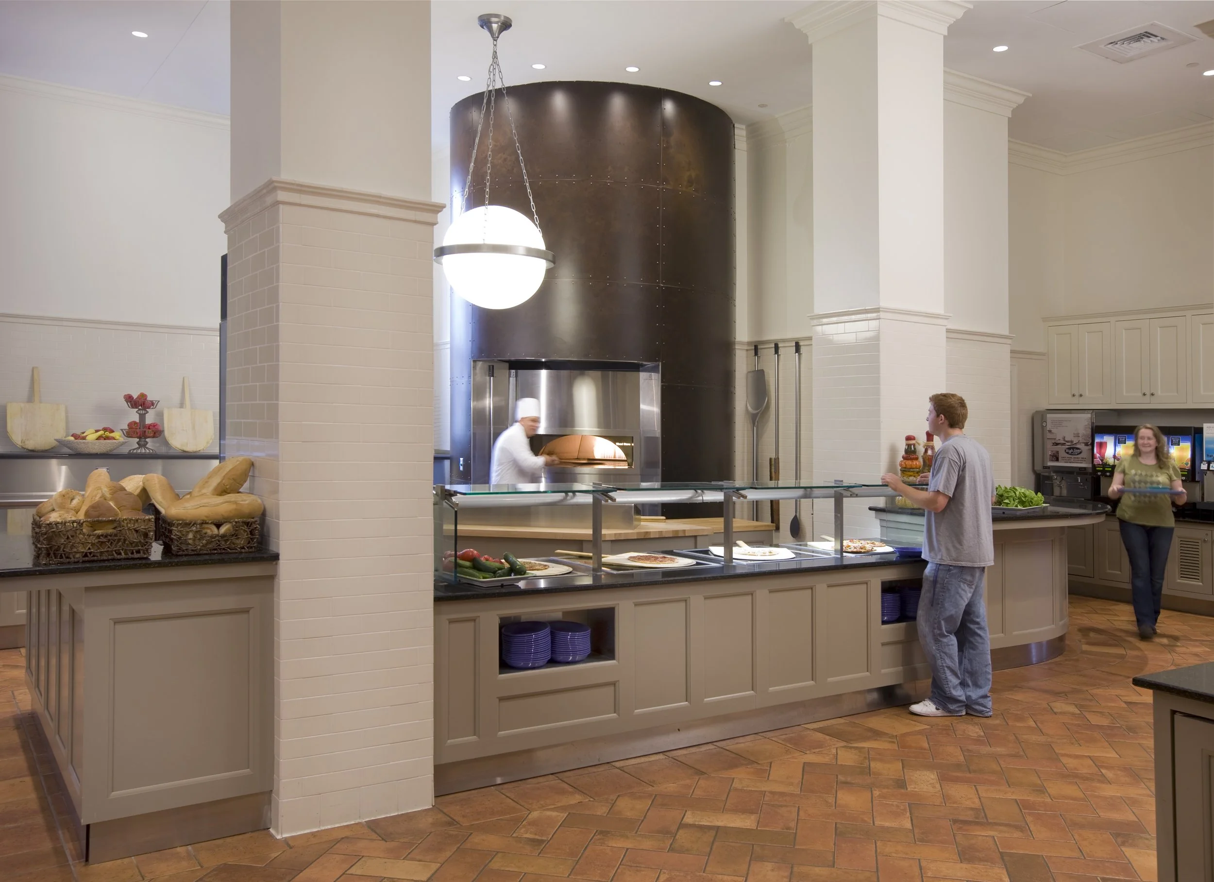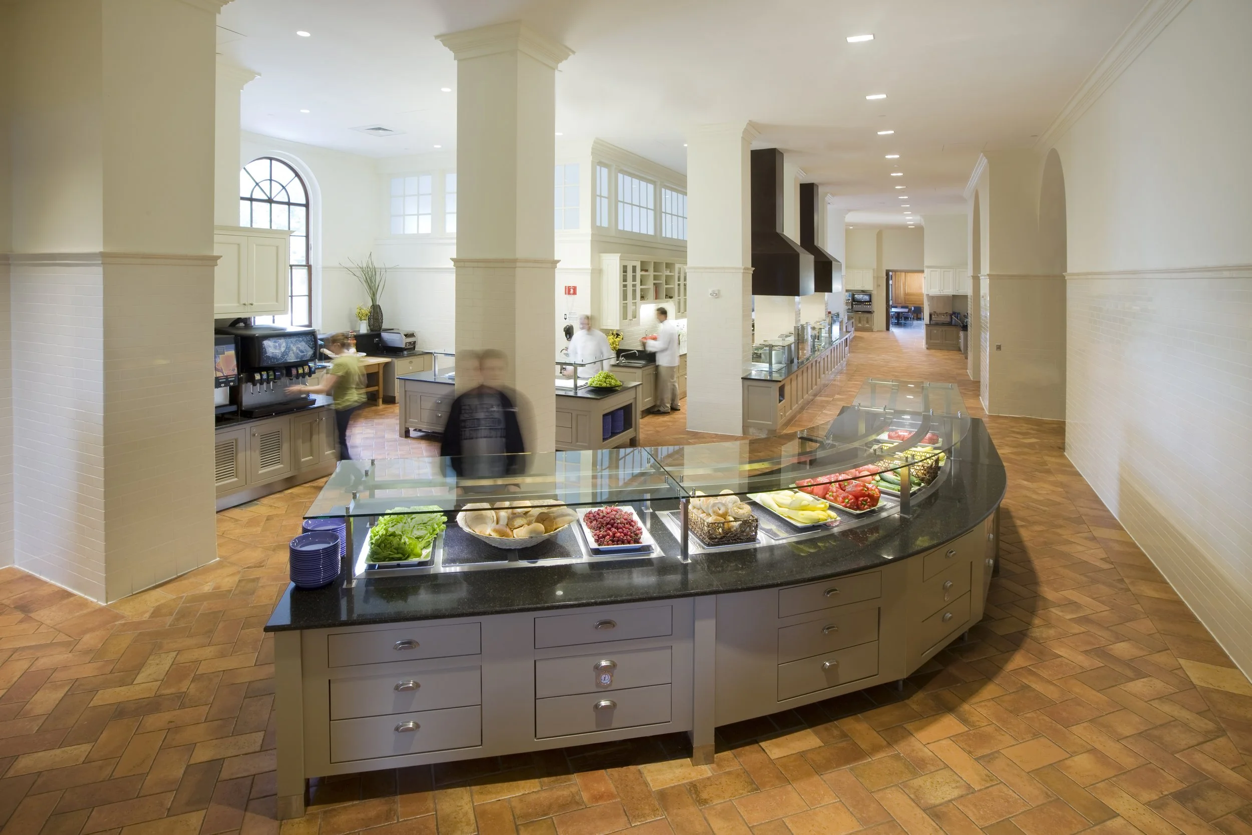 Paresky Commons is one of several monumental Colonial Revival buildings designed for Phillips Academy by the New York architect Charles Platt in the 1920s. In its original design, students entered the building through a central lobby and proceeded directly to the four dining rooms at each end of the first and second floors. Food was sent by dumbwaiters to central serving rooms for waiters to deliver. In the new dining system, students enter the kitchen areas, serve themselves, and then move to the dining rooms. At the basement level, the original student grille, known as the Ryley Room, has been renovated as a space for student socializing, performances and parties, with outdoor breakout spaces, and an entrance at a new terrace along the building foundation. A new stair leads to a student lounge and cafe, while the historic stone stair was extended to the lower level. The restored exterior includes a new plaza for students to gather.