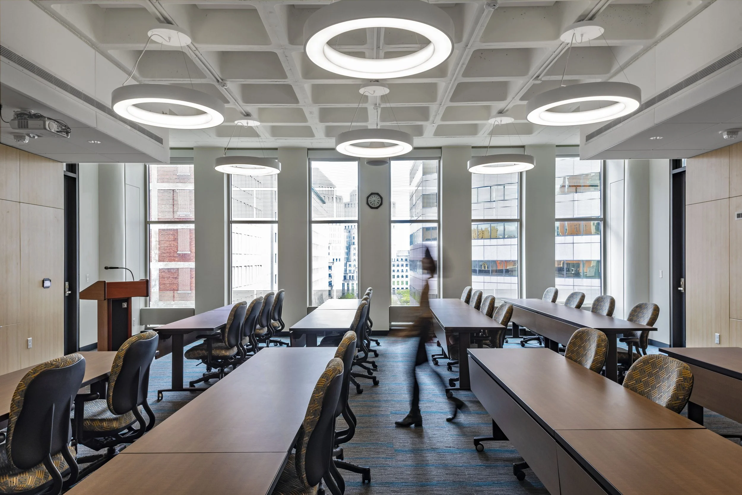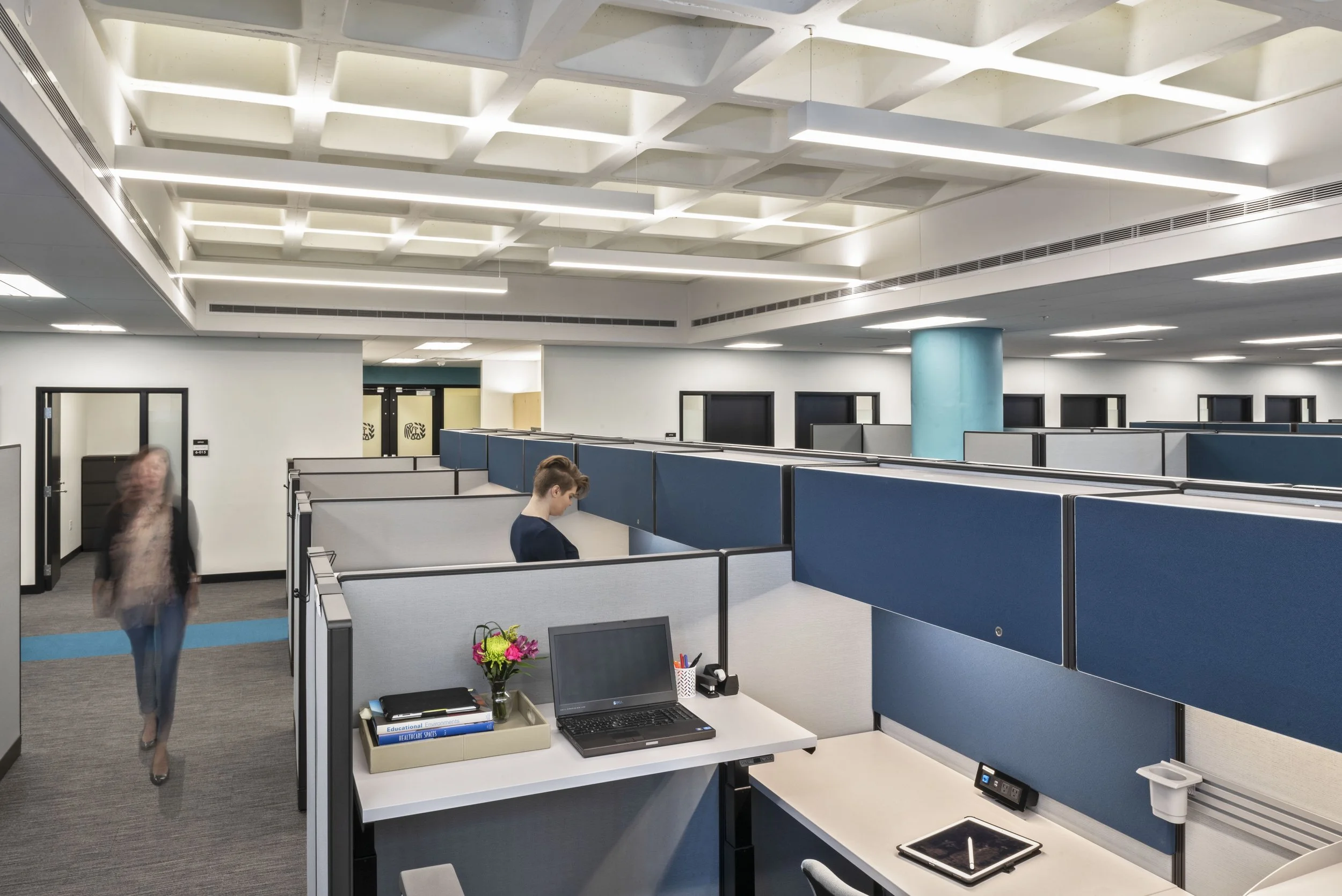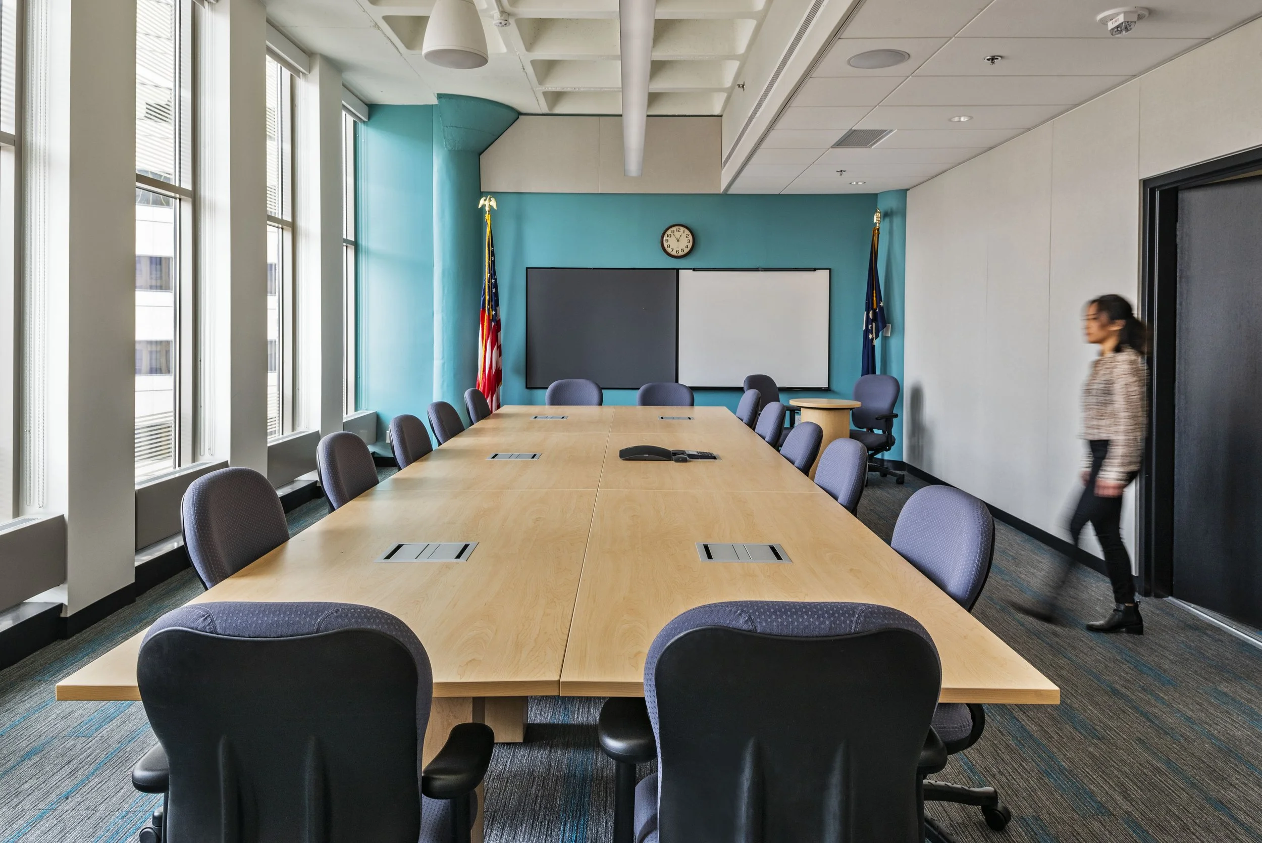 Schwartz/Silver raised the ceiling at the perimeter and exposed the waffle slab, taking advantage of high windows to bring daylight deeper into the building. Planning standards were developed to complement the existing facility, including open offices organized at the windows, with private offices utilizing borrowed light, concentrating daylight and views where people work. Shared amenities, including conference rooms, huddle rooms, and work rooms, are along circulation routes and are used to divide the plan into neighborhoods, creating identity spaces for agencies on each floor.