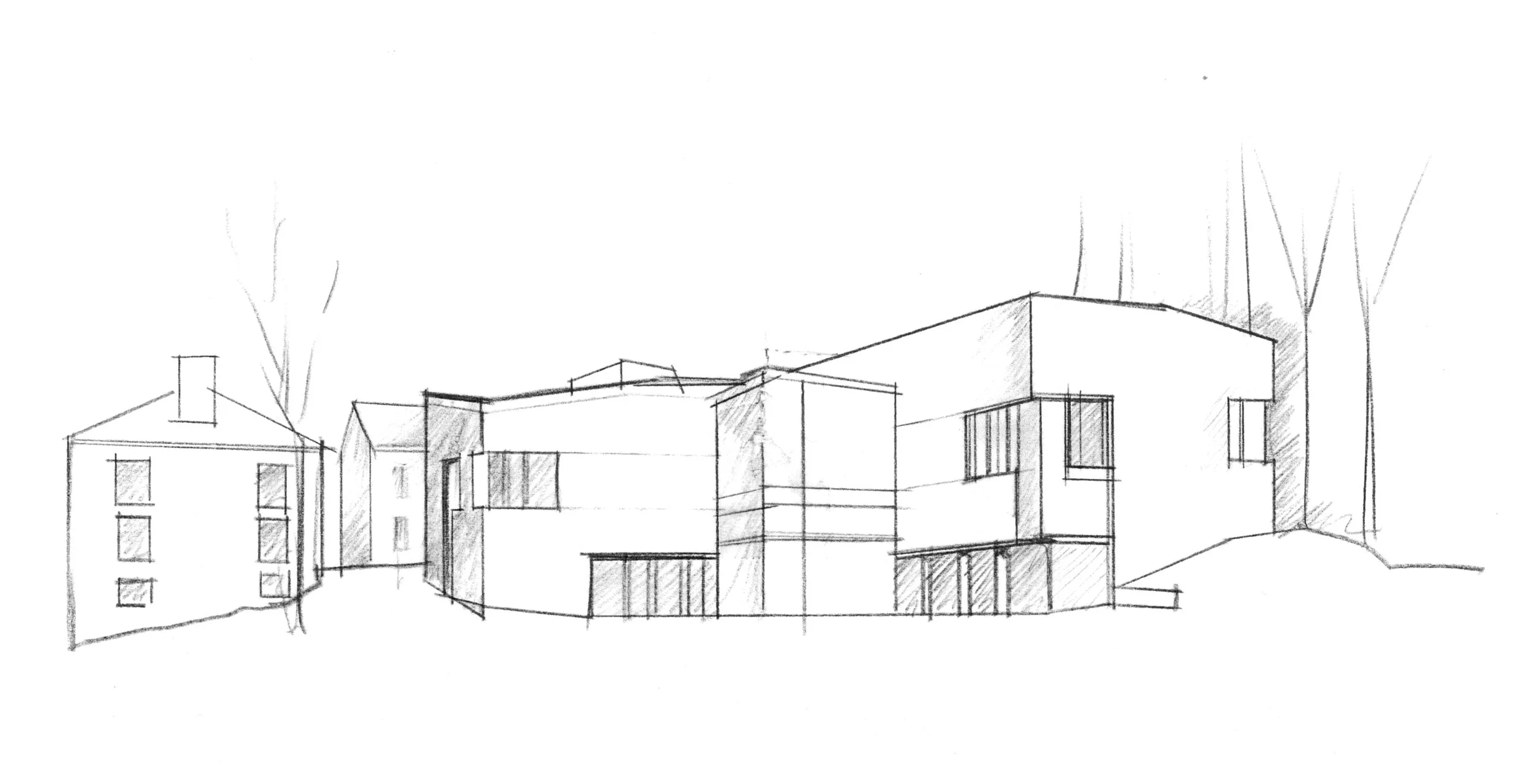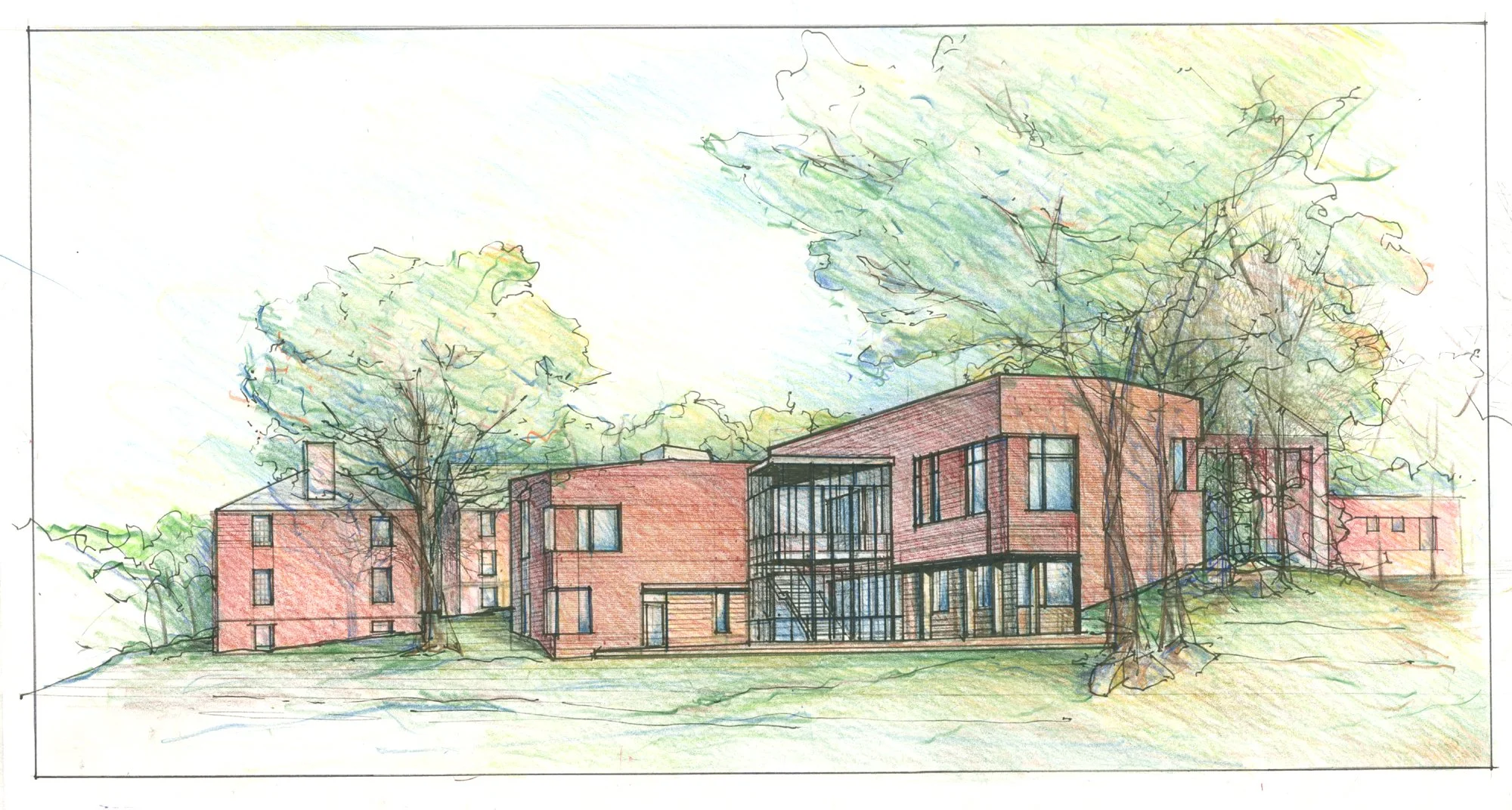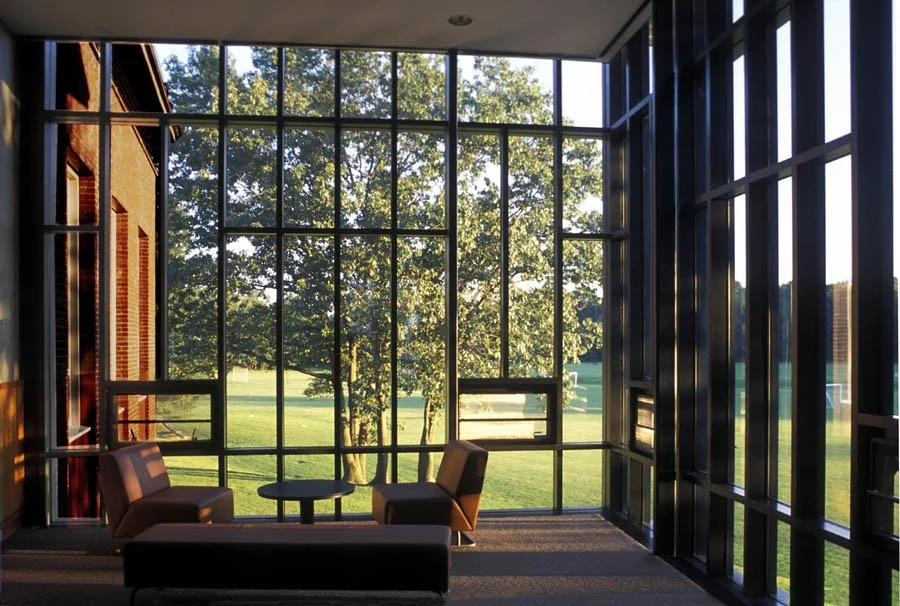 The Prenatt Music Center is the first in a series of new facilities for the arts at this private boys’ school. Its siting organizes two disparate parts of the campus. On one side, its wings reach out to the school’s athletic fields. On the other, it defines the edges of the main campus quadrangle and a future Arts Quad. At the building’s center a glass pavilion organizes the interior spaces and can serve as a venue for school events.