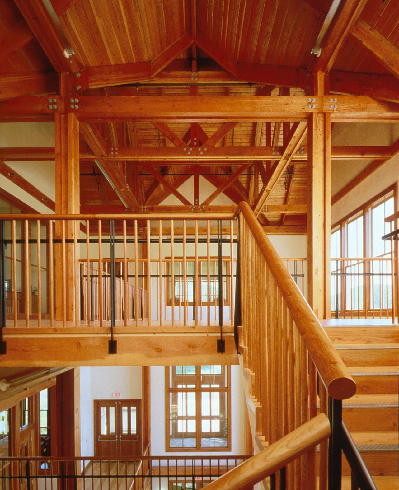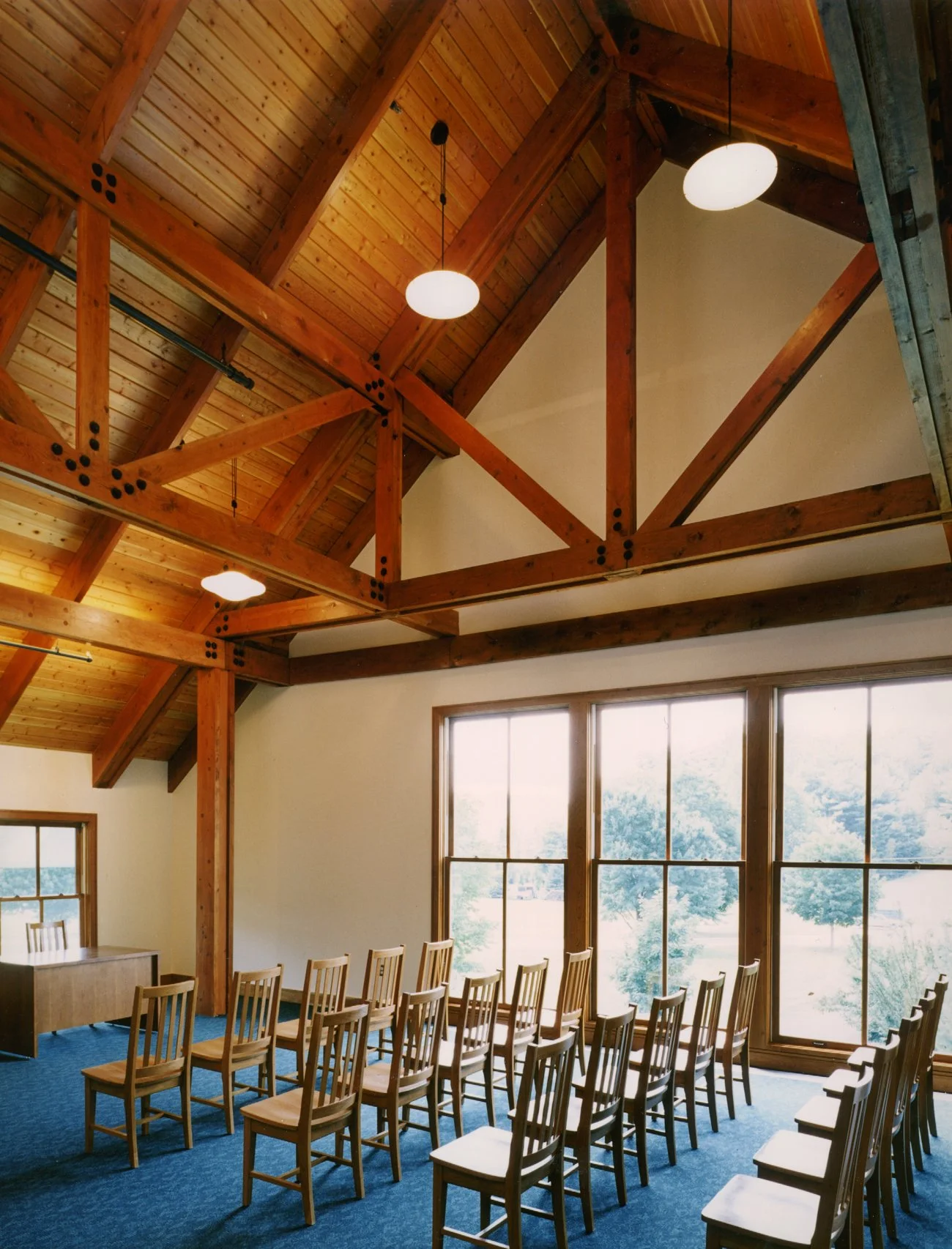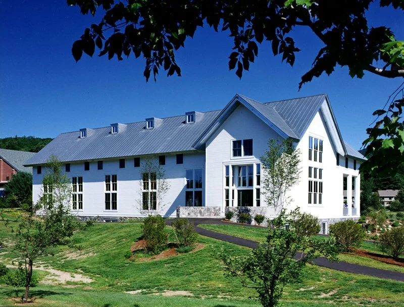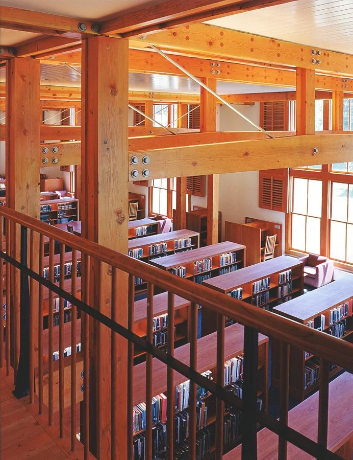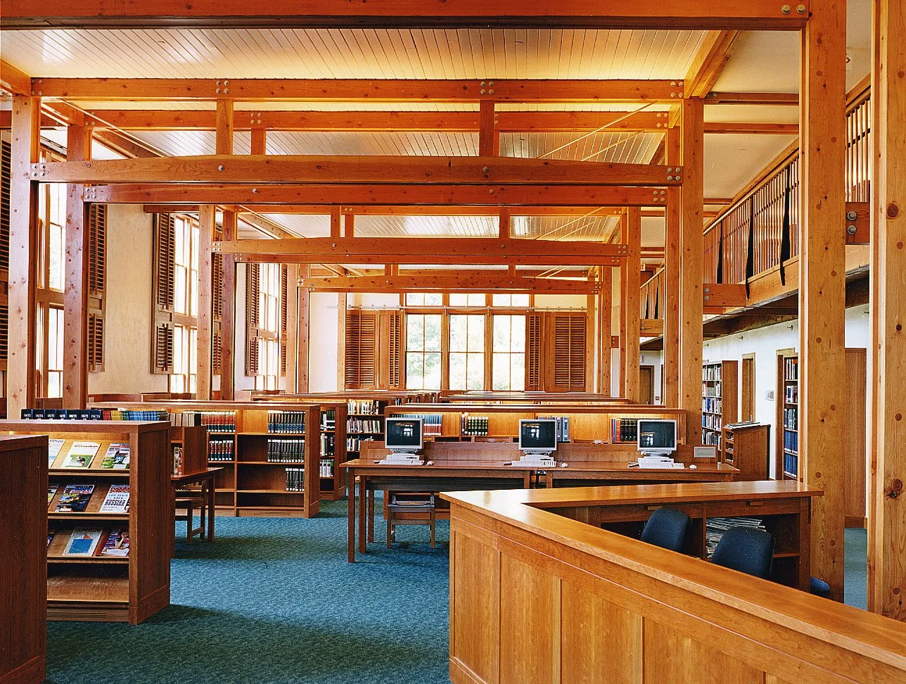 Proctor Academy is situated in a New England village with informally arranged white clapboard buildings. The exterior of the new learning center is modern in style, yet its massing, clapboard exterior, timber frame structure and window details are appropriate to its rural context. The interior space of the library is modeled after a New England meeting house, as a high-ceilinged single volume. The program includes 30,000 square feet of library space, a computer center, classrooms, and tutorial rooms.