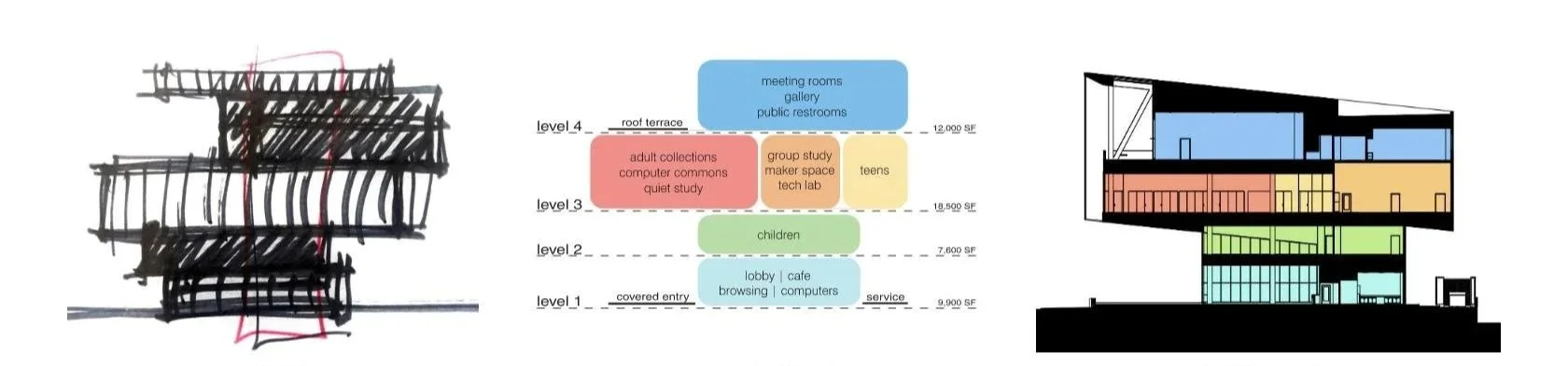 The project responds to the local climate with a shaded public plaza, trellised roof terrace, and sculptural sunshade ribbons on the south, east and west windows. The library has dedicated floors for Children, Adults and Teens, and this stacking of major program elements allows a direct visual link to the Mississippi River from the upper levels.