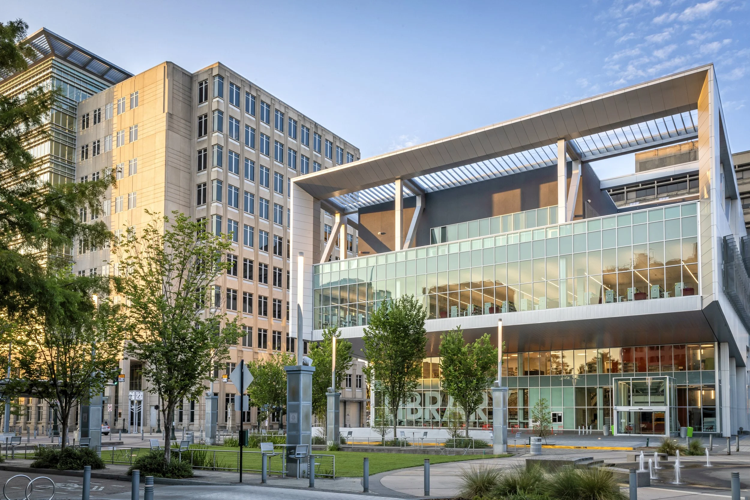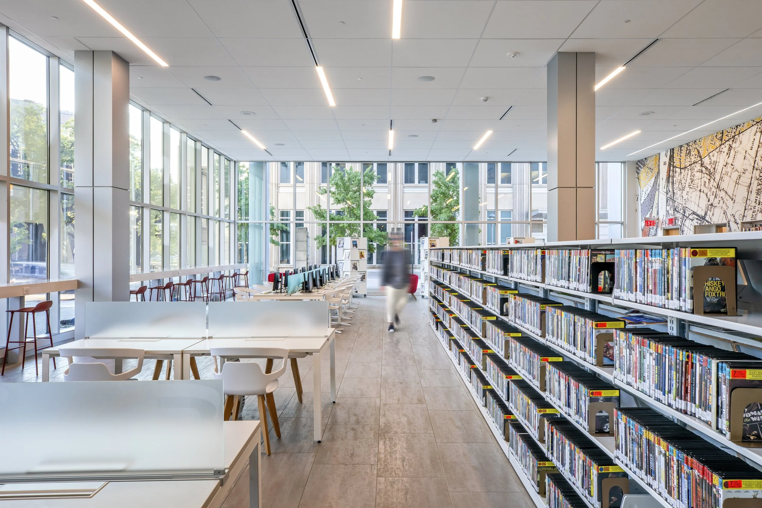 Two years after the completion of the Shaw Center for the Arts, the City of Baton Rouge engaged us to design a new downtown branch library. Located one block from the Shaw, the River Center Library creates a new model for library services for the City. In addition to traditional collections, it provides meeting rooms for community programming, outreach and creative collaboration; themed media walls, art walls, interactive kiosks, and conference rooms equipped with remote distance learning technology; a café; media/tech lab; business pods; a foundation and grants center; a maker room; a dedicated teen programming/gaming space, and a recording studio.