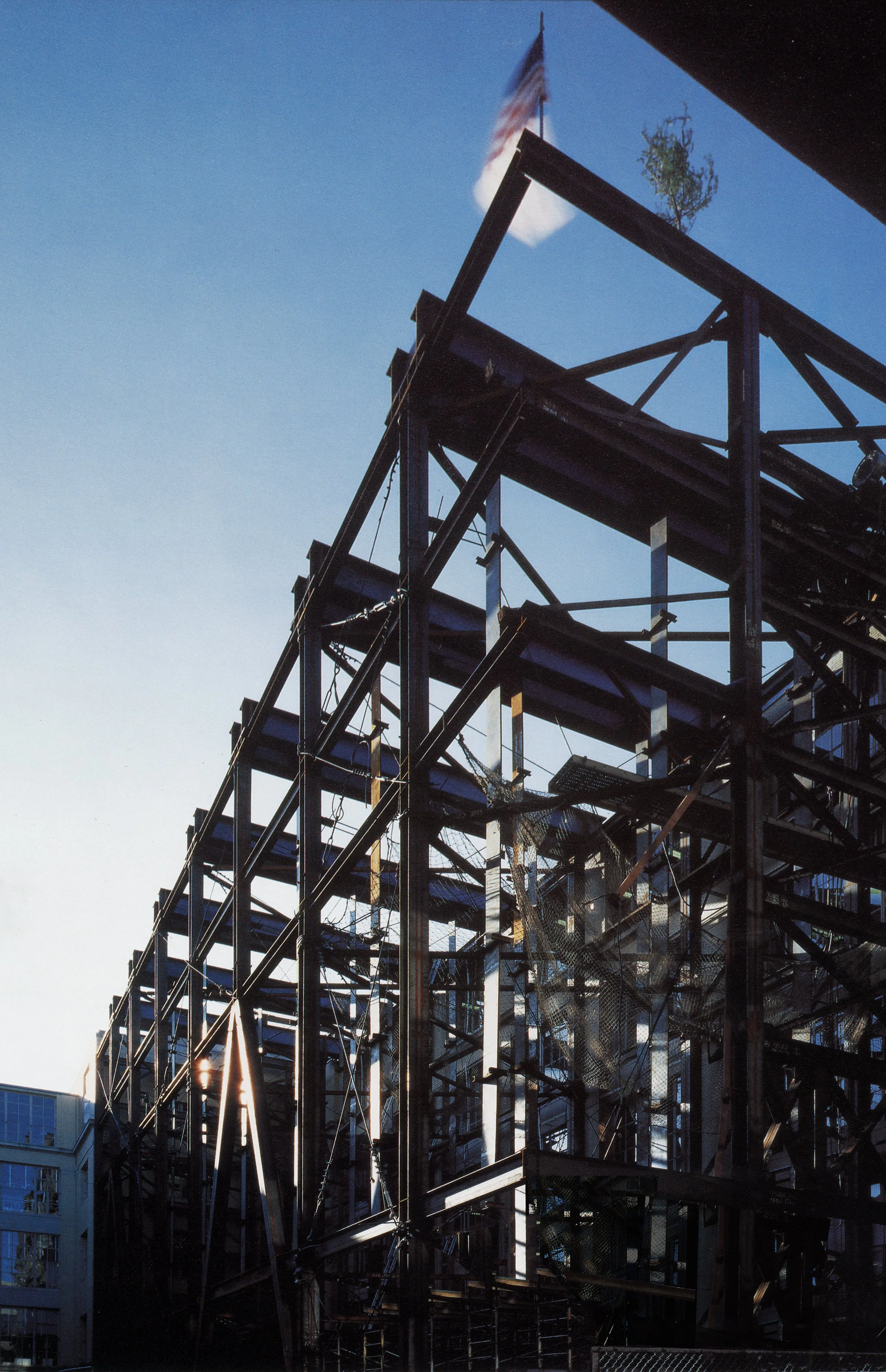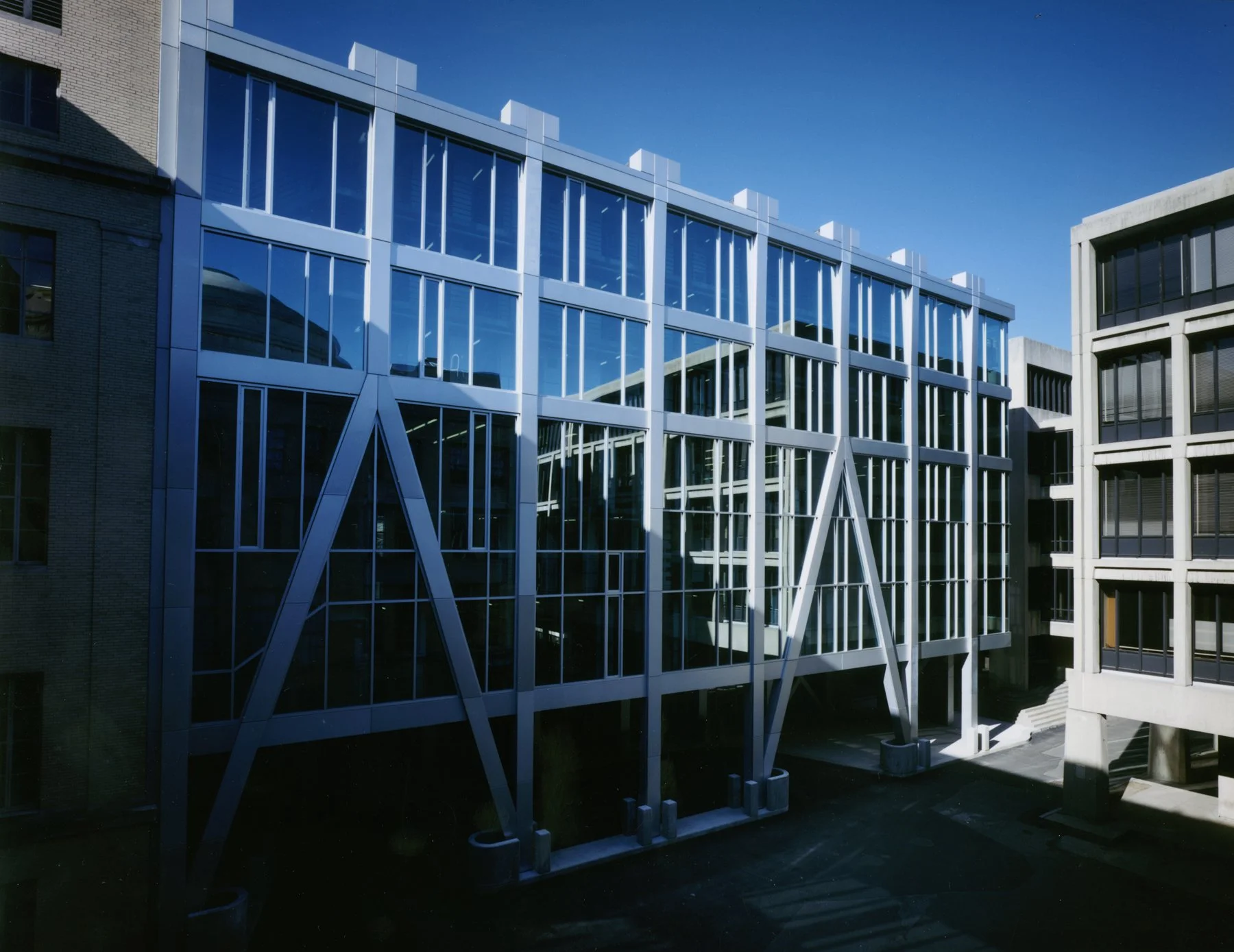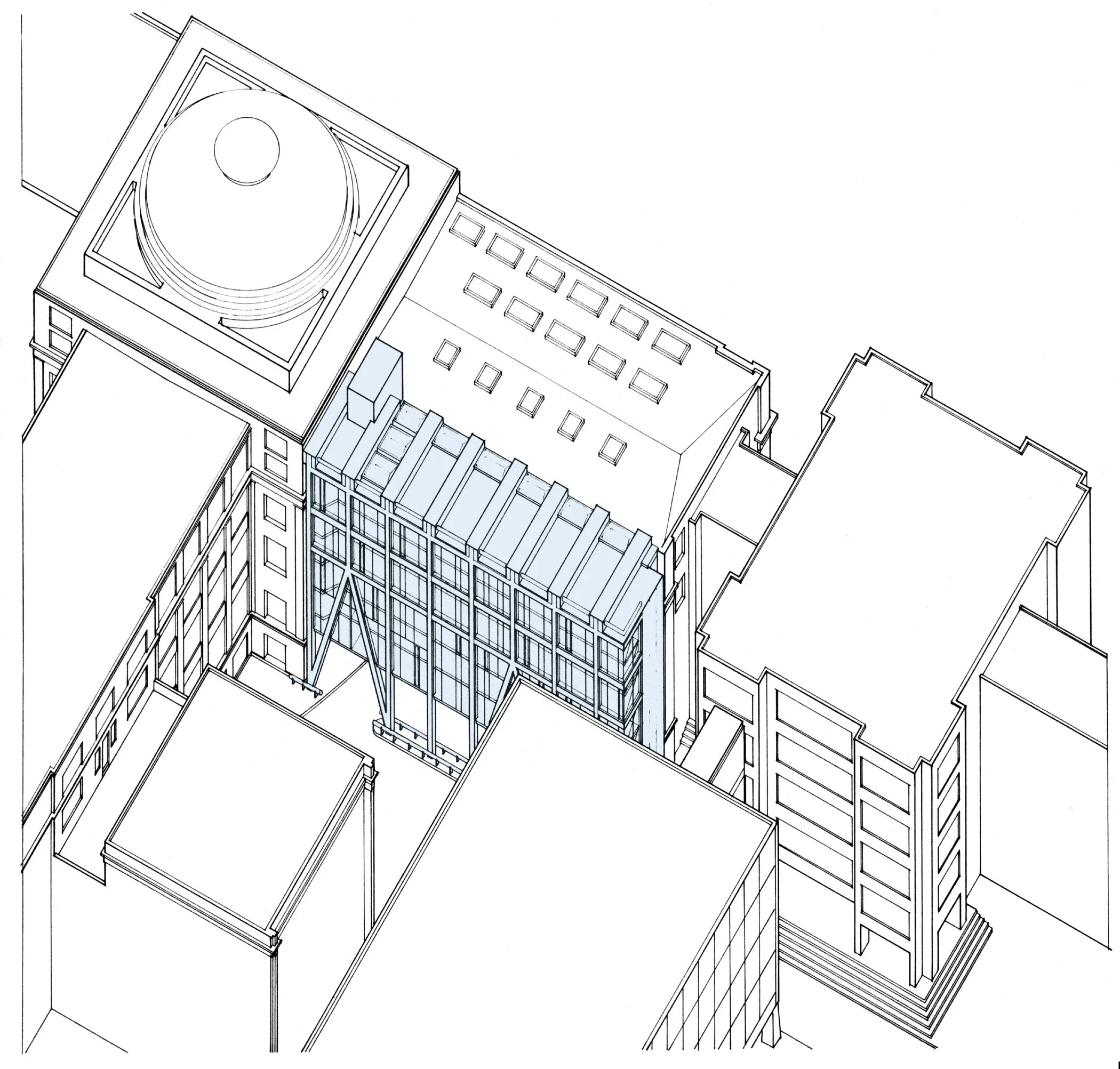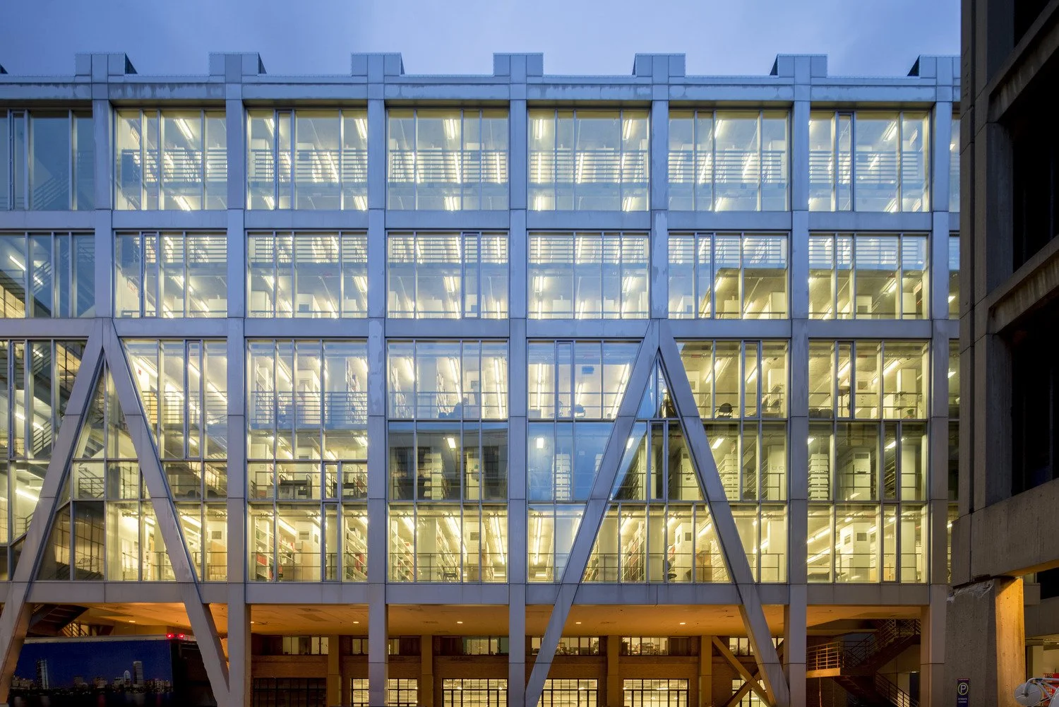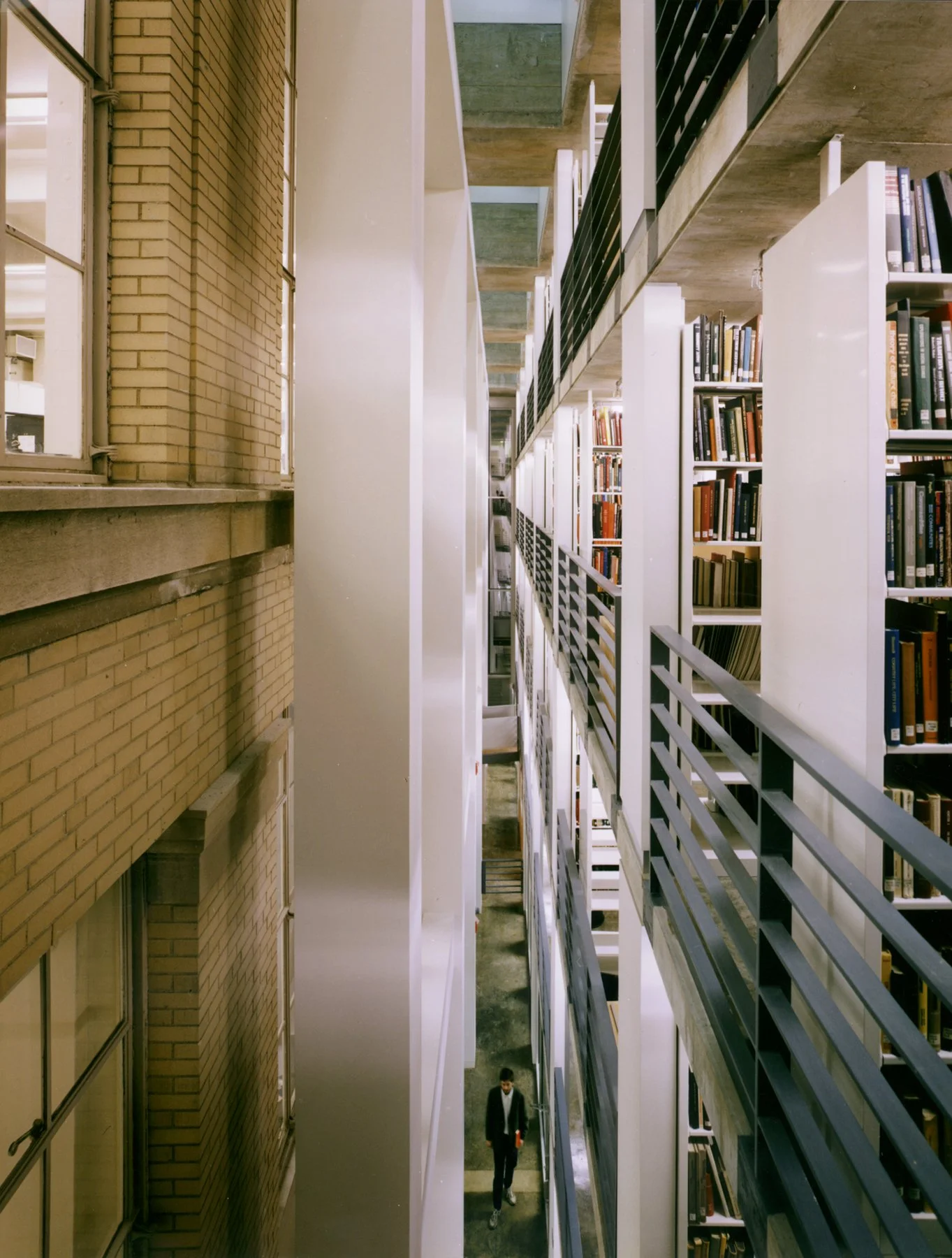 The Rotch Library, MIT’s library of architecture and planning, is located at MIT’s Building 7, next to the institution’s main entry on Massachusetts Avenue. The site for the Rotch’s new stack wing is a courtyard, used by MIT for deliveries. Preservation of the truck loading area meant that at the bottom the addition had to be raised to provide 14 feet of vehicular clearance. At the top, the height could not exceed the base of the neighboring historic dome. Given these constraints, the available floor-to-floor height for the stacks was limited to 8’-8”. Spaces which required higher ceiling heights, notably the reading room and offices, are located within the renovated historic shell. Both the challenge of the limited floor heights, and the requirement to keep the addition underside clear for trucks, was addressed by hanging the floors from above, on ribbons of steel concealed within the shelving.