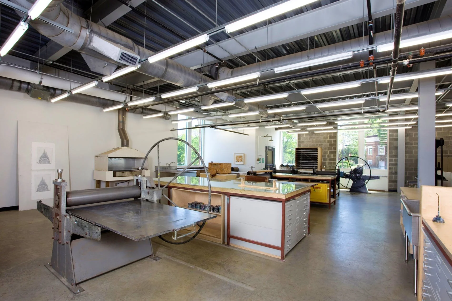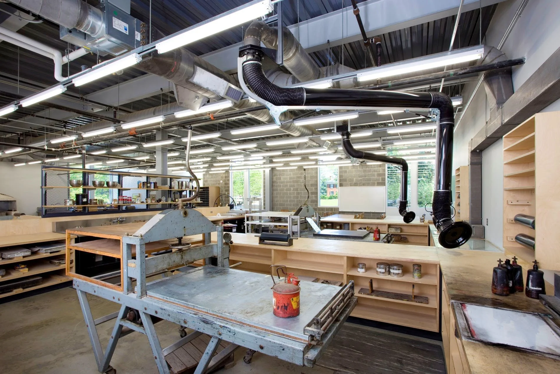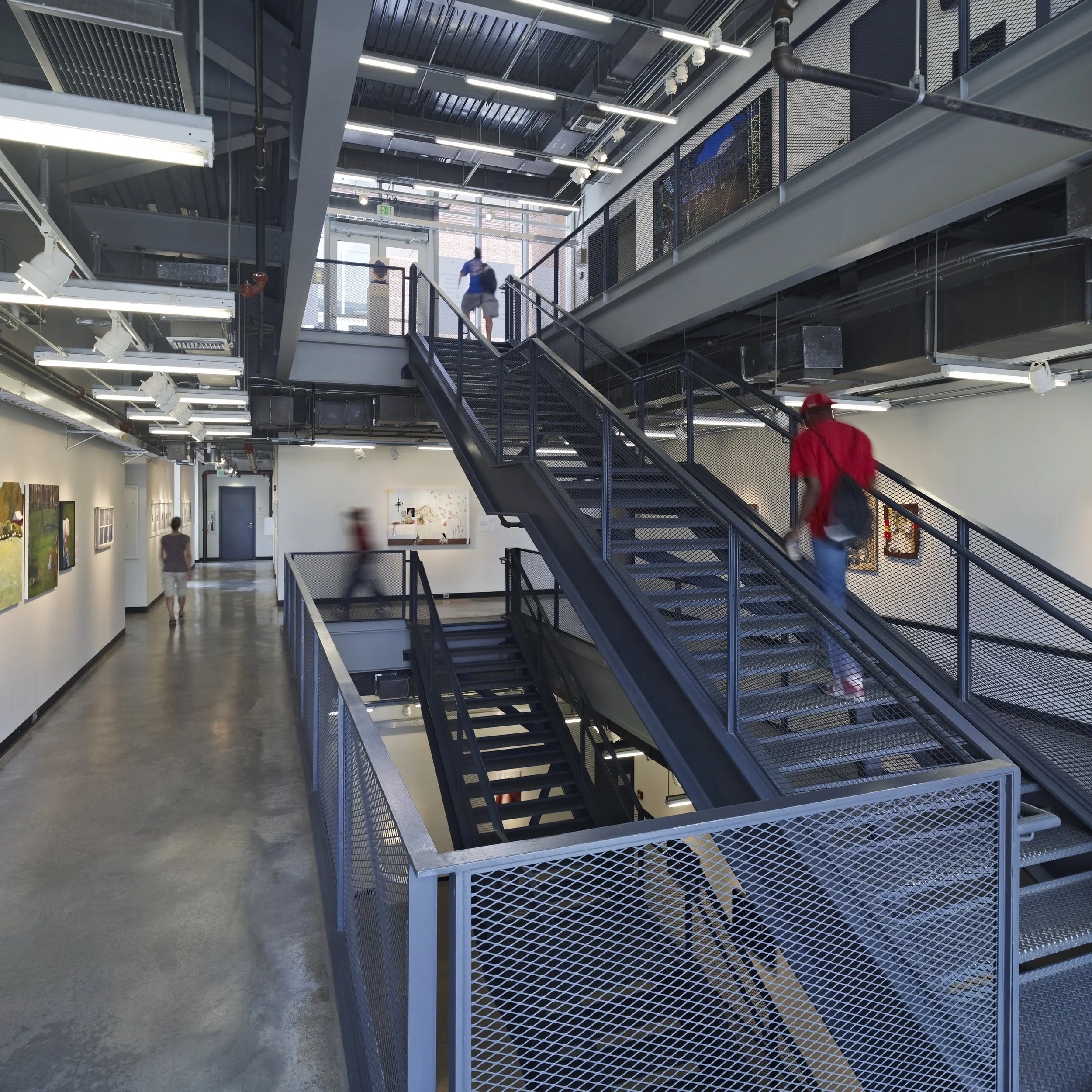The Ruffin Hall Studio Art Building is the first building of the University of Virginia's new Master Plan for the Arts Grounds. Conceived as a village of workshops, the three-level facility stands at the eastern edge of a green quadrangle defined by 1960’s arts buildings. The architecture of Ruffin acts as a transition between these larger-scale institutional buildings and the smaller scale of residences along Rugby Road, a major approach from Jefferson’s Rotunda. Ruffin contains painting, printmaking and drawing studios, digital and photography studios and labs, clay/plaster and metal sculpture studios, paper making, woodworking, a performance studio, and seminar rooms, faculty offices, and public and student galleries.