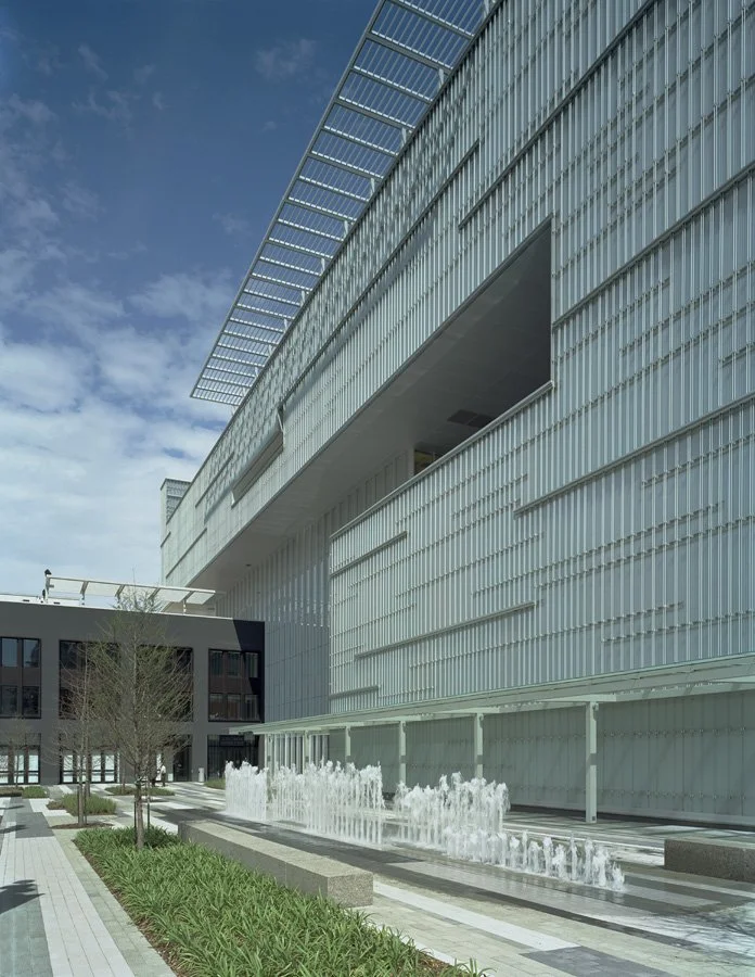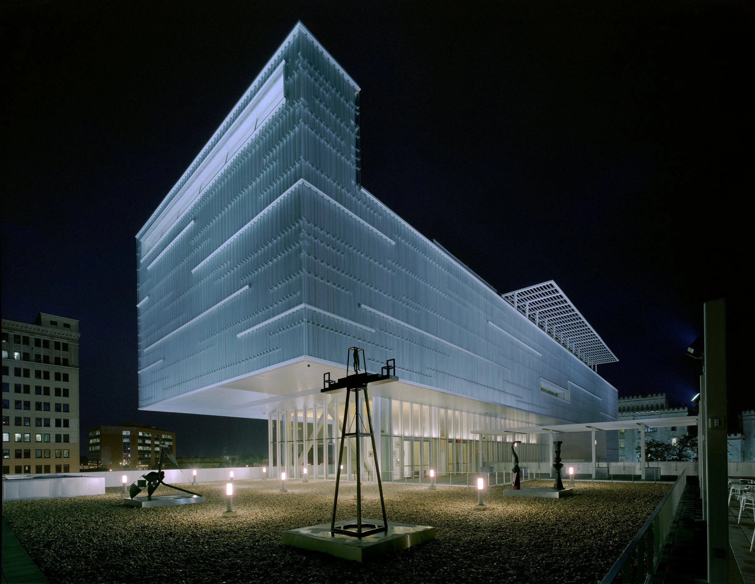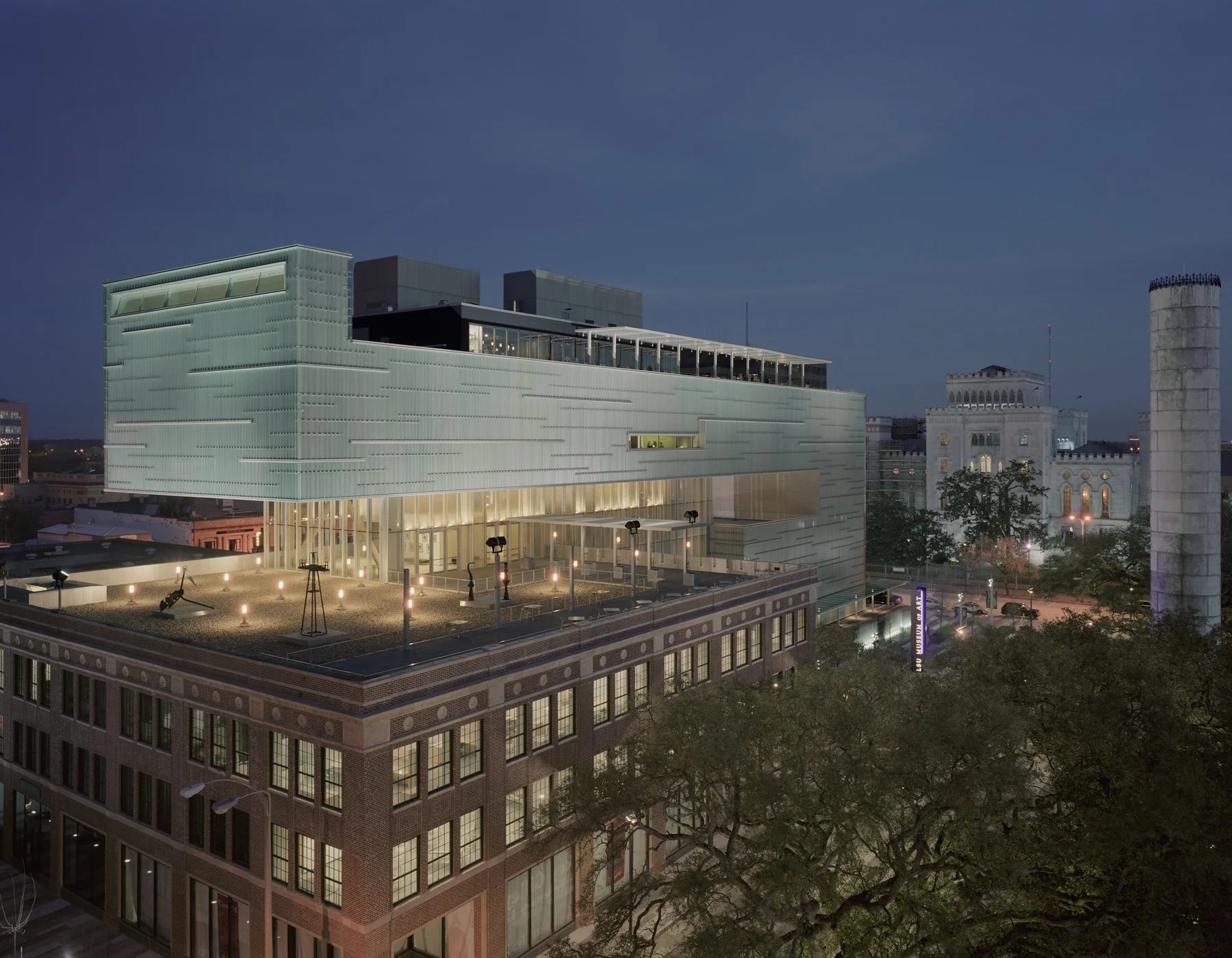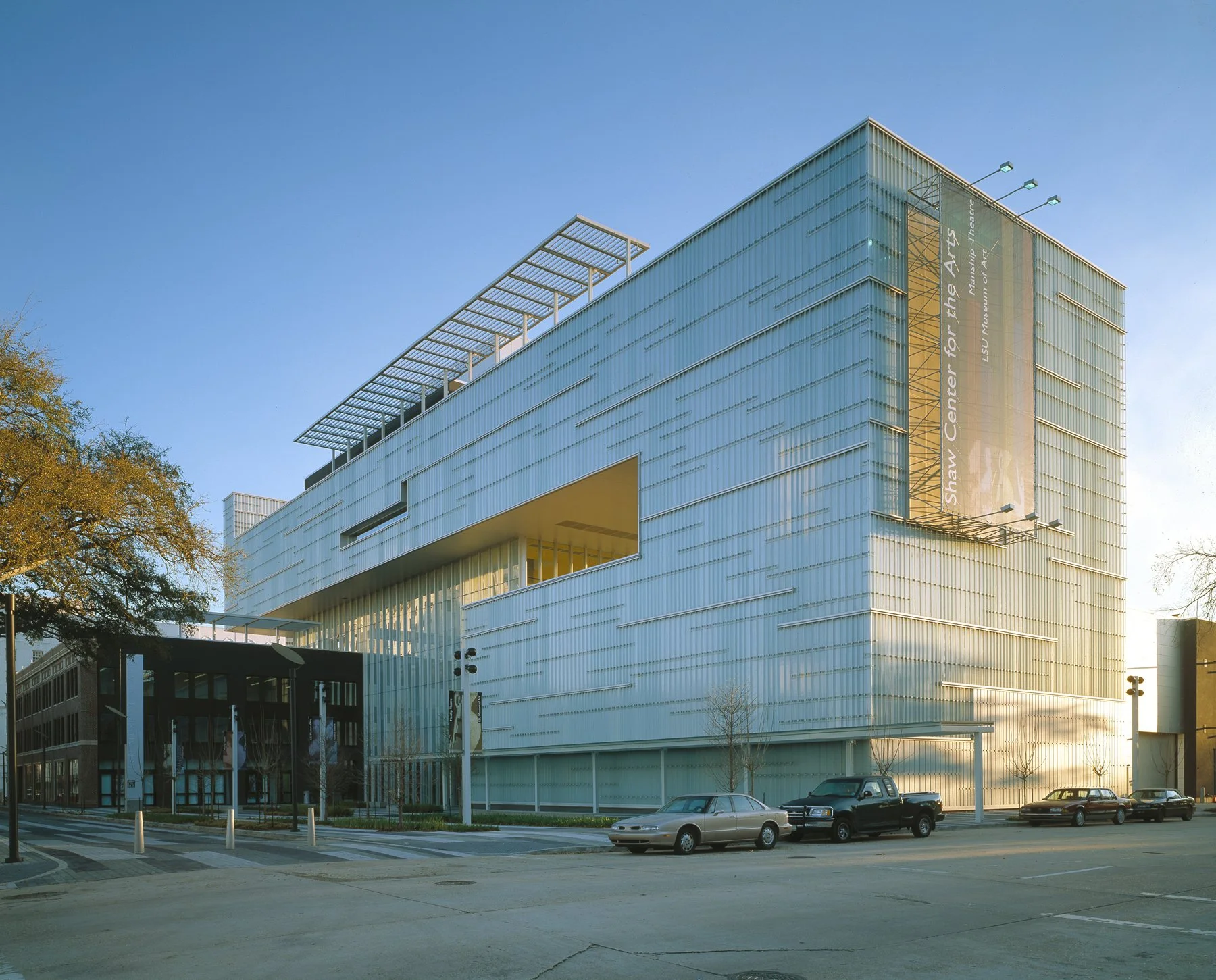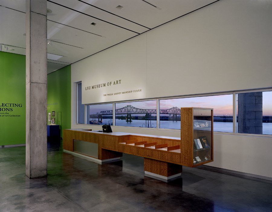 The Shaw Center for the Arts combines the Louisiana State University Museum of Art with spaces for LSU’s studio arts programs and an important regional center for the performing arts. The project is located on one and a half city blocks in downtown Baton Rouge, and incorporates an historic older building, the “Auto Hotel.” The primary public venues, the Museum of Art and the performing arts theaters, form a single structure that cantilevers over the Auto Hotel, which was rebuilt to house classrooms, art studios, curatorial spaces, and a Gallery for the LSU School of Art. The Shaw Center lobby, a 65-foot high space enclosed by glass, connects the three main elements of the project: the museum, the theater complex, and the studio and classroom spaces within the Auto Hotel. In 2018, the Shaw was named the best-designed museum in Louisiana by Architectural Digest.
