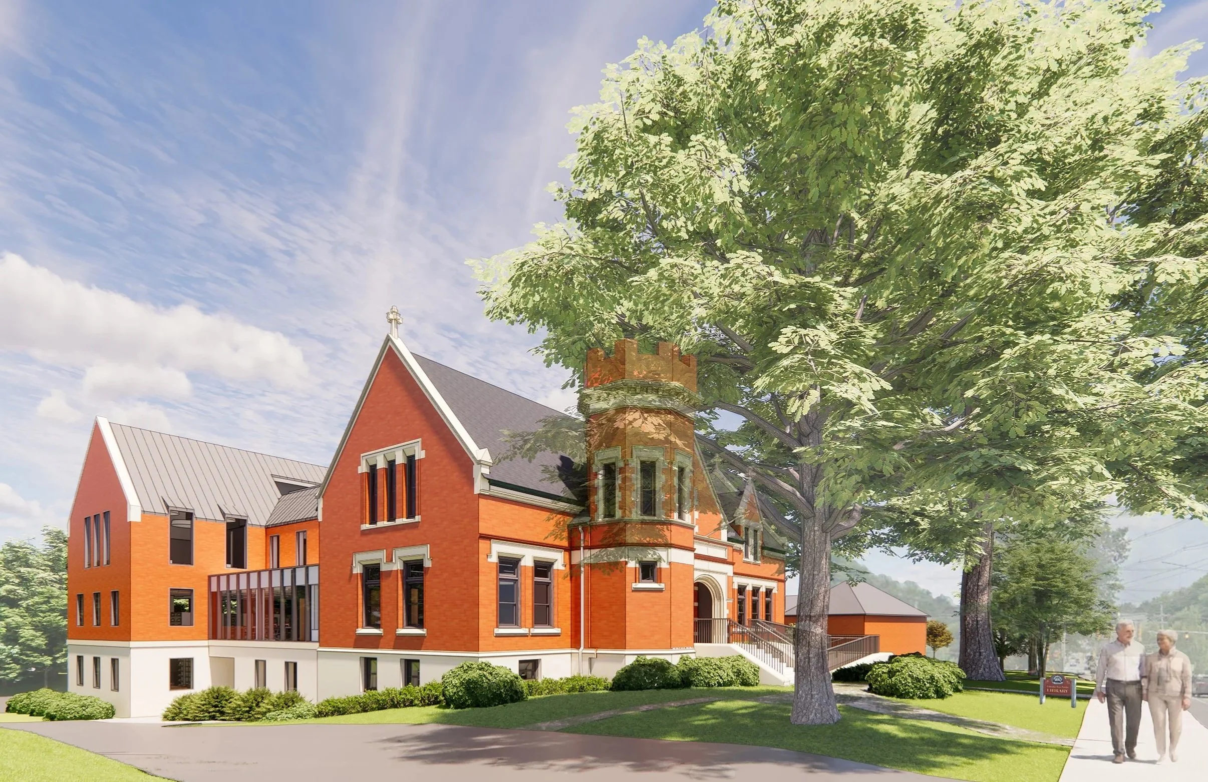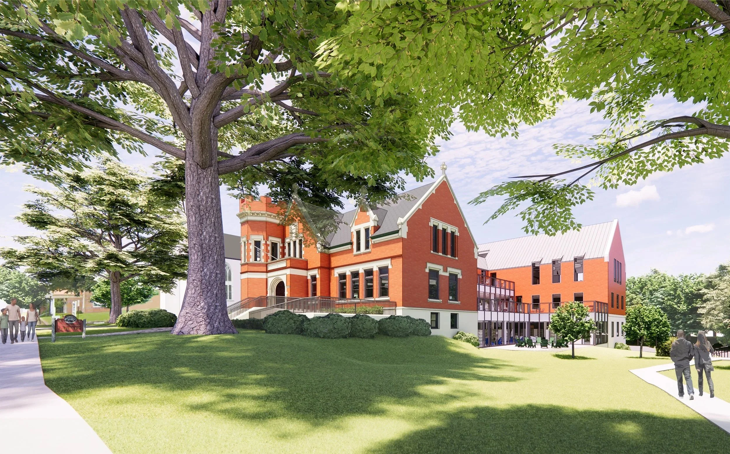 Defining historic features, such as the octagonal stair turret and interior hardwood millwork, will be retained. The addition draws inspiration from the historic library through its materials, window patterns, and gable roofs, and carefully connects to the historic structure at the rear with a stepped form that is differential to the 1875 structure. The historic entry will also be made accessible with a new ramp and stairs, and new entries from the read and side parking lots will also be provided.