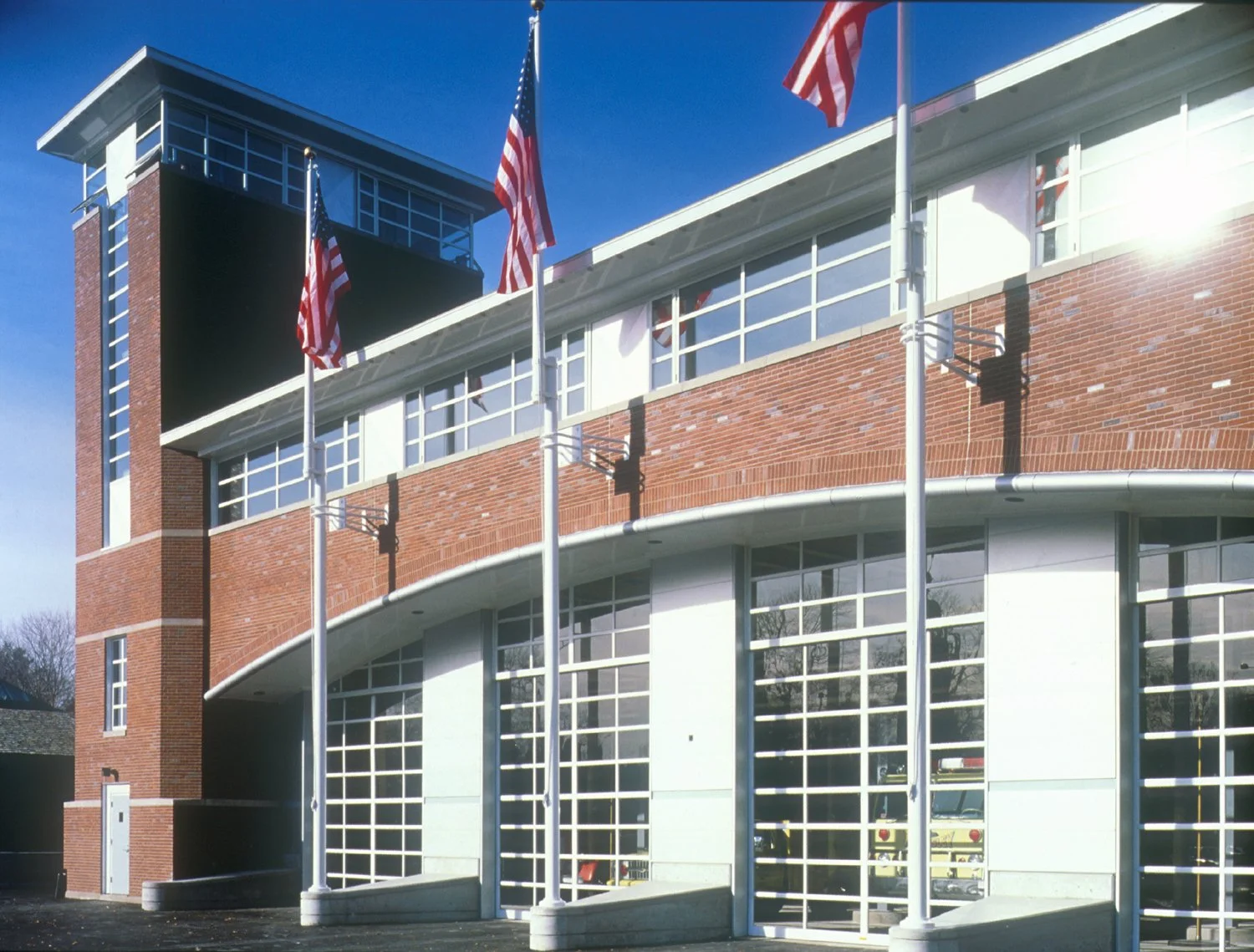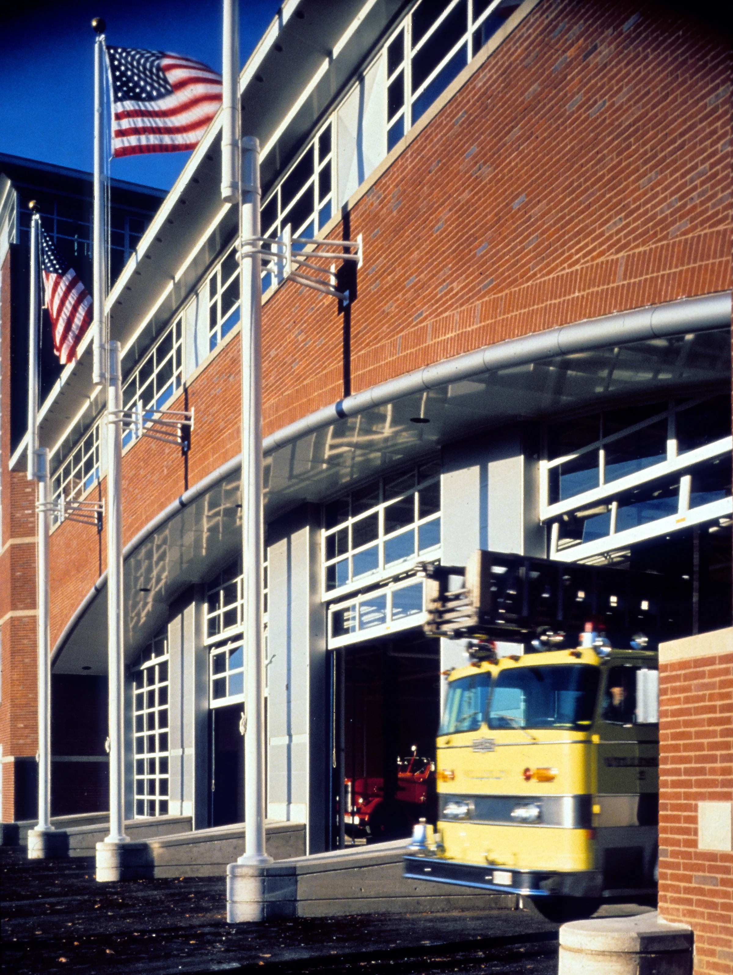 The site, adjacent to a busy highway and backed by railroad tracks, is visible from two sides only. The design approach was to look at the station as two buildings in one – an economical metal-clad apparatus block within the elbow of a more traditional-appearing, pitched-roofed brick building. The masonry structure arches over the glass and metal fire truck bays, recalling bridges along busy Route 9. In order to reduce the visual mass, the top floor has continuous windows. The corner of the building serves as both a hose-drying tower and exit stair. A fire escape at its rear is used for training. Together with a stone clock-tower across the busy road, similar in size and scale, the pair of towers form a suitable civic entrance to the town.