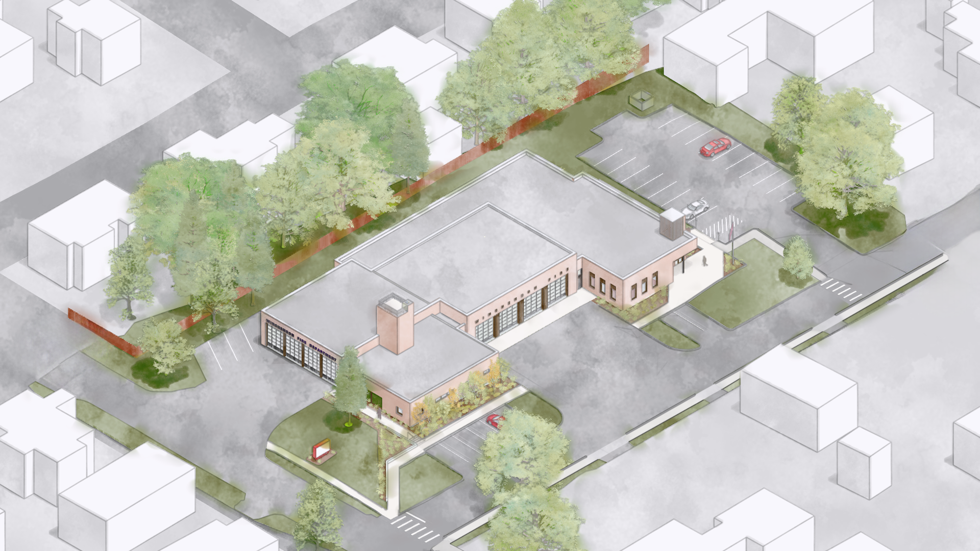 The proposed design features full-size apparatus bays flanked by an administration wing with firefighter living quarters on one side and the existing fire station on the other. This layout establishes a critical connection between the new and the existing bays. The new public entrance is marked by a wood-fin tower, which, when illuminated from within, serves as a welcoming beacon for visitors in need of assistance. Both the new and existing fire station structures are clad in a vertical wood rainscreen, naturally treated to eliminate maintenance requirements. This exterior cladding enhances protection and insulation while creating a consistent visual relationship between the original and expanded structures that complements the character of the neighborhood.